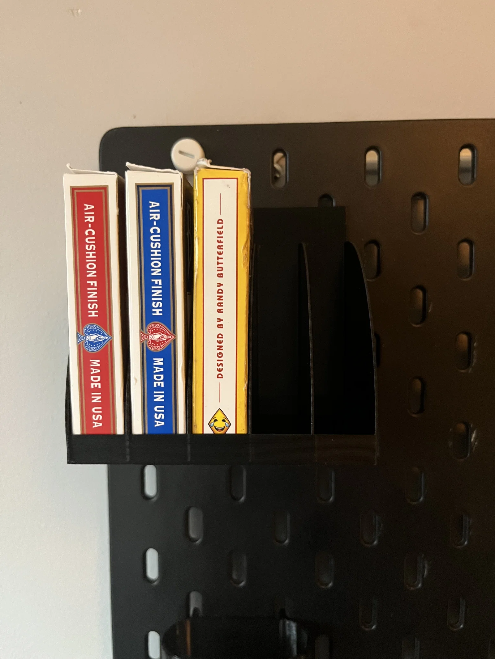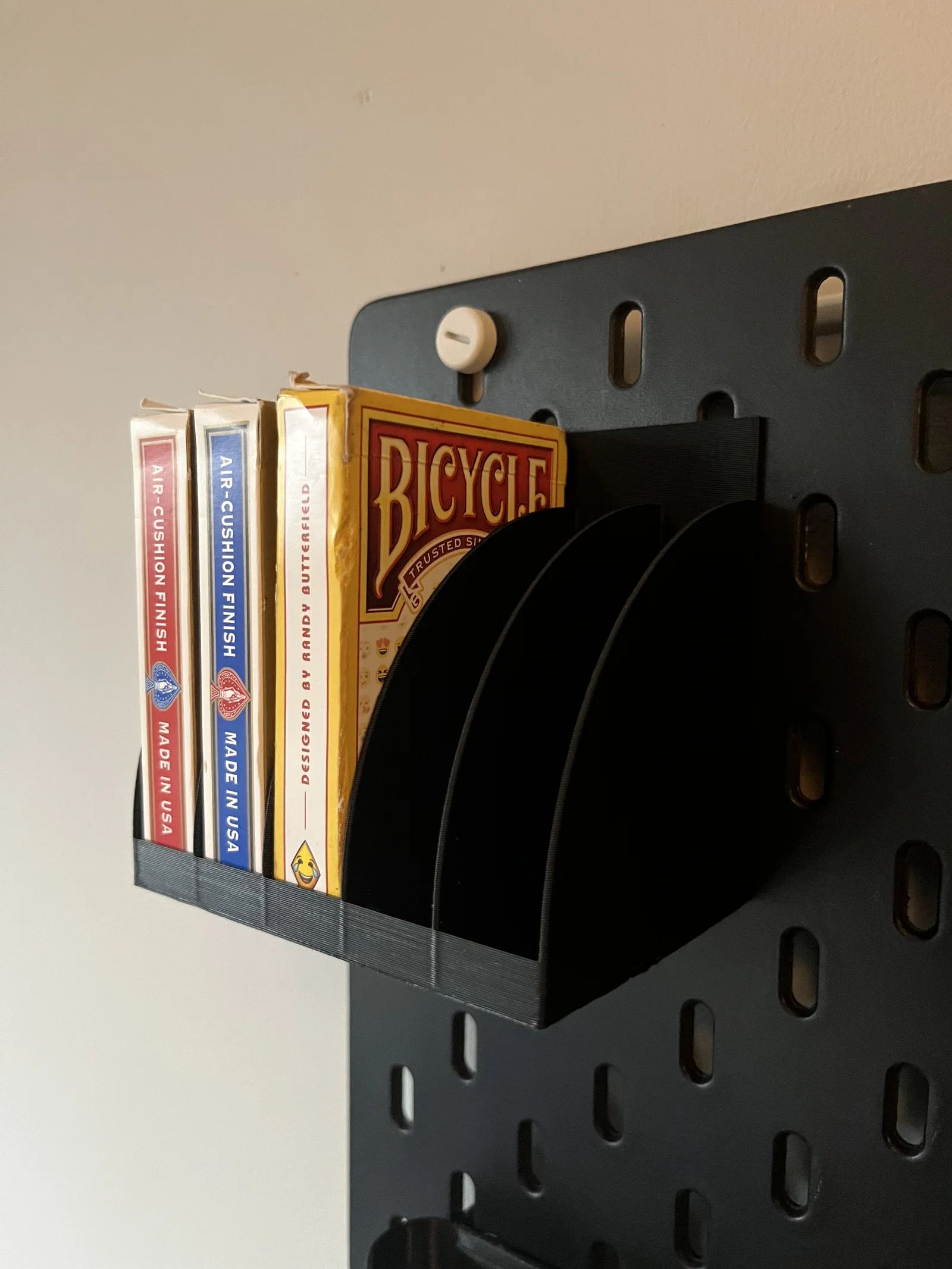 Một bản remix đơn giản từ giá treo bộ bài Skådis gốc, được tinh chỉnh lại để chứa gọn gàng 5 bộ bài thay vì 10. Móc treo đã được căn chỉnh lại cho cân đối hơn. Phù hợp cho những ai muốn sắp xếp bộ bài Bicycle của mình trên bảng treo tường IKEA Skådis.