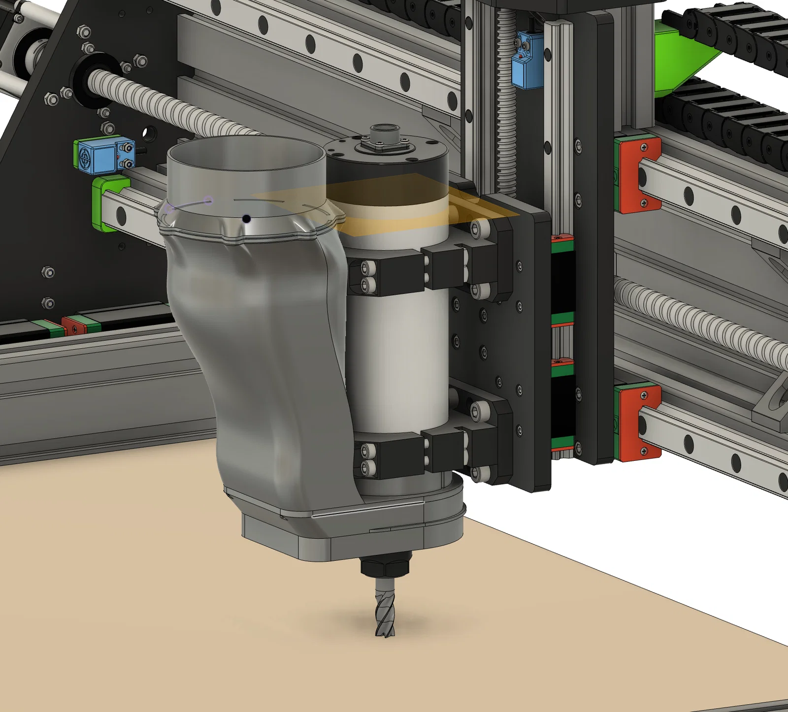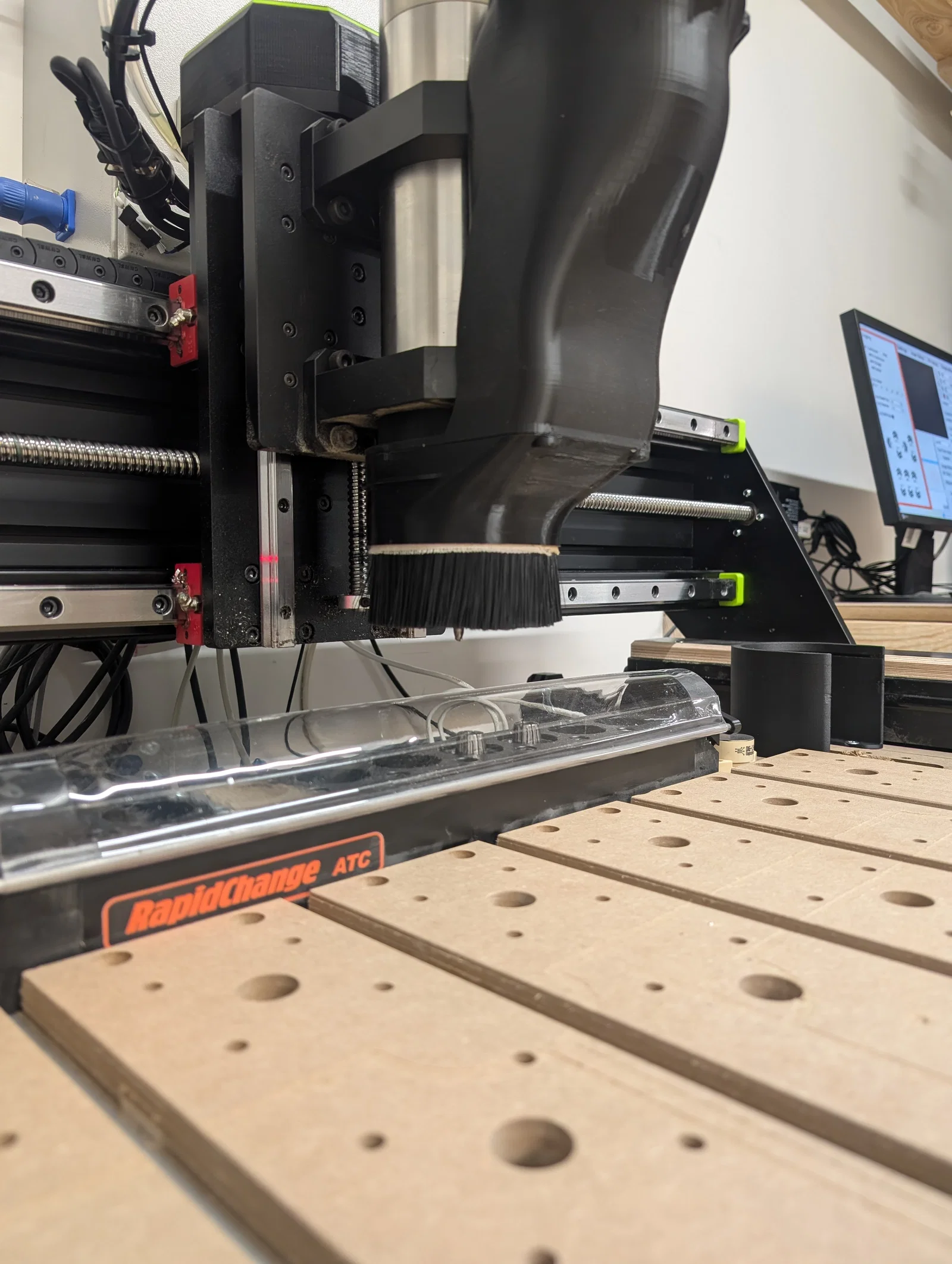 Tôi không hài lòng với bất kỳ mẫu Dustboot nào hiện có cho RR Stronghold Pro. Ngoài ra, tôi đã sử dụng Rapidchange Toolchanger Magazine được một thời gian và muốn máy có thể tự động tháo lắp đầu hút bụi để việc thay đổi công cụ diễn ra trơn tru. Vì vậy, tôi đã thiết kế thêm một giá đỡ gắn vào bàn máy.