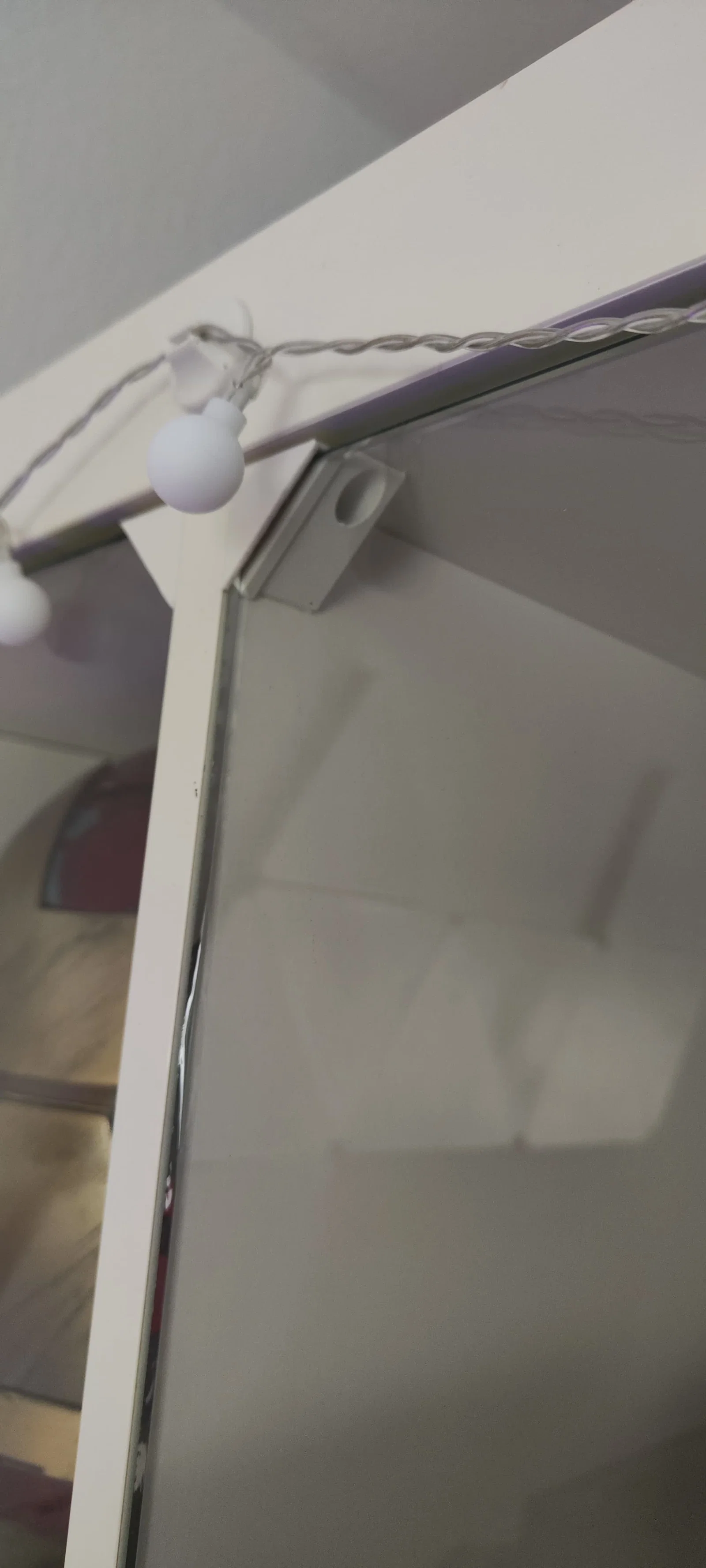 - Trước khi bắt vít, hãy lắp thử kính vào để kiểm tra khoảng cách. Hãy chắc chắn rằng tất cả các nam châm đều nằm phẳng đều; nếu không, hãy căn chỉnh lại phần góc nối. Sau đó, cố định góc nối vào Kallax bằng vít đầu bằng 12mm.