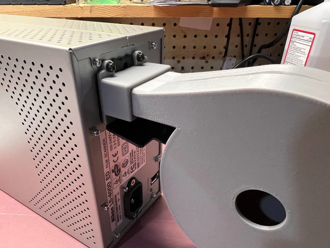 Cải tiến đầu tiên là phần giá đỡ cho cuộn phim phía sau, được vặn trực tiếp vào mặt sau của máy quét. Mình làm cái này vì nó cứ bị rơi ra khỏi máy hoài, dùng cách này chắc chắn hơn hẳn so với việc dán băng keo. Đi kèm là một vòng đệm (washer) nhựa nhỏ; bạn cần in 2 cái để làm miếng đệm khi lắp giá đỡ. Chúng sẽ được đặt vào các ốc vít phía sau, nằm giữa giá đỡ và thân máy quét. Cuộn phim sẽ trượt vào giá đỡ này và tự giữ cố định nhờ lực ma sát. Nếu muốn chắc chắn hơn, bạn cũng có thể dán keo.