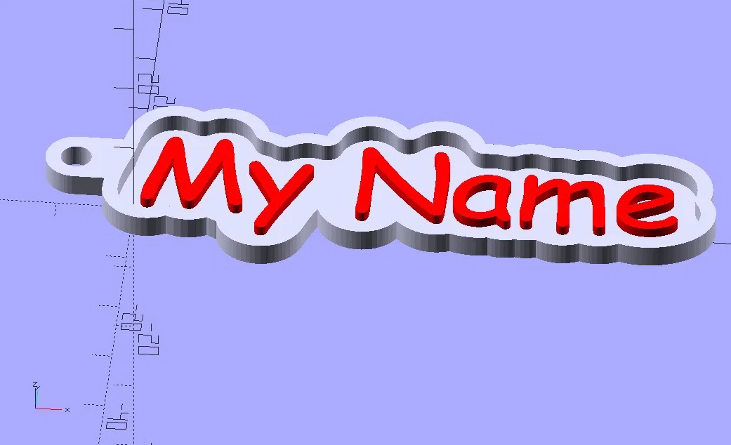 Tự thiết kế móc khóa độc đáo với OpenSCAD. Mẫu móc khóa này có hình dáng tự động điều chỉnh theo phông chữ, hỗ trợ thay đổi màu sắc linh hoạt ở các lớp cuối, giúp tạo ra những chiếc móc khóa cá nhân hóa cực kỳ chuyên nghiệp và đẹp mắt.