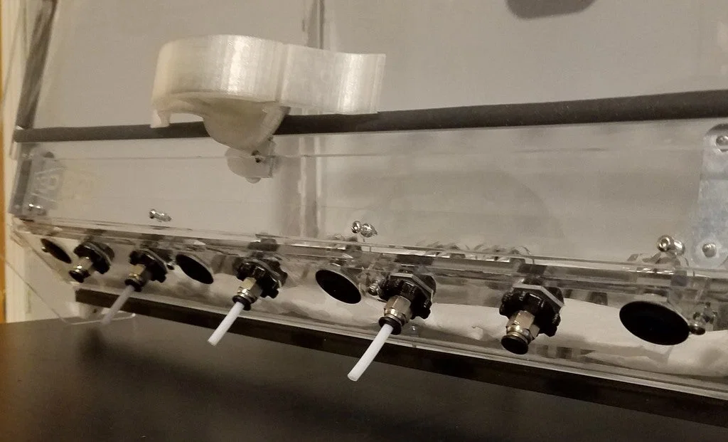 Tôi đã remixed đầu nối drybox tuyệt vời của motocoder để lắp vừa cho Repbox 1.5, loại này chắc chắn và kín hơi hơn nhiều. Tôi đã in tất cả bằng nhựa PLA và không gặp vấn đề gì về việc linh kiện bị gãy. Bạn có thể sử dụng các đầu nối này trên phần passthrough để gắn ống: https://www.amazon.com/gp/product/B01IB81IHG/ref=oh\_aui\_detailpage\_o01\_s00?ie=UTF8&psc=1