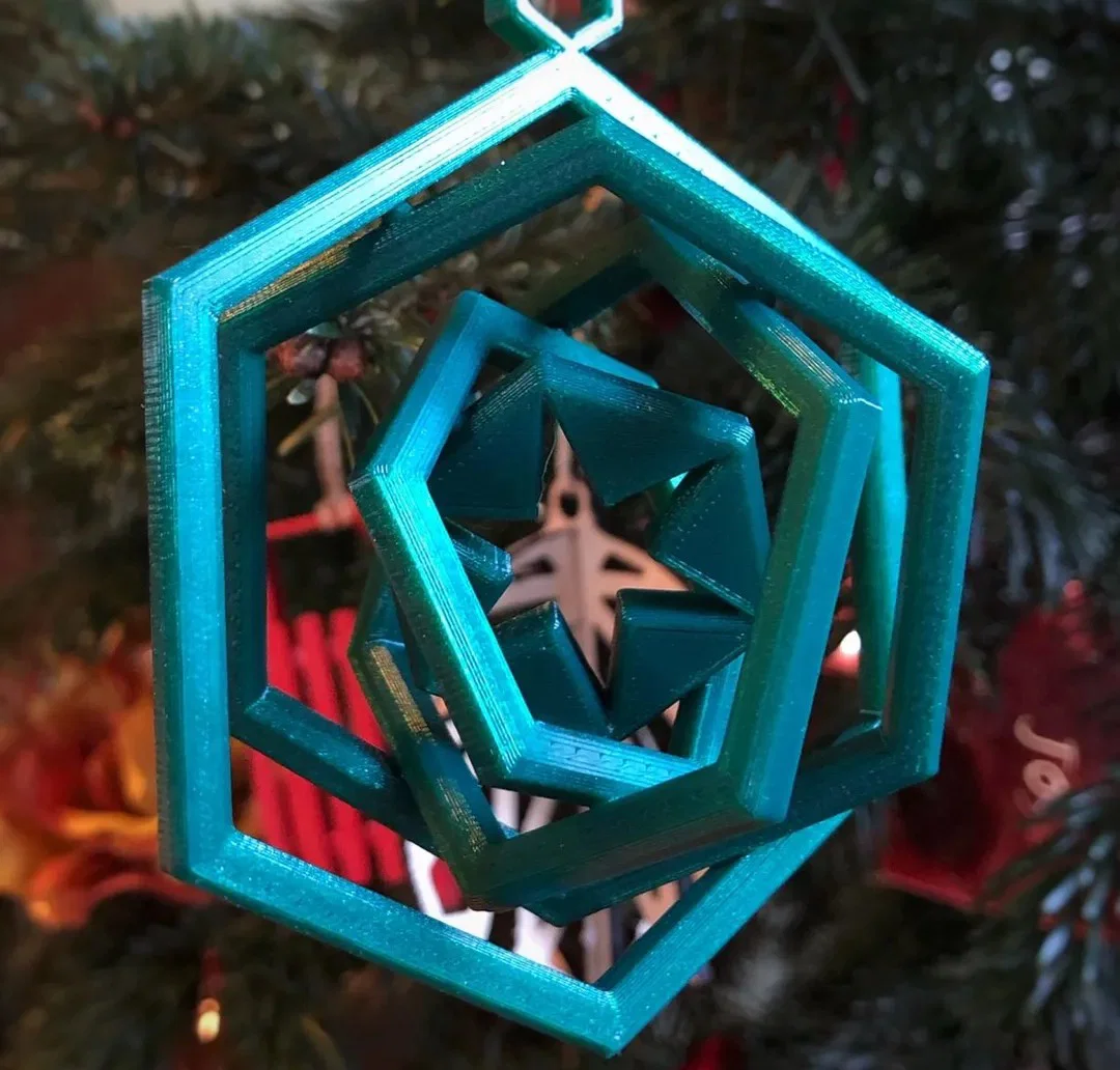 Điểm đặc biệt của mô hình này chính là cấu trúc in nguyên khối (print-in-place), cho phép bạn in toàn bộ món đồ mà không cần phải lắp ráp thêm bất kỳ chi tiết nhỏ nào sau đó. Thiết kế gồm các vòng lục giác lồng vào nhau, tạo ra hiệu ứng thị giác như một bông tuyết hoặc ngôi sao nhiều lớp, rất phù hợp để treo trên cành thông. Ngoài ra, bộ sưu tập còn đi kèm với một phiên bản trơn (blank version) để bạn thỏa sức sáng tạo, tự vẽ thêm họa tiết hoặc cá nhân hóa món đồ theo phong cách riêng của gia đình mình.