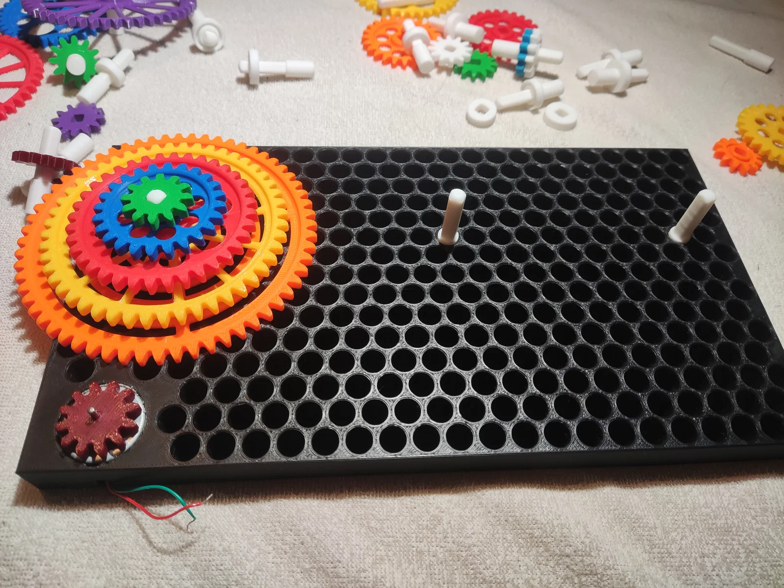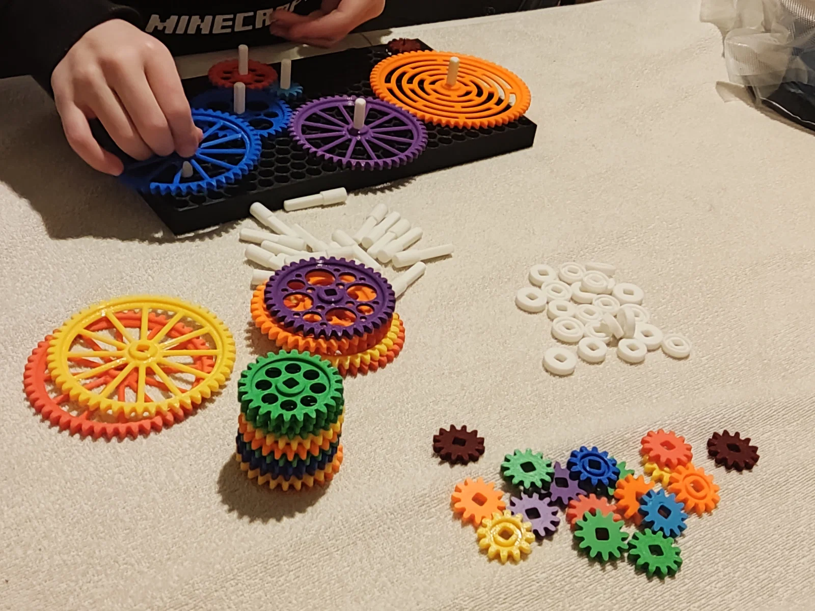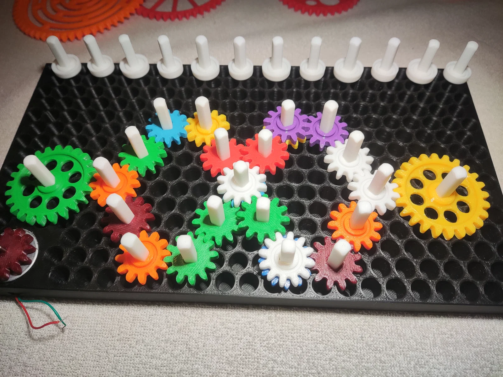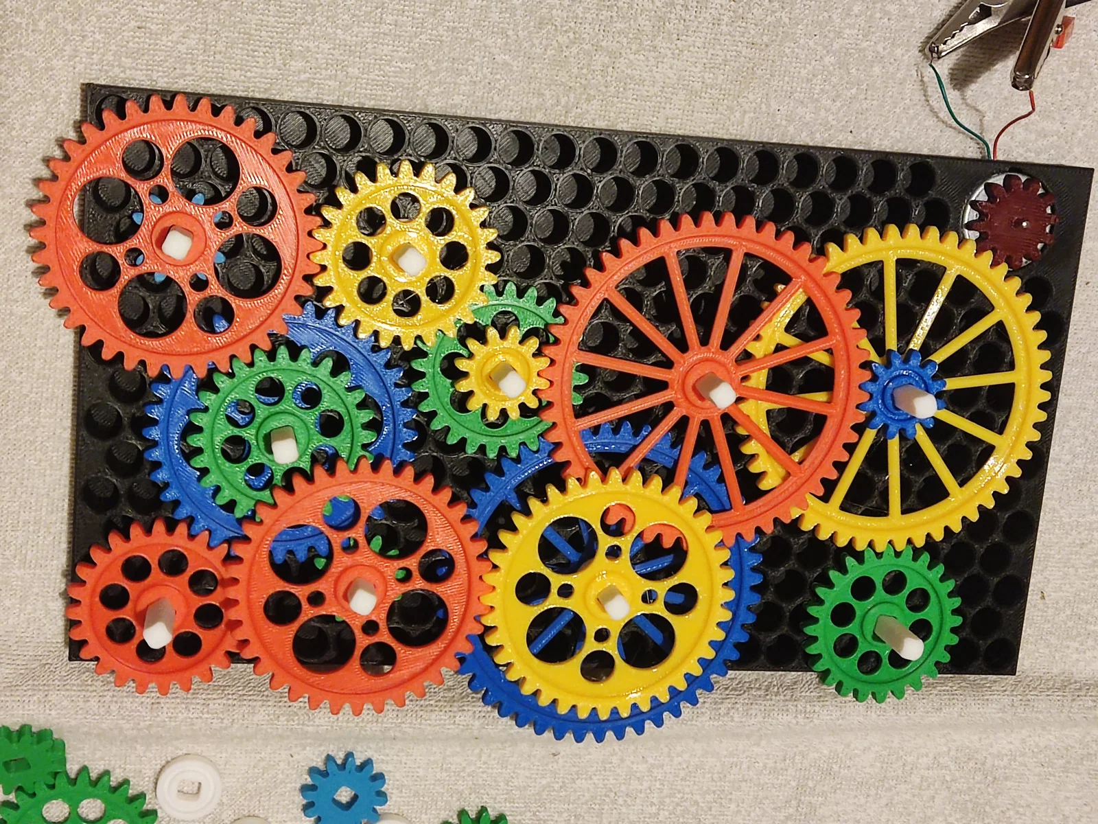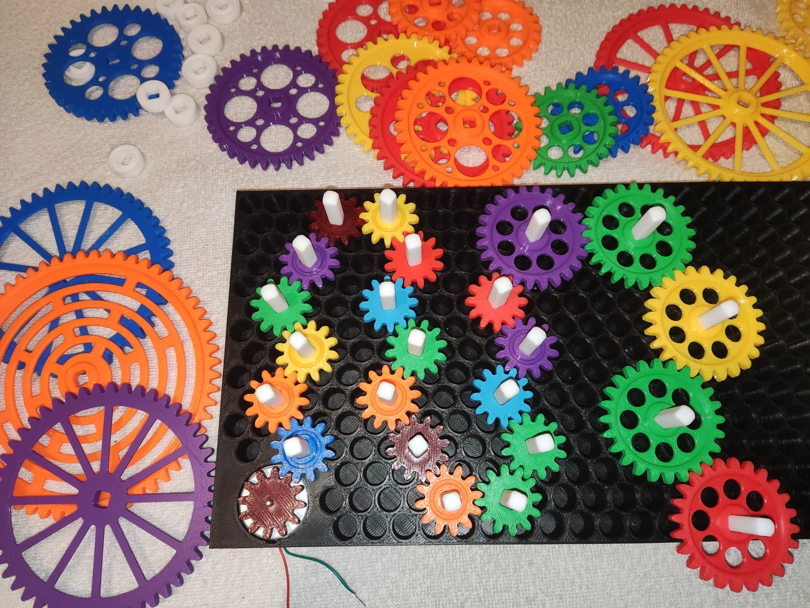 • In một cái khung, vài thanh chốt, và một bộ bánh răng với màu sắc và kích thước tùy ý (thường thì nên in nhiều bánh nhỏ hơn bánh lớn).