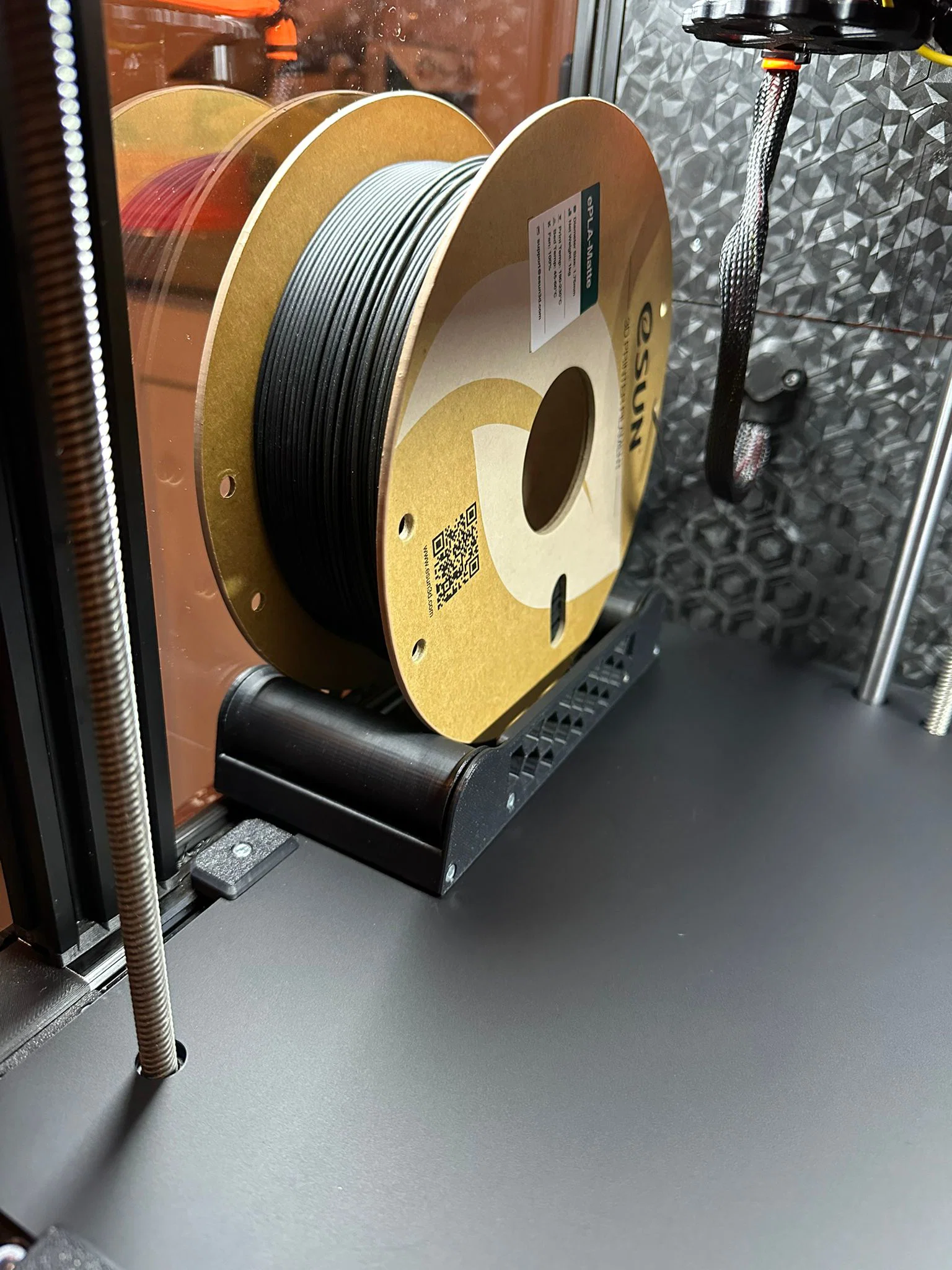 Giá đỡ cuộn nhựa gọn gàng bên trong dành cho máy in E3NG và các dòng máy tương thích. Thiết kế linh hoạt hỗ trợ vòng bi 608 hoặc bánh xe V-slot, giúp việc nạp nhựa mượt mà hơn cho cuộn nhựa rộng tới 77mm. Không cần in support, dễ dàng lắp đặt.