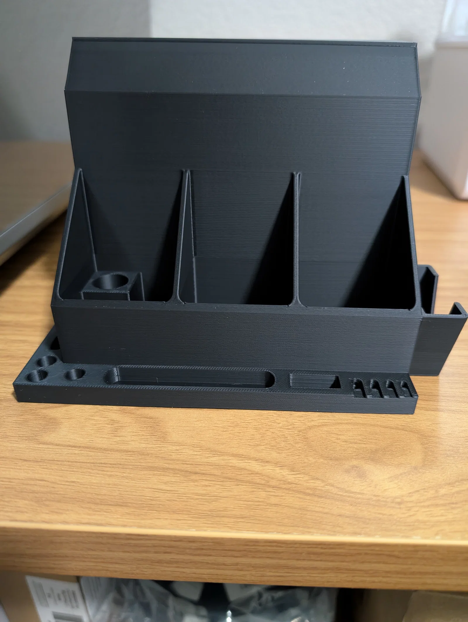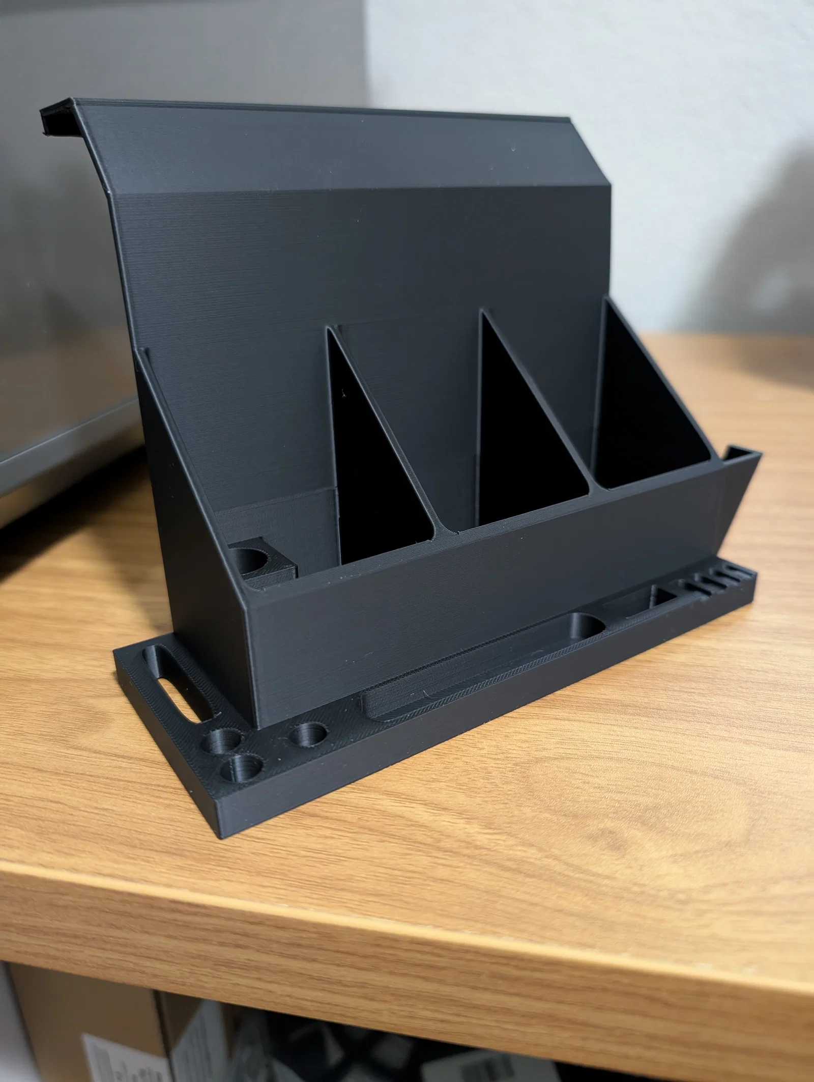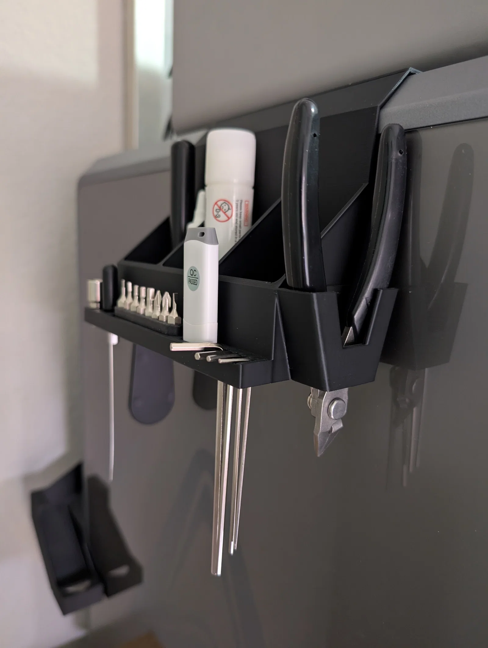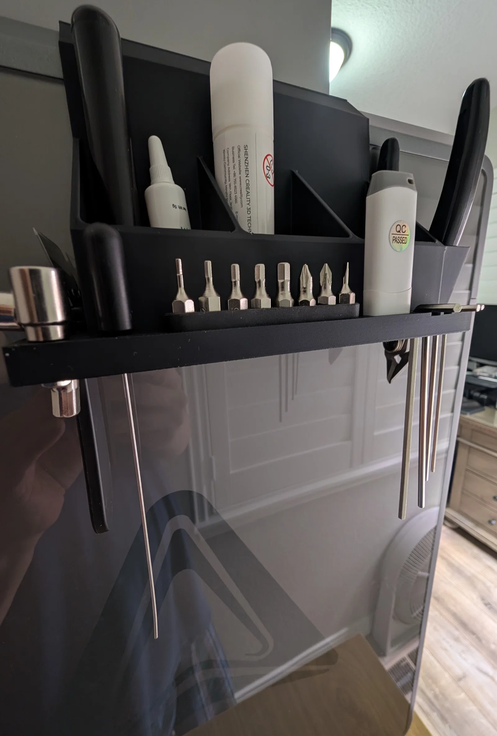 Đây là giá đỡ dụng cụ gắn bên hông cho máy in K2 Plus. Độ dung sai (tolerances) được thiết kế khá thoải mái vì bạn phải nhấc dụng cụ lên để lấy ra, mình không muốn làm quá chặt vì như thế có thể khiến giá đỡ bị nhấc bổng ra khỏi thùng chứa trên máy in.