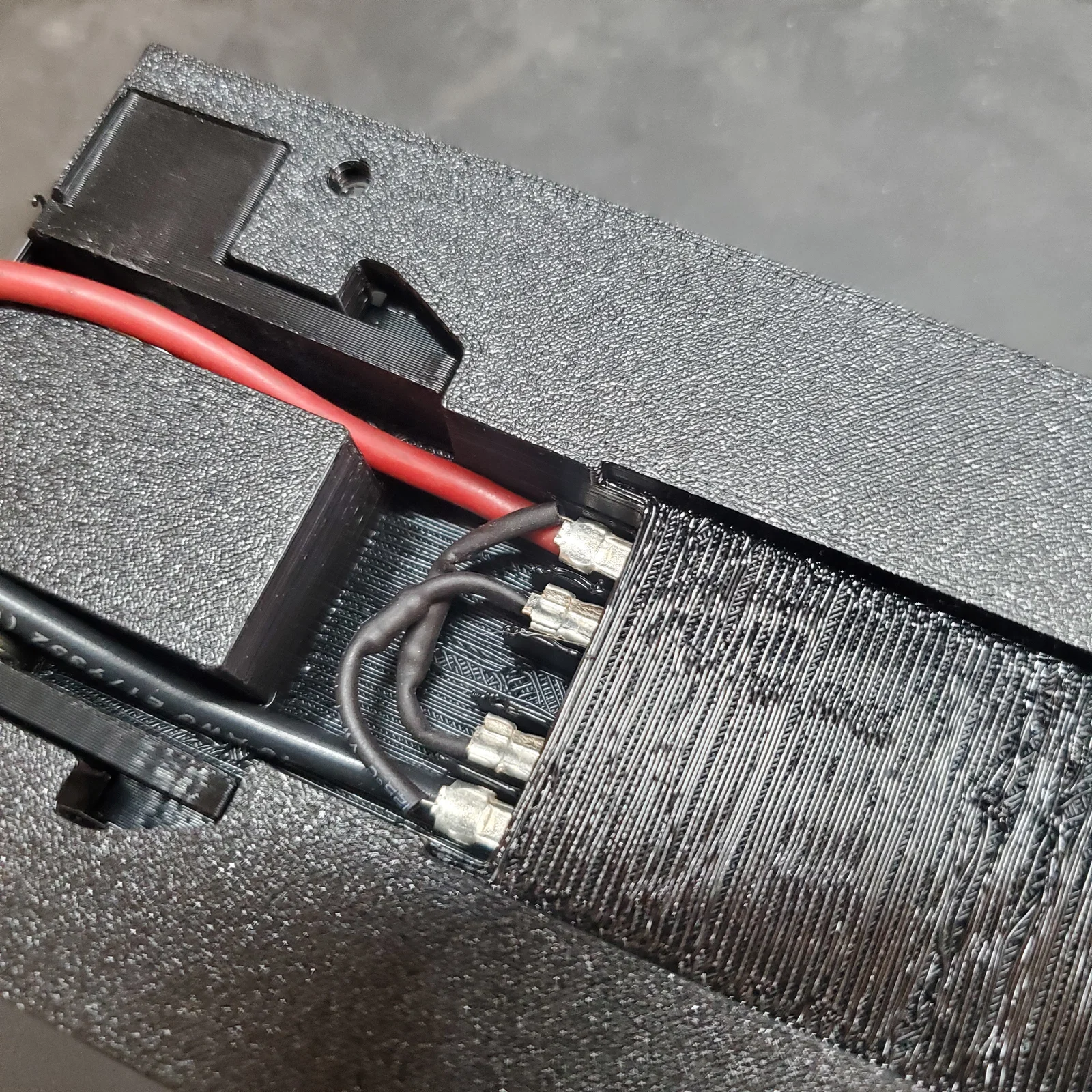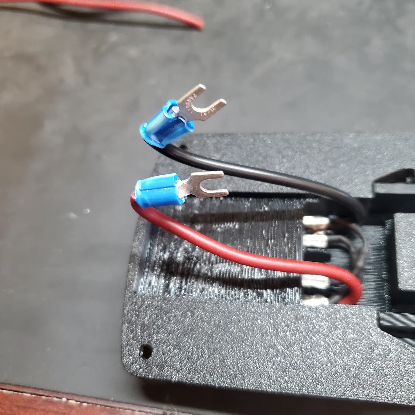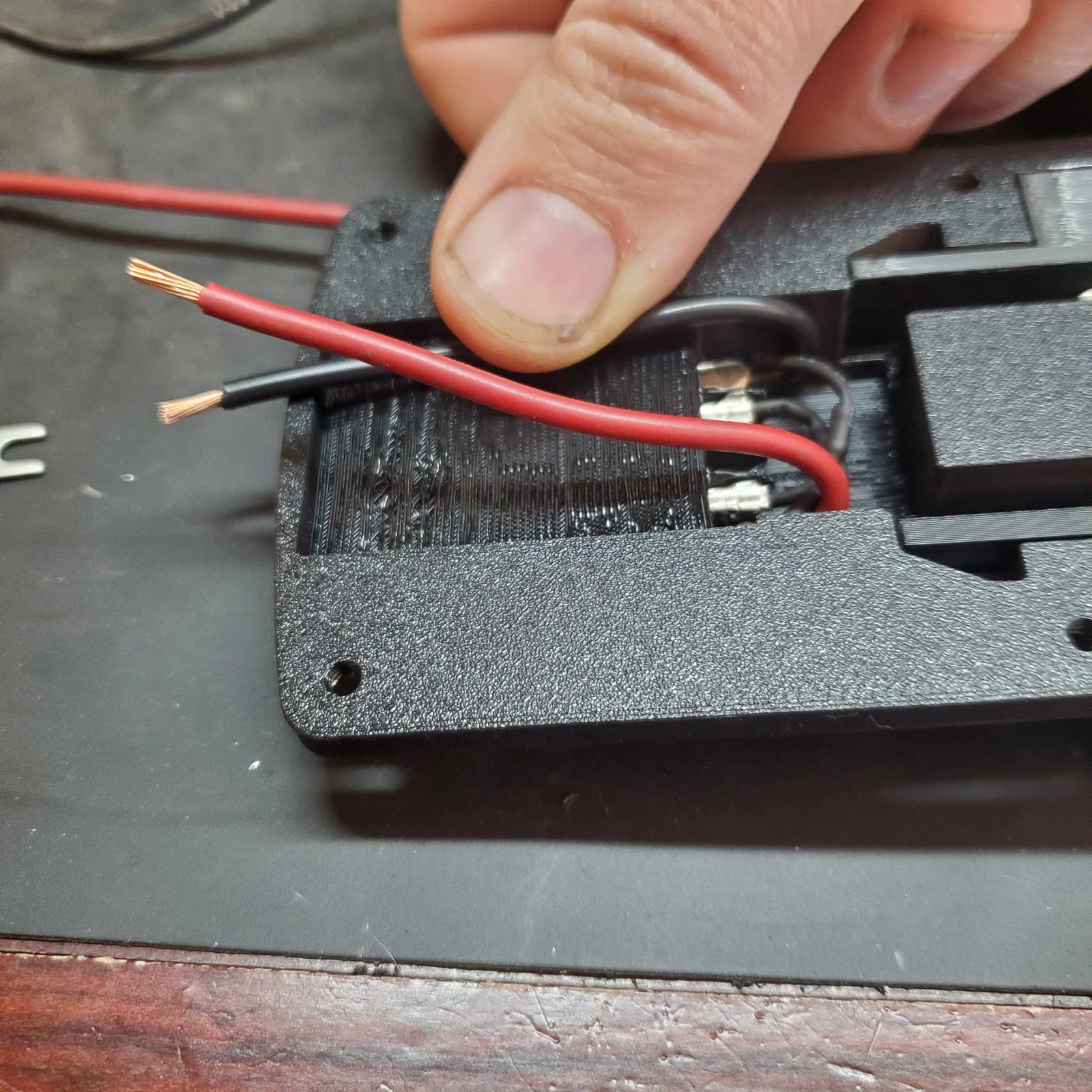 - Luồn dây vào các khe ngoài cùng của adapter phía gắn máy, dây đỏ vào cực dương (+) và dây đen vào cực âm (-). Các đầu cốt phải khớp vào vị trí.
