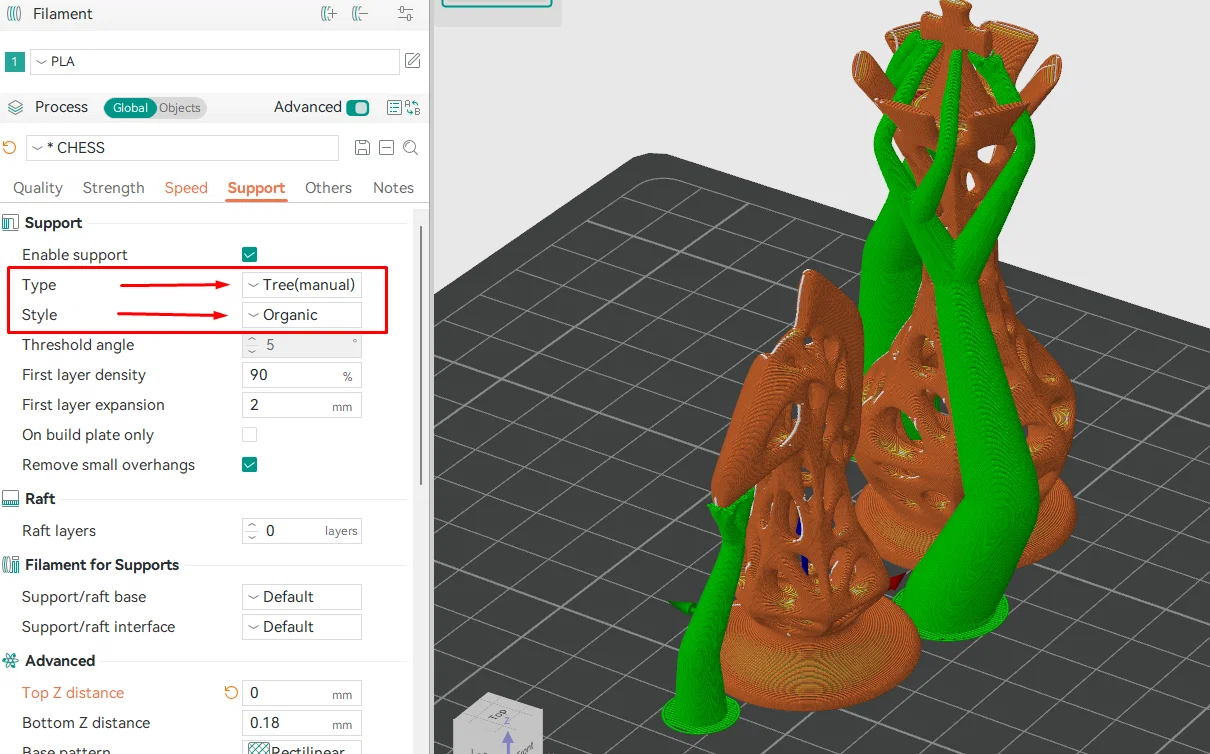 Khi thực hiện dự án in bộ cờ này, bạn cần lưu ý một số điểm kỹ thuật quan trọng để đảm bảo kết quả in mỹ mãn nhất. Do cấu trúc dạng lưới phức tạp, việc thiết lập support (hỗ trợ) là bắt buộc. Bạn nên sử dụng tính năng "Tree support" với style "Organic" trong OrcaSlicer như hình hướng dẫn để bảo vệ các chi tiết mảnh của quân cờ. Ngoài ra, việc bổ sung thêm nam châm vào phần đế quân cờ cũng là một ý tưởng hay giúp chúng đứng vững vàng hơn trong quá trình sử dụng.