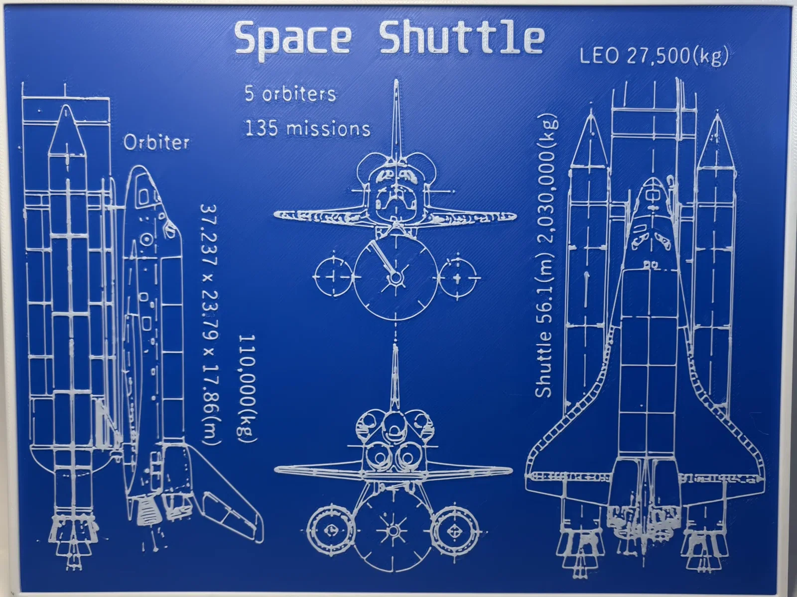 Thiết kế này được tối ưu hóa để in dạng tranh treo tường hoặc đặt bàn với độ sắc nét cực cao, làm nổi bật lên những nét vẽ kỹ thuật (technical drawing) tinh tế trên nền bảng xanh đặc trưng. Các thông tin về trọng lượng, kích thước và số lượng tàu Orbiter được thể hiện rõ ràng, tạo nên một cái nhìn tổng quan đầy đủ và chuyên nghiệp. Bạn có thể sử dụng mô hình này để trang trí phòng làm việc, phòng học hoặc làm quà tặng cho những người bạn có cùng đam mê về thiên văn và công nghệ vũ trụ.