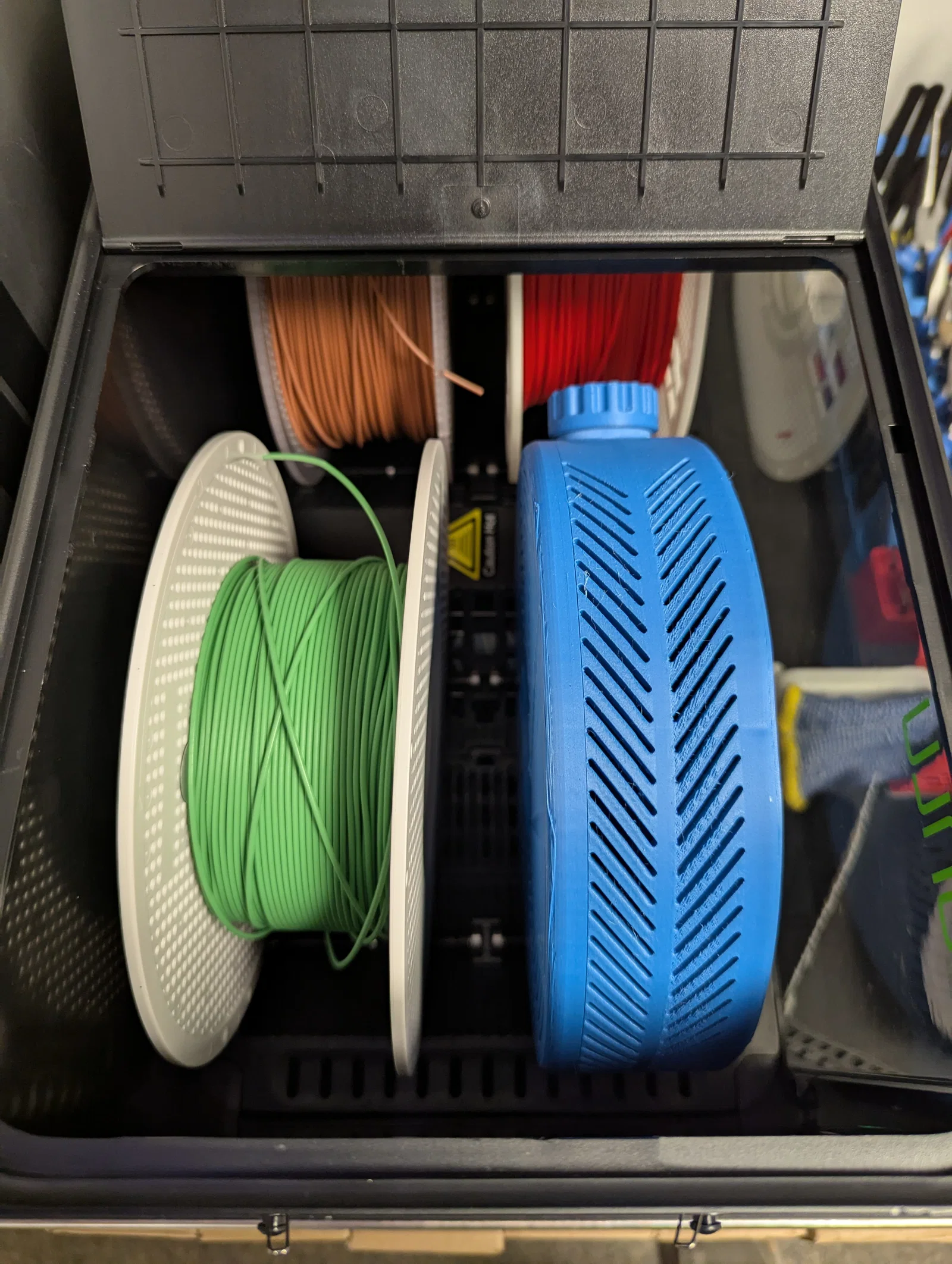 Anh em có thể in bằng loại nhựa tùy chọn, tuy nhiên, hãy cân nhắc chọn loại nhựa chịu được nhiệt độ tương ứng với mức nhiệt mà anh em dùng để sấy trong hộp (ví dụ: máy sấy PLA thì dùng nhựa PLA hoặc loại tương đương, máy sấy PC thì dùng nhựa PC hoặc vật liệu chịu nhiệt tốt hơn). Mình đang có một cái in bằng PLA để dùng cho cuộn PLA và một cái in bằng PC để dùng cho các loại vật liệu còn lại.