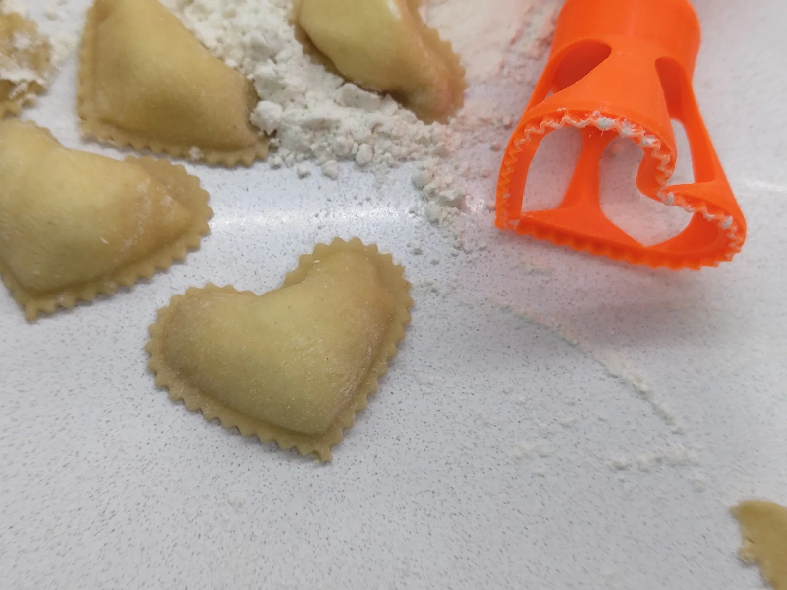 Sau khi cán bột, bạn chỉ cần nhấn mạnh khuôn xuống là sẽ có ngay những miếng Ravioli hình trái tim hoàn hảo!