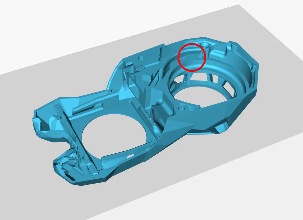Vì StealthBurner thường được in mà không cần support, nên phần nhô ra trên tay cầm để gắn quạt 5015 bị lơ lửng trong không trung, dẫn đến việc in không được đẹp. Mình đã thêm một lớp support mỏng khoảng 1mm bên dưới tay cầm. Sau khi in xong, bạn có thể dễ dàng tách lớp này ra bằng móng tay hoặc một chiếc tua vít nhỏ.