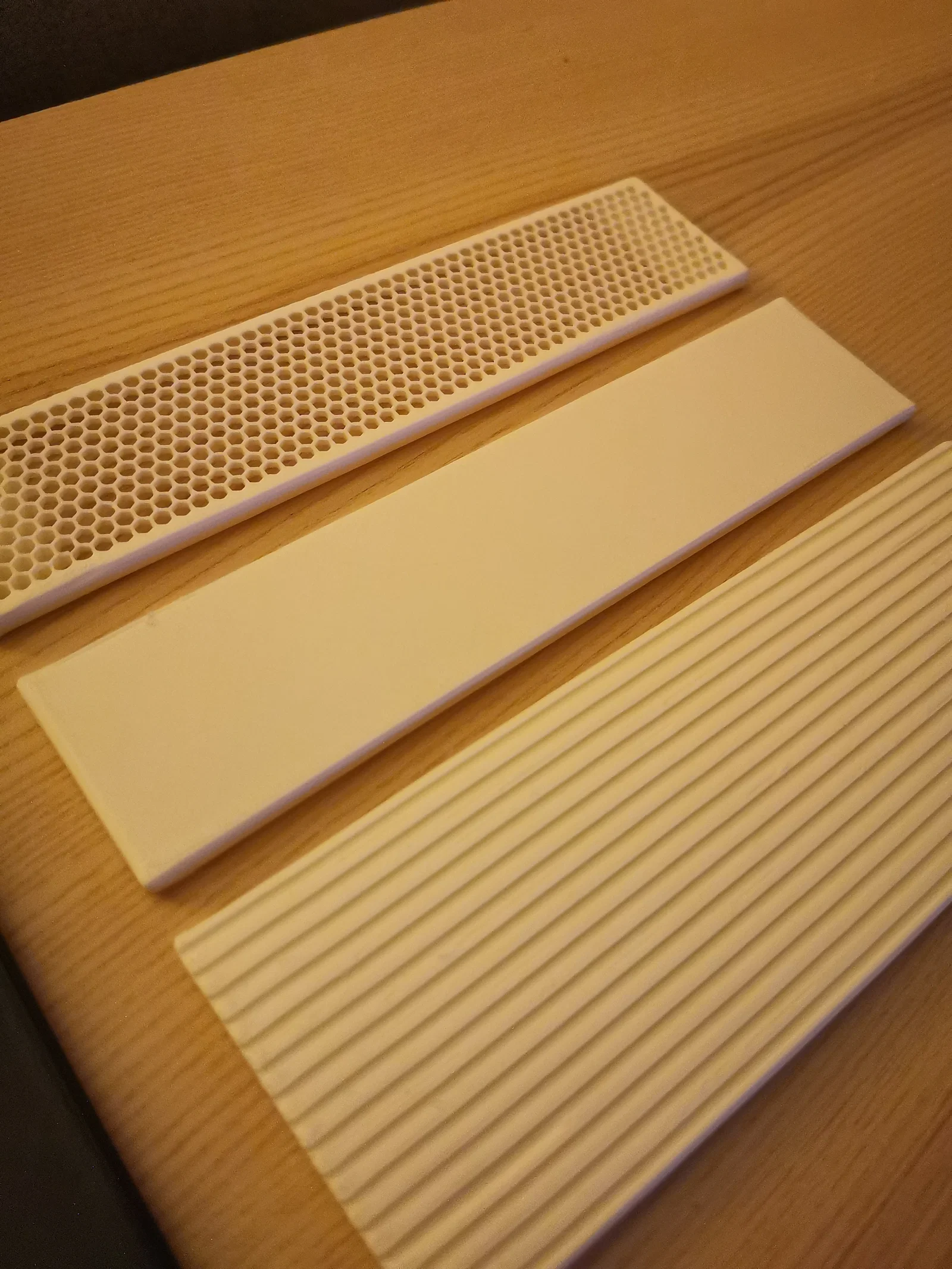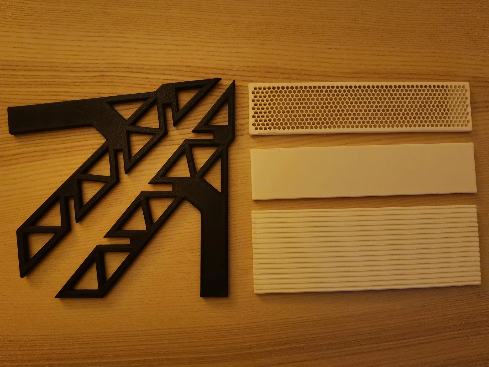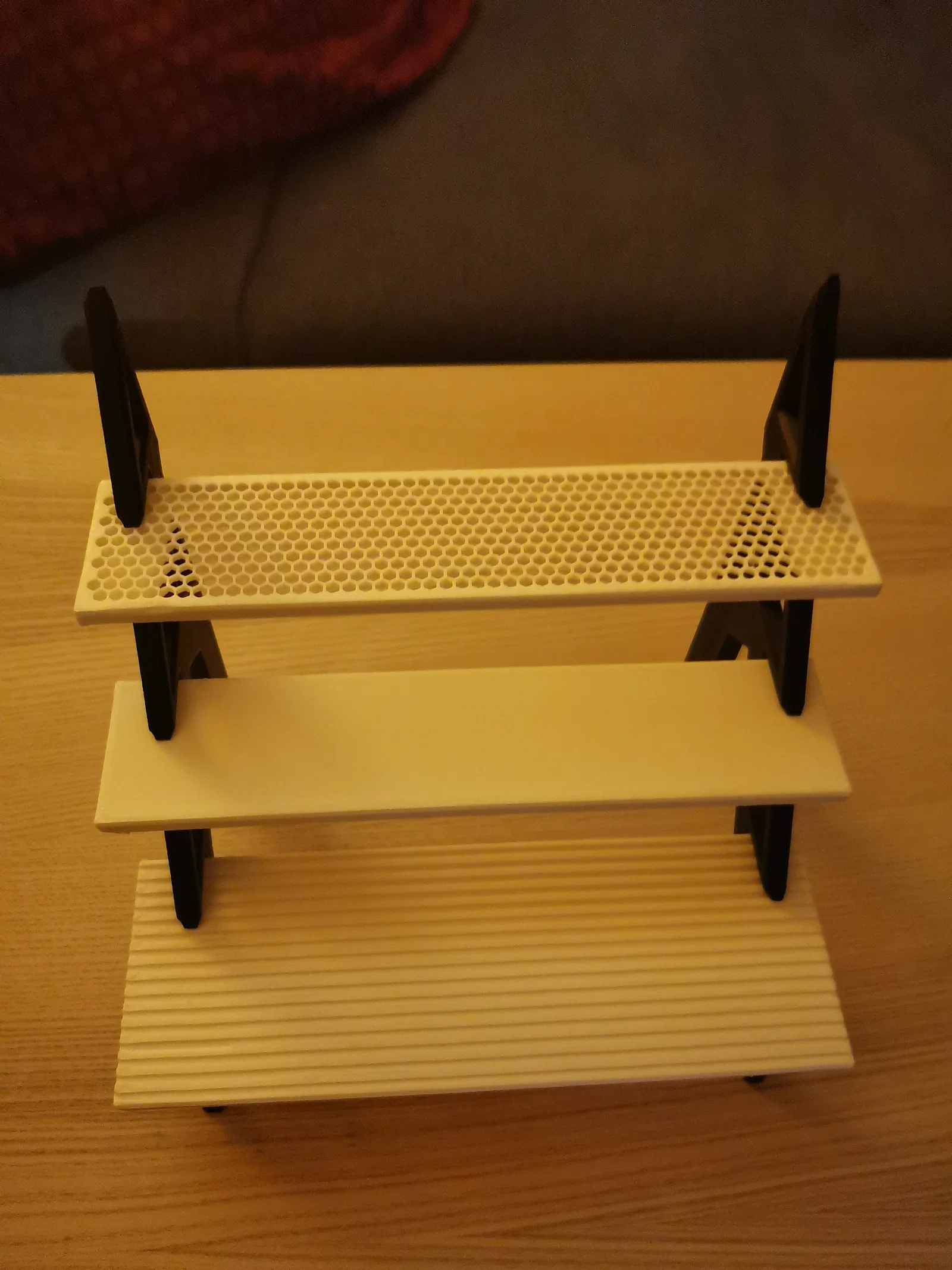 ##### Các bộ phận cần in 2x chân đế trưng bày 2x kệ ngắn... 1x kệ dài... Chân đế tiêu chuẩn (base.stl) có độ khít tương đối, không có khe hở so với các kệ. Trên thực tế, tùy vào dung sai máy in của bạn mà độ khít có thể lỏng hơn dự kiến. Nếu gặp trường hợp này, mình khuyên bạn nên in phiên bản chân đế khít hơn (base-tighter-fit.stl). ##### Lượng nhựa sử dụng Dưới đây là mức tiêu thụ nhựa cho 3 tùy chọn kệ: Chân đế (cần thiết): 55g Các loại kệ (chọn một): Lục giác (Hexagon): 57g Phẳng (Smooth): 98g Nhám (Rugged): 110g Kệ lục giác là lựa chọn tiết kiệm nhựa nhất, mặc dù độ cứng cáp sẽ thấp hơn một chút. ##### Nguồn gốc Mô hình này dựa trên Display Stand (3 shelf) của elden.designs. Các kệ Gridfinity dựa trên gridfinity minimal magnetic baseplate của Jools. ##### Supports Không cần hỗ trợ in ##### Kích thước Dài: 20 cm / 7.8 inch Chiều cao: 18.5 cm / 7.3 inch ##### Thông số in 3D Layer Height: 0.2 mm Infill: 15% ##### Nhật ký cập nhật [10.12.24] - thêm biến thể chân đế khít hơn [06.01.25] - thêm các kệ Gridfinity