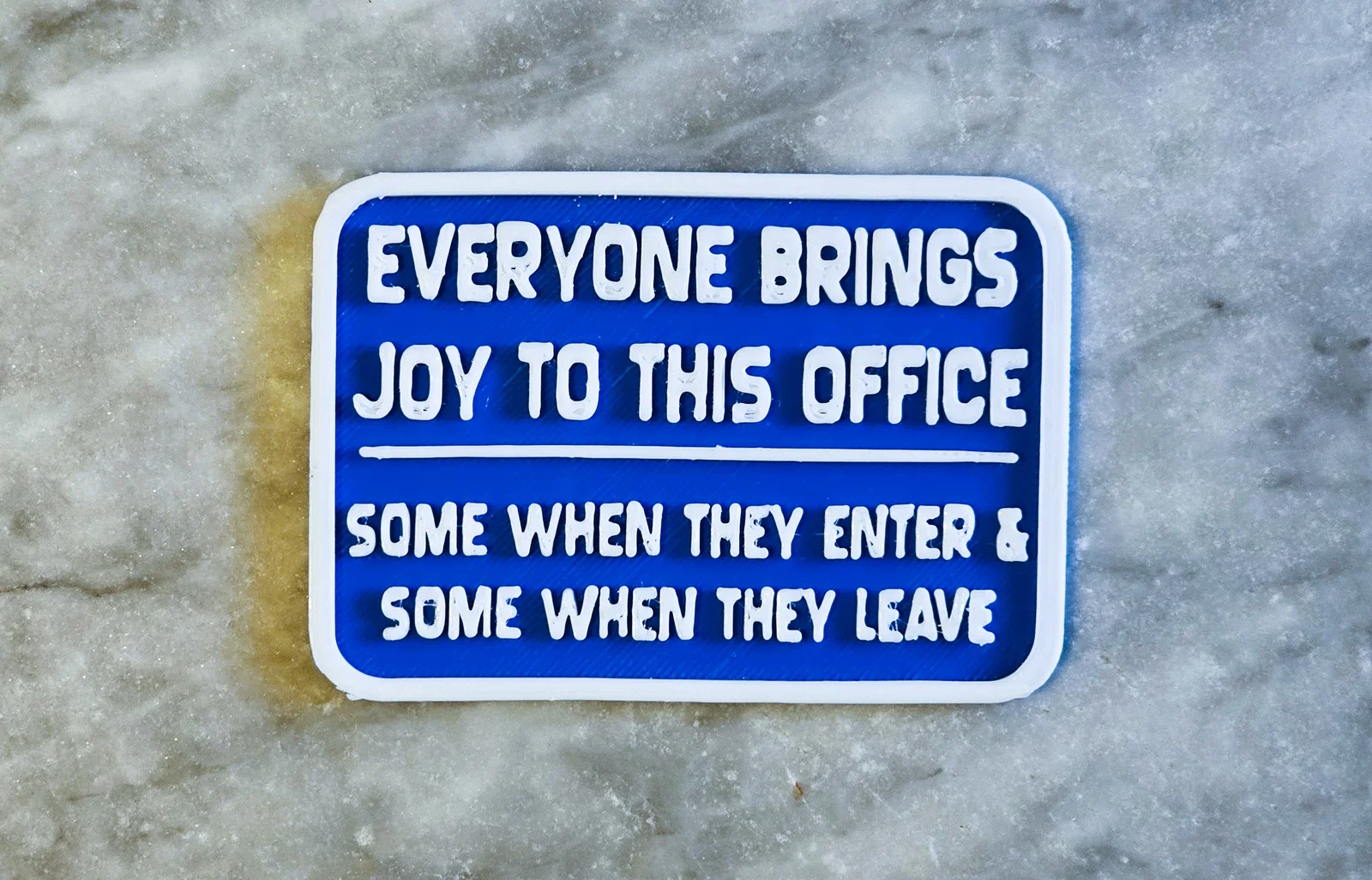Bạn đang tìm kiếm một món đồ trang trí độc đáo để làm không khí văn phòng thêm phần thú vị và hài hước? Mẫu 3D "Joy to the office sign" chính là lựa chọn hoàn hảo dành cho bạn. Với thông điệp hóm hỉnh "Everyone brings joy to this office, some when they enter & some when they leave", tấm biển này không chỉ là vật phẩm trang trí bàn làm việc mà còn là chủ đề trò chuyện thú vị với đồng nghiệp mỗi ngày.