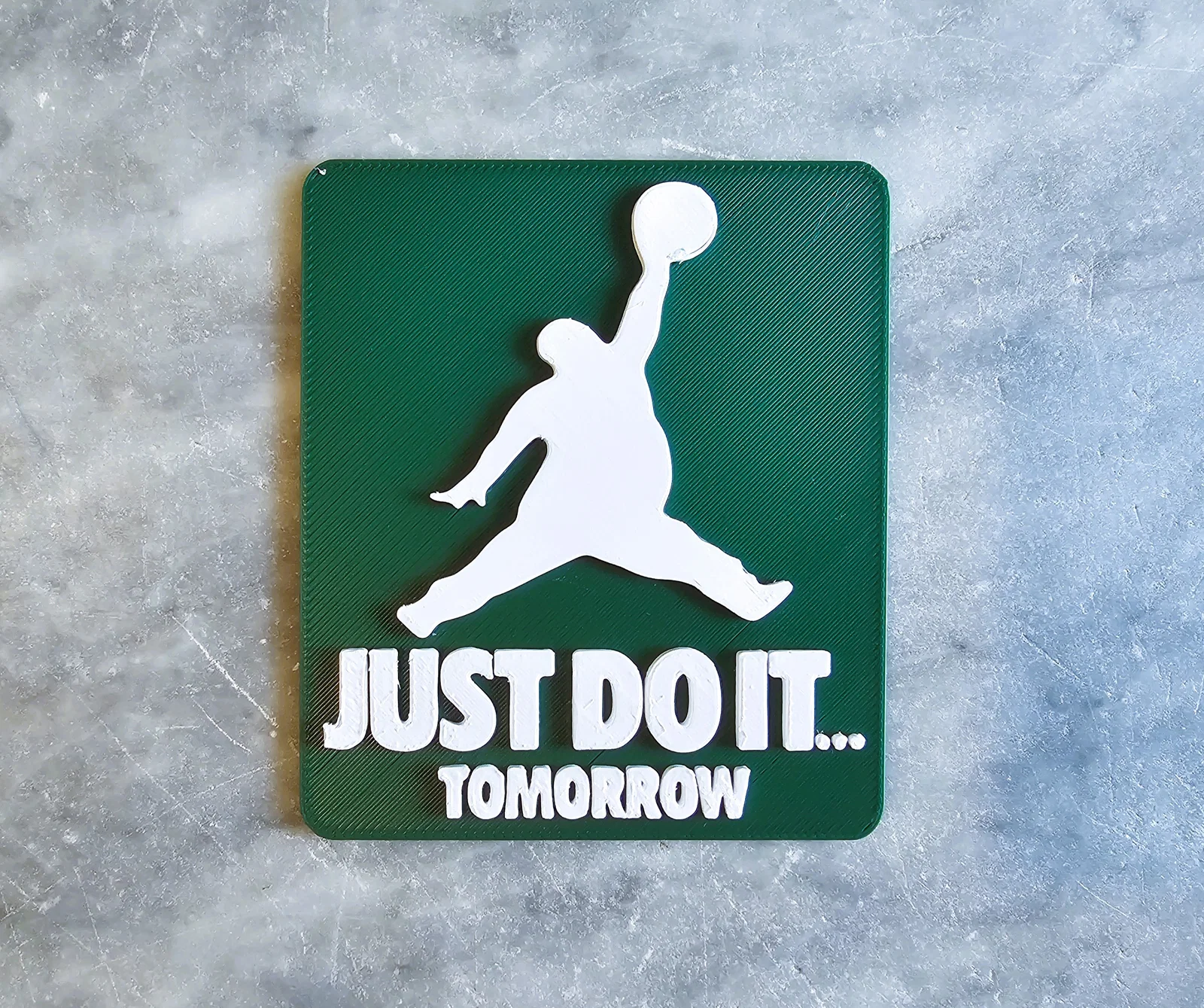 Bạn đang tìm một món đồ trang trí văn phòng độc lạ và mang tính giải trí cao? Hãy thử ngay mẫu in 3D bảng treo "Just do it tomorrow" với cảm hứng từ biểu tượng Jordan kinh điển. Thay vì hình ảnh vận động viên vươn mình mạnh mẽ, mẫu thiết kế này mang đến một phiên bản vui nhộn, tạo cảm giác thư giãn tuyệt vời cho không gian làm việc của bạn. Sản phẩm được thiết kế tối ưu cho việc in 3D nhiều màu, cho phép bạn dễ dàng thay đổi màu sắc qua thao tác tạm dừng máy in trong G-code. Đây chắc chắn là món đồ trang trí 3D hoàn hảo để thể hiện cá tính riêng, nhắc nhở bản thân về việc cân bằng cuộc sống và chắc chắn sẽ khiến bạn bè bật cười khi nhìn thấy.