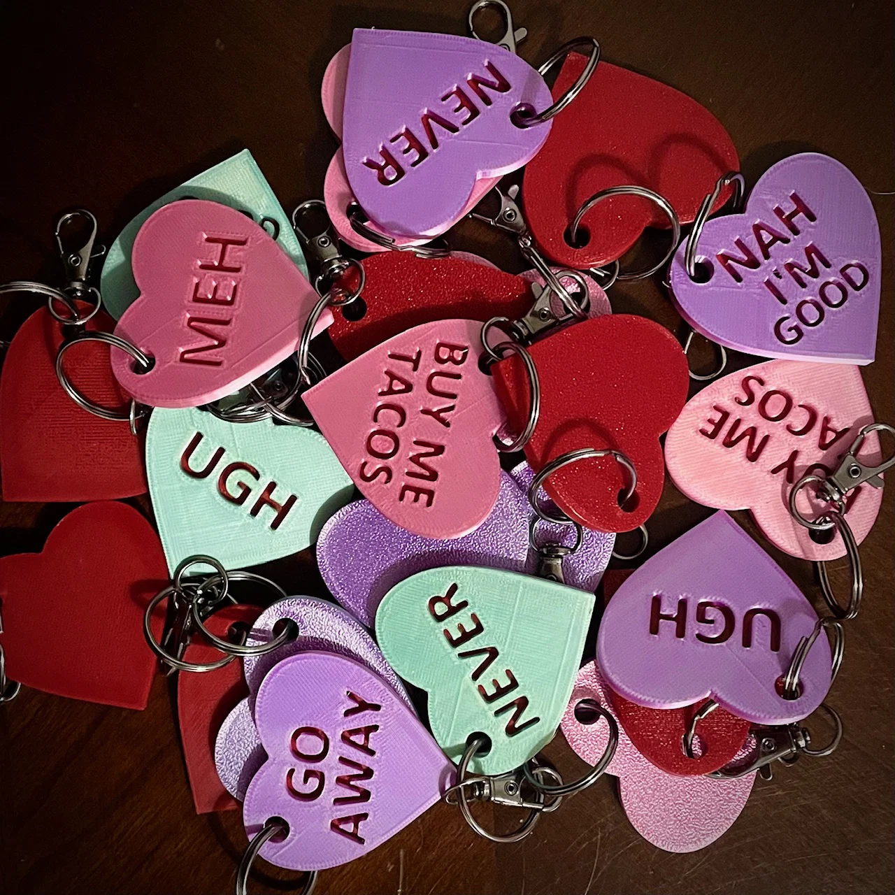 Các mẫu móc khóa hình trái tim cực dễ in. Trông giống như những viên kẹo hình trái tim có in chữ vậy. Không cần dùng AMS đâu nhé. Mình đã có sẵn bản trống để mọi người tự thêm chữ hoặc thử in không cần lớp tường trên và dưới để làm lộ phần infill (lõi bên trong) ra, nhìn hay phết. Món phụ kiện này gắn vào chìa khóa hay balo là chuẩn luôn. Mới cập nhật thêm hình ảnh mẫu của bản trống với các thông số slicer đã được tinh chỉnh nhé.