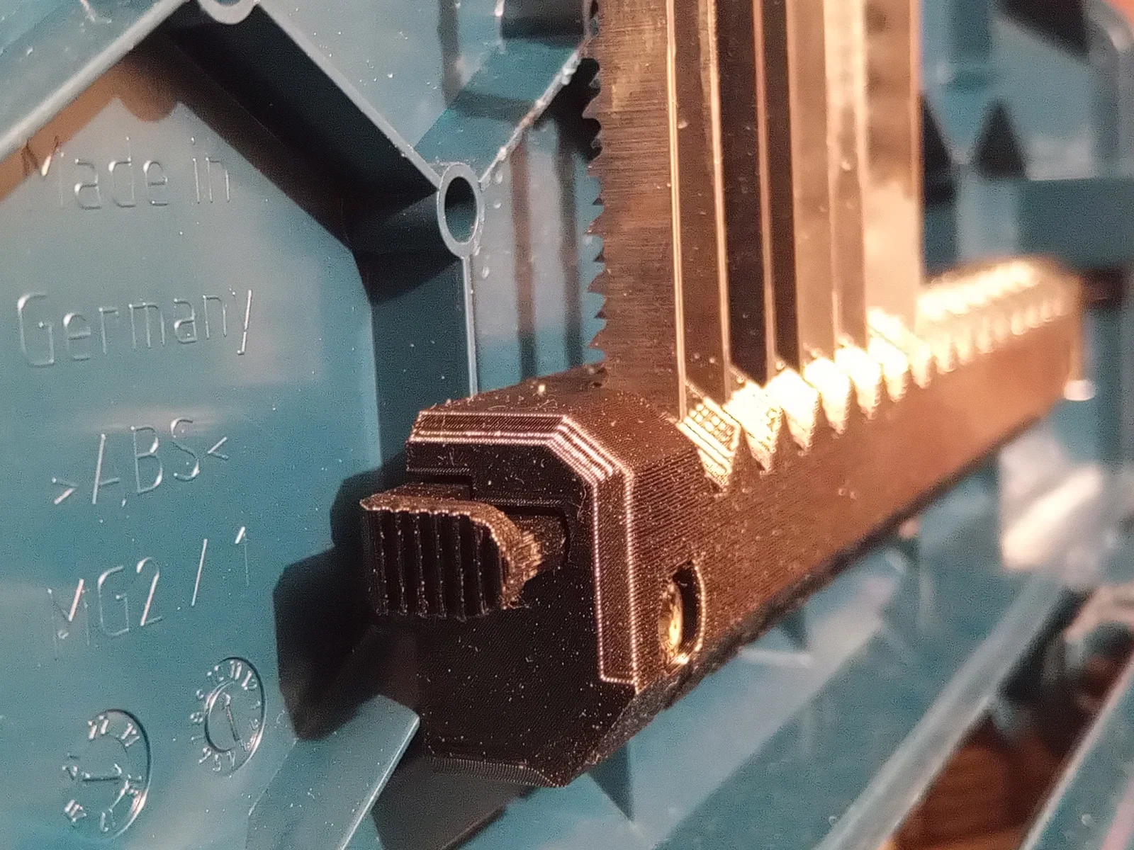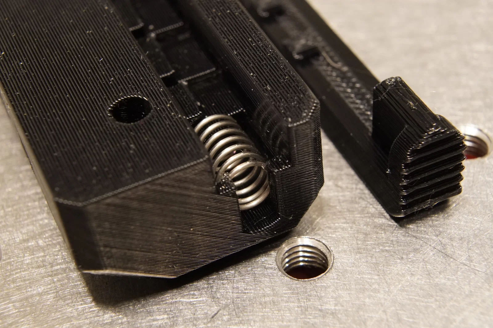 Model này được tối ưu để in rất dễ dàng, không cần support, không cần hậu xử lý, nhưng khuyến khích dùng vòi phun 0.4 mm. Thanh trượt được căng bằng hai lò xo có kích thước T0.6xW6xL15 mm. Để lắp giá vào nắp thùng đồ nghề, bạn hãy làm nóng ốc vít M4 rồi vặn chúng vào các lỗ gắn.