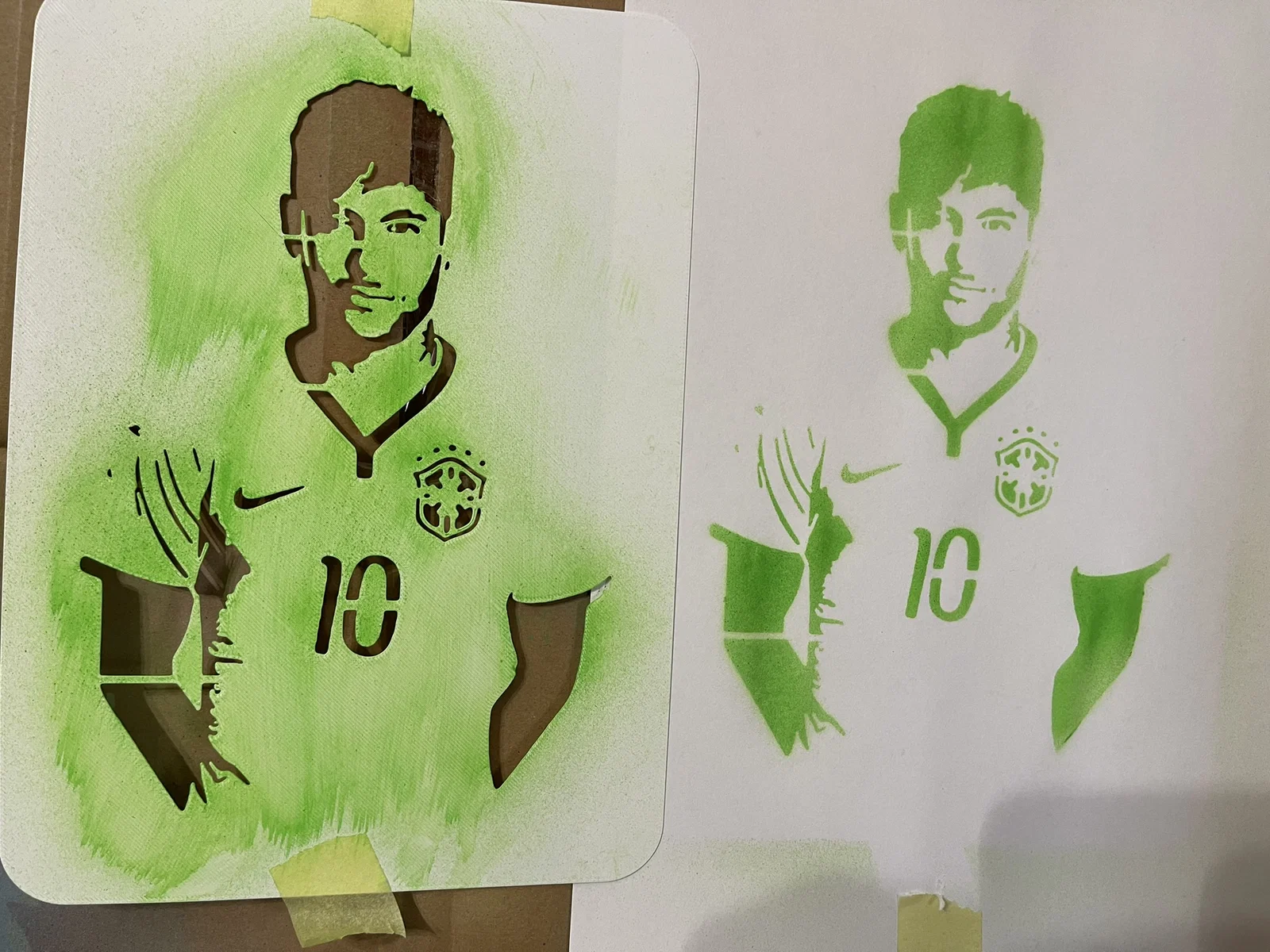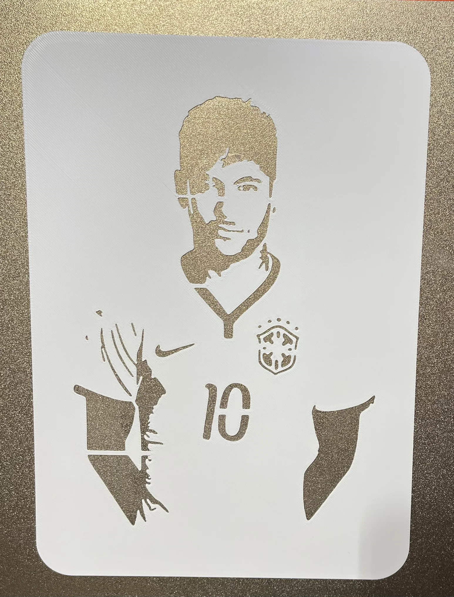 Mẫu khuôn in Stencil hình cầu thủ Neymar JR, được thiết kế chuyên dụng để in lên áo (vải) hoặc trang trí trên tường. Sản phẩm này giúp bạn dễ dàng tạo hình sắc nét bằng cách sử dụng sơn hoặc airbrush.