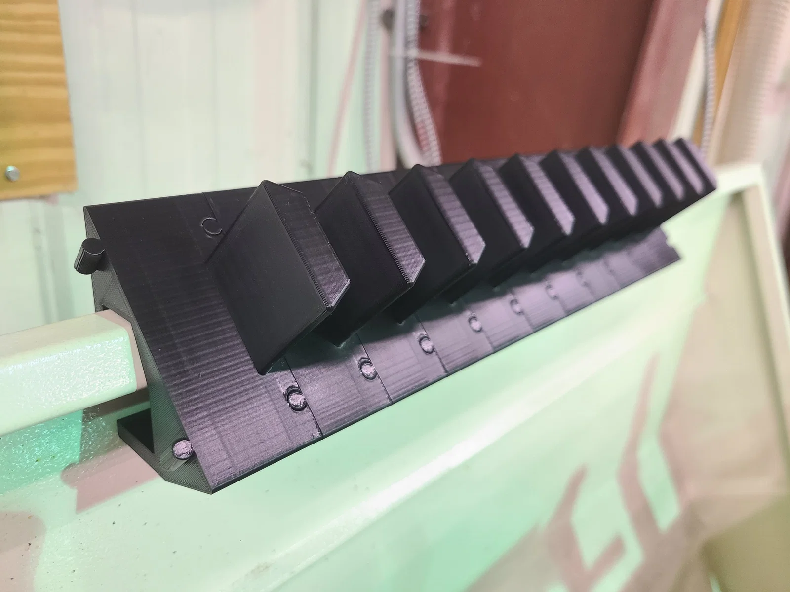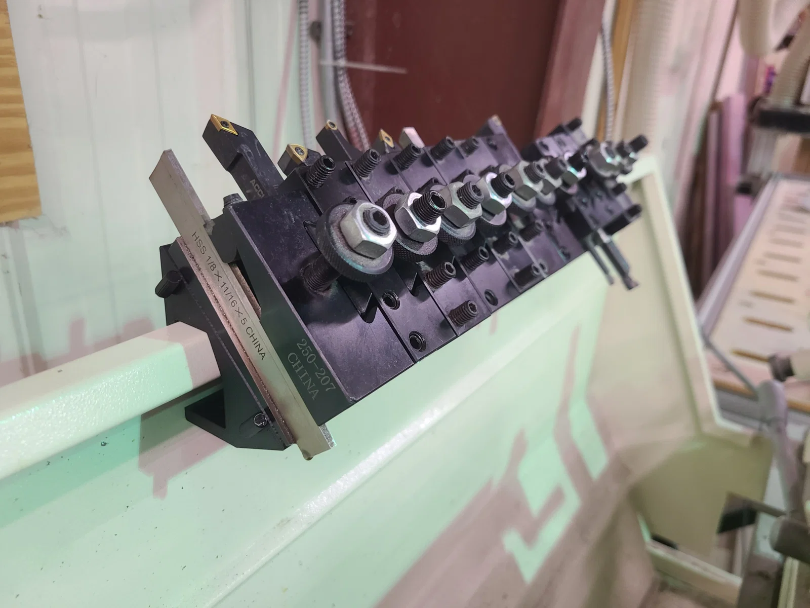 Tôi thiết kế các gá giữ dao này để di chuyển dao cao hơn một chút so với mép của tấm chắn bắn tóe. Tôi cũng muốn các gá này có thể khớp nối với nhau mà không cần dùng đến phần cứng bổ sung. Chúng phù hợp với các bộ thay dao nhanh kích thước BXA và mô hình được thiết kế cho máy tiện Shop Fox của tôi, loại máy rất giống với máy tiện Grizzley. Bạn hãy kiểm tra kích thước tấm chắn bắn tóe của mình so với kích thước trong ảnh nhé. Việc điều chỉnh lại cũng khá đơn giản nếu cần.