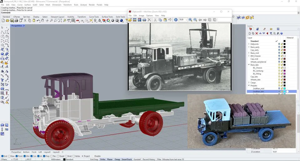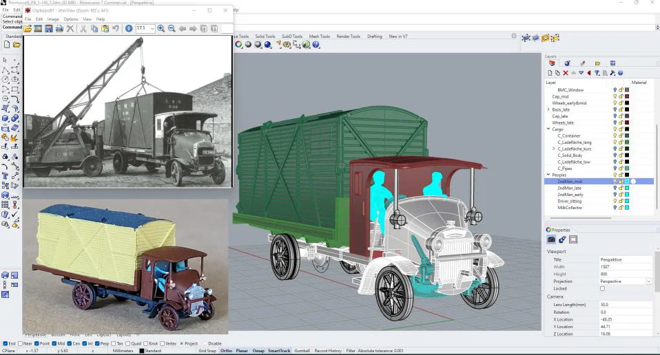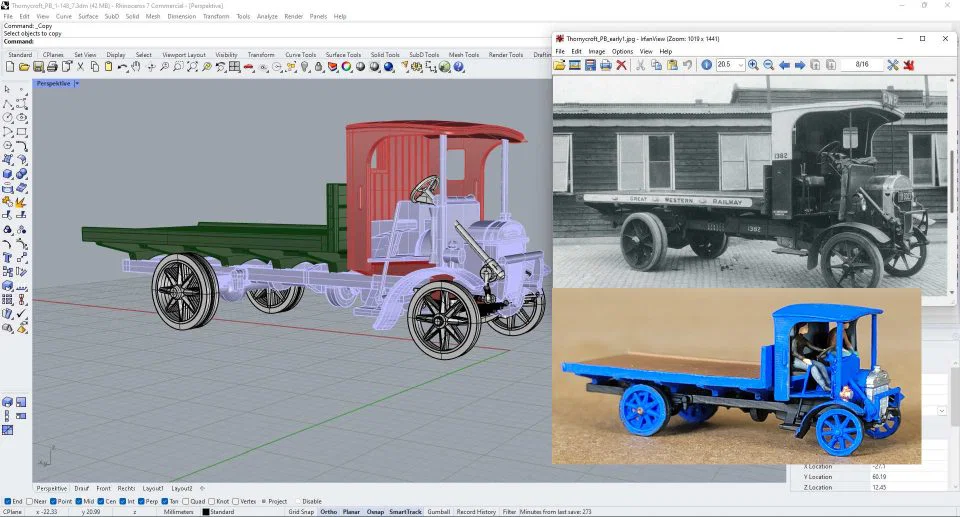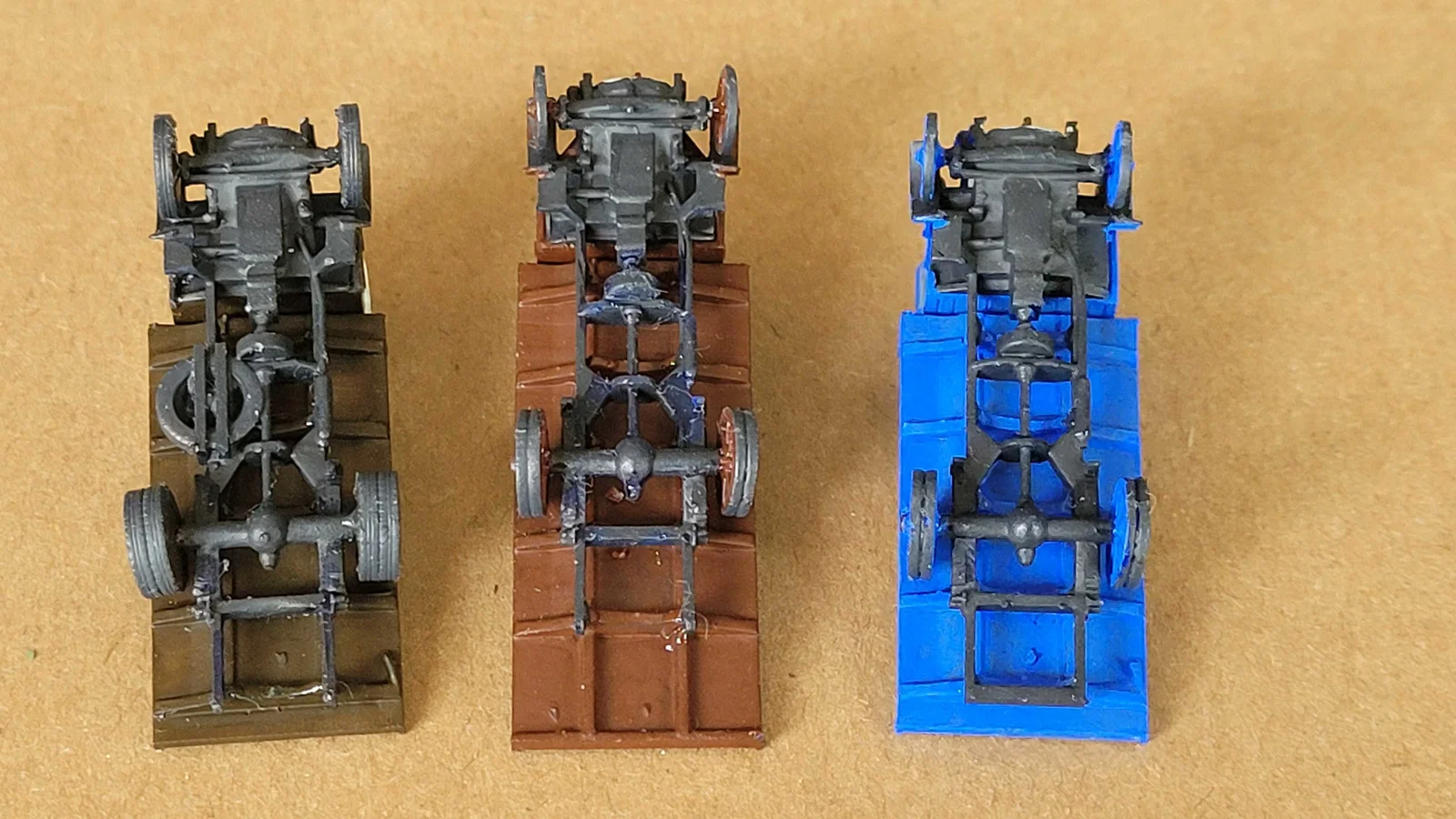 Từ nhiều hình ảnh (xem danh sách nguồn bên dưới), mình nhận thấy sự phát triển rõ rệt của cabin tài xế. Mình đã chia chúng thành các loại: đầu, giữa và cuối, tạo ra ba phiên bản cho mô hình này. Bánh xe là loại đặc cho phiên bản đầu và giữa, còn phiên bản cuối sử dụng bánh hơi. Bánh trước có thể tùy chọn để thẳng hoặc đánh lái sang trái/phải. Mô hình tài xế dùng chung cho tất cả các phiên bản. Mô hình phụ lái được tùy chỉnh cho từng phiên bản, trong đó phiên bản phụ lái đời đầu có thể lắp vừa cho tất cả các trường hợp. Bất kỳ loại thùng xe nào cũng có thể lắp vừa với mọi loại khung gầm.