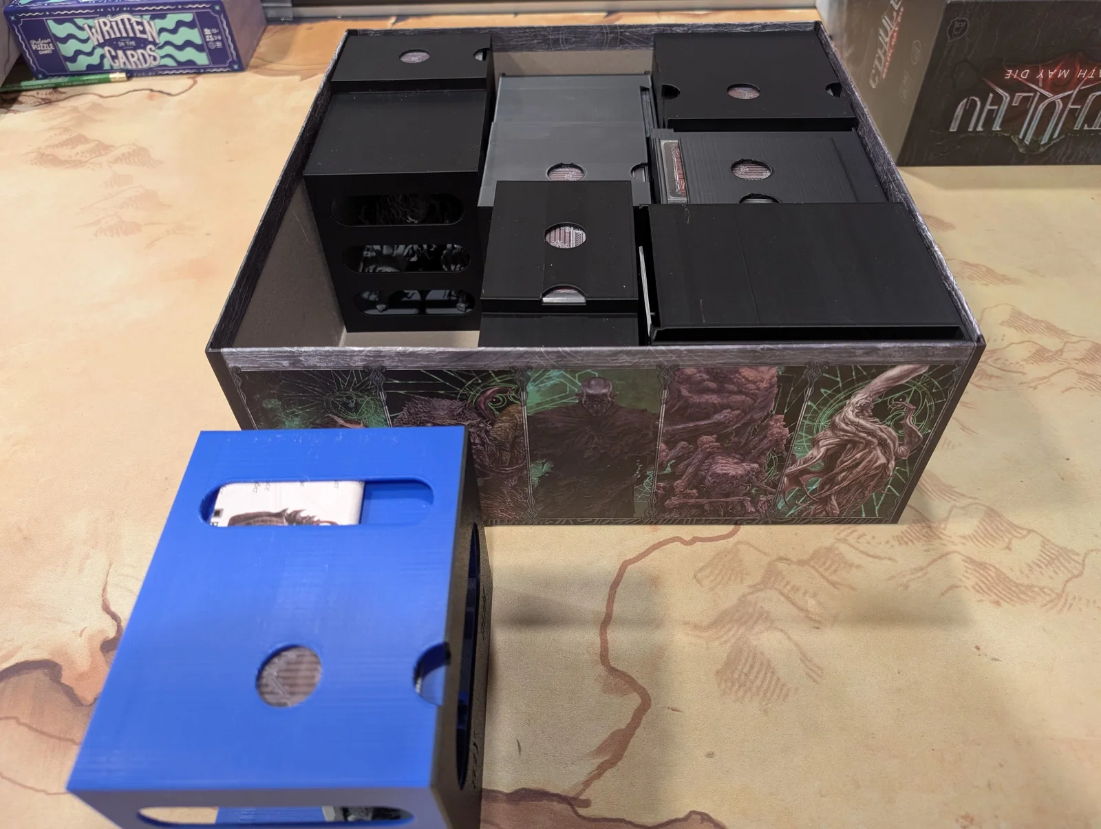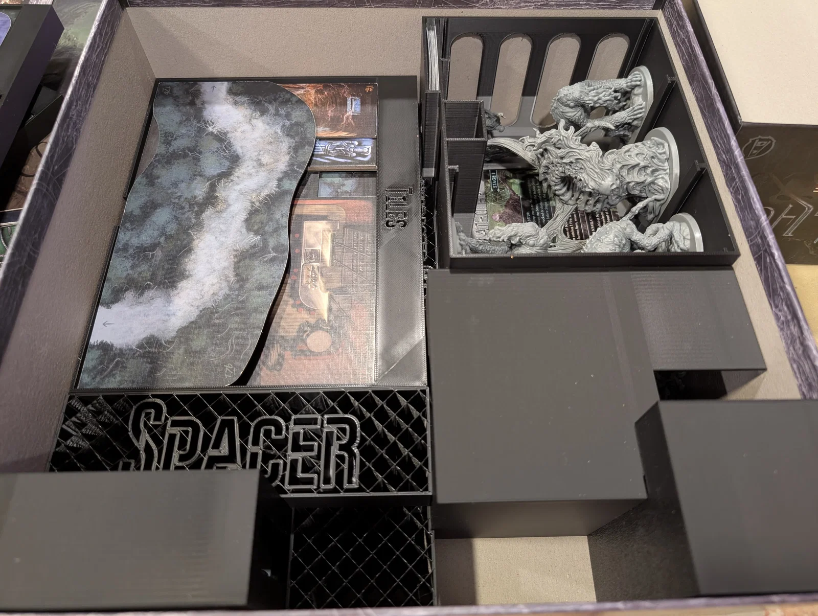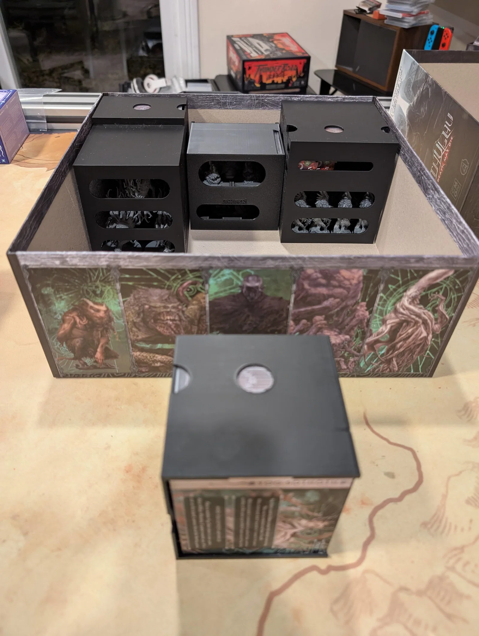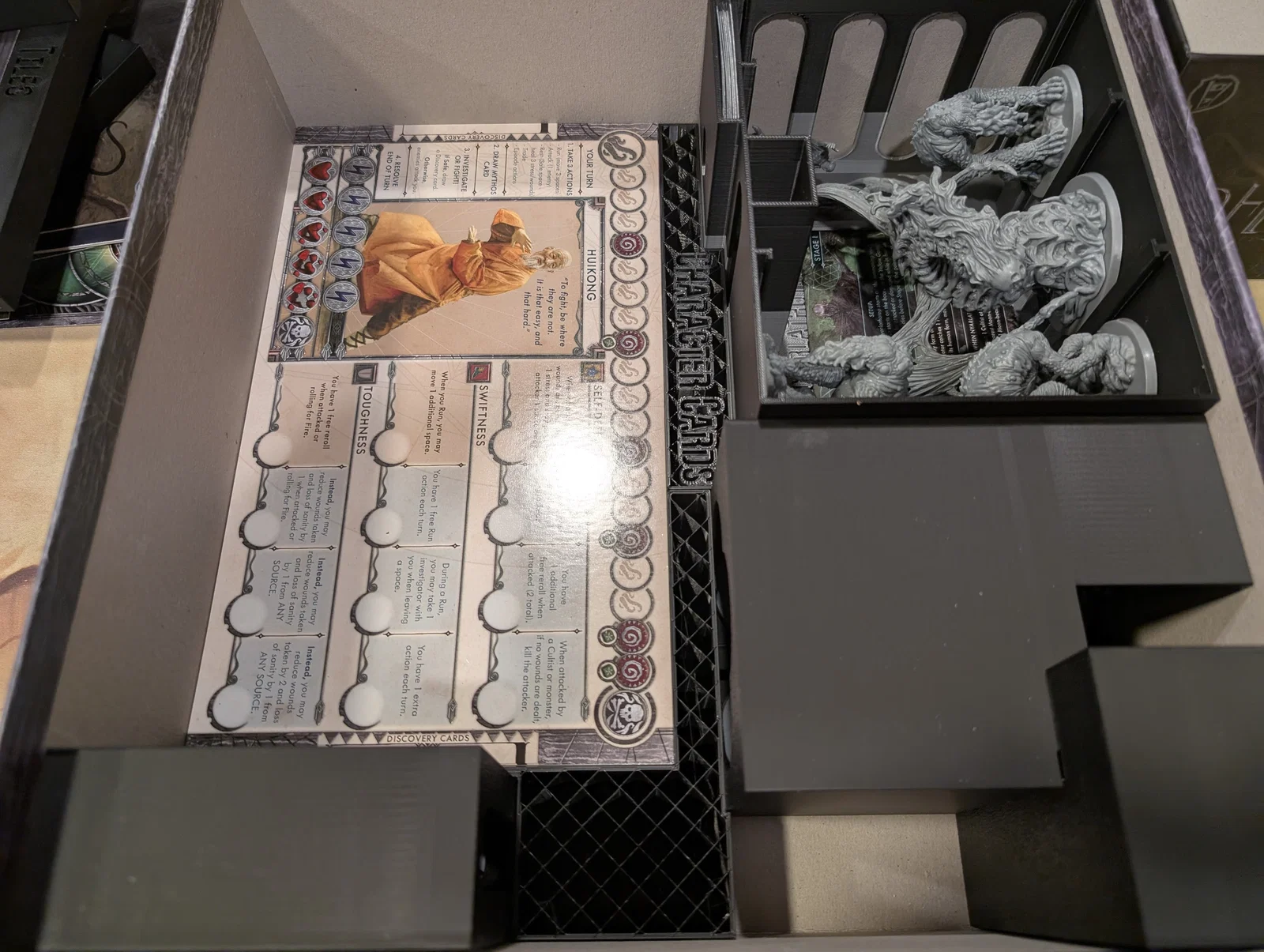 Mọi thứ được sắp xếp rất logic: một hộp cho các miếng ghép bản đồ (tiles), một hộp cho trùm/Elder One (ngoại trừ tên Nyanth chiếm quá nhiều chỗ), một hộp cho mô hình (minis), và hộp cuối cùng cho các tập phim cùng token.