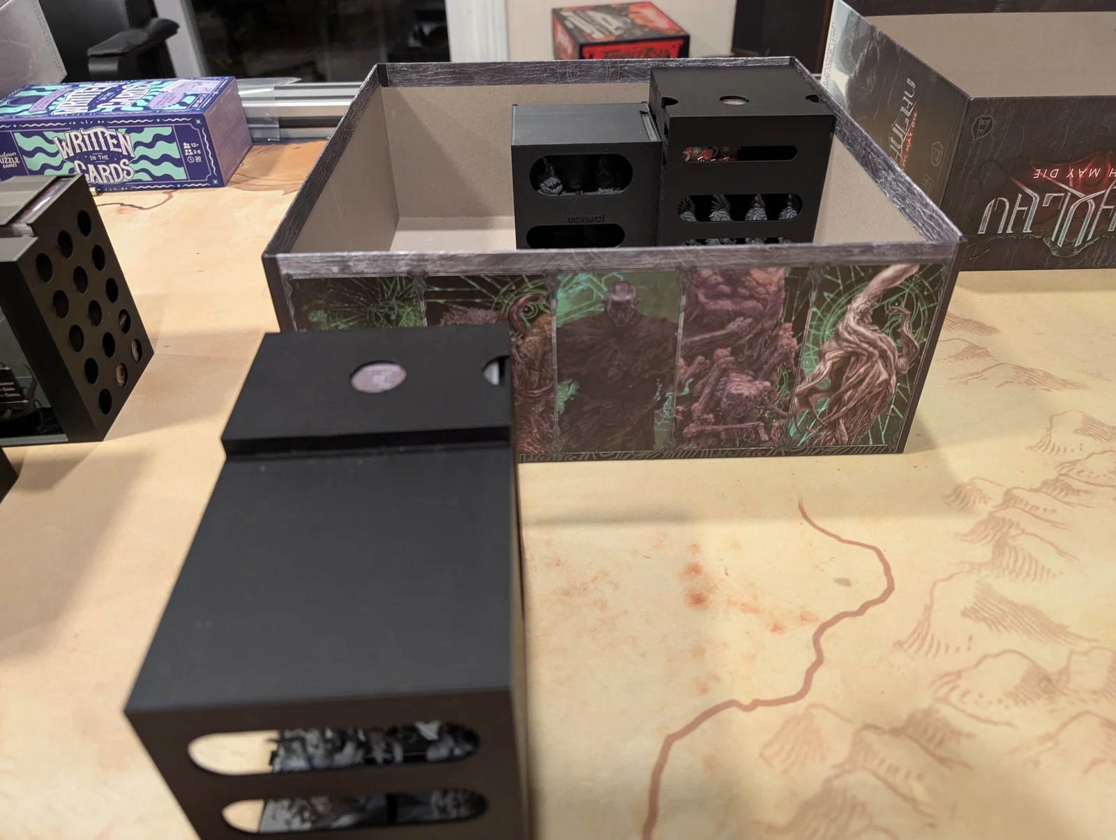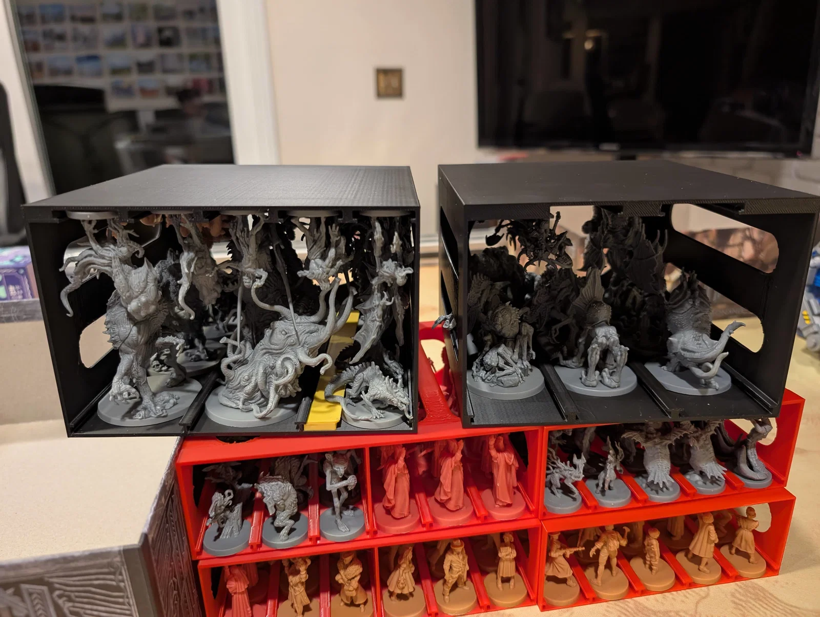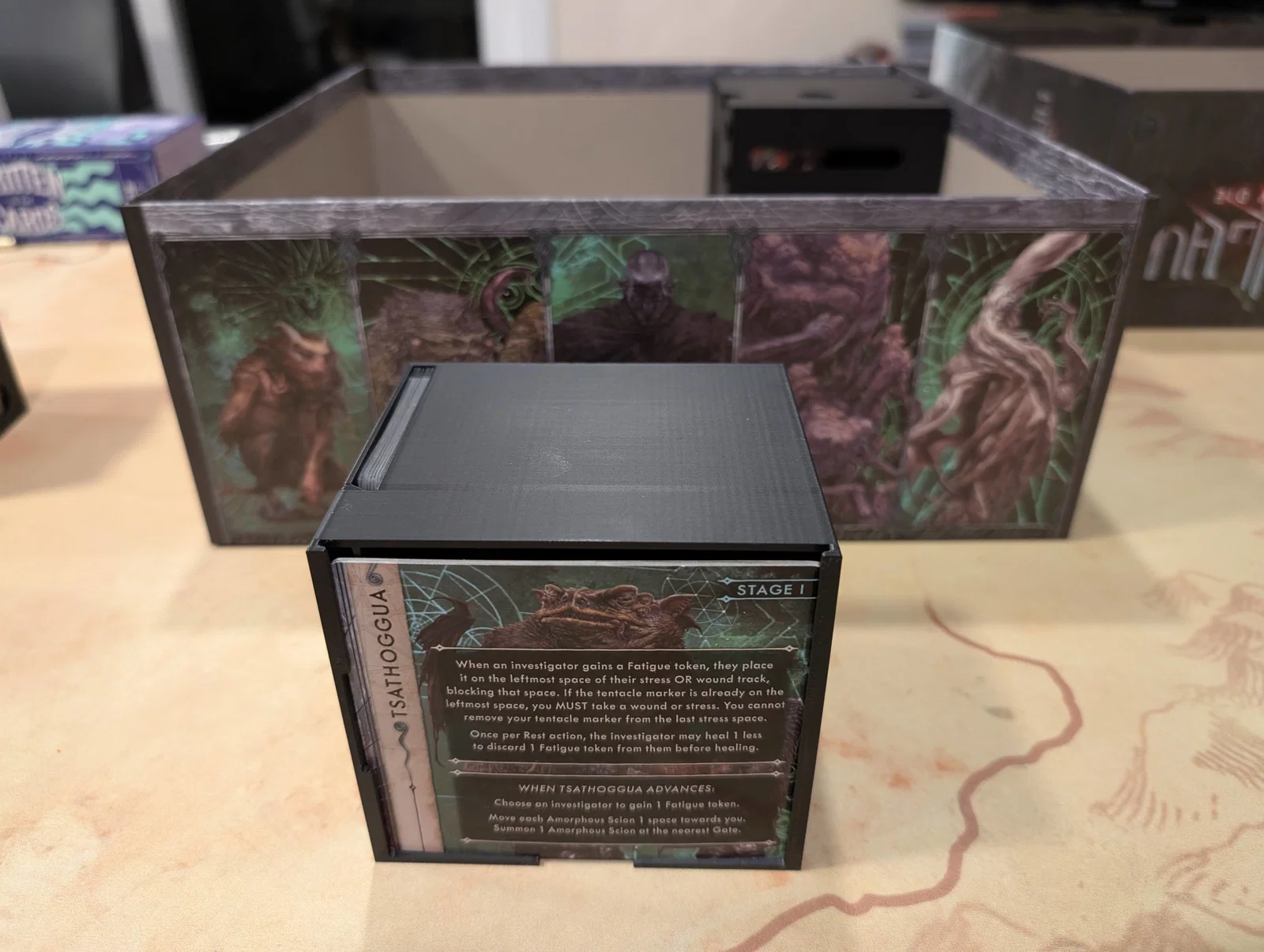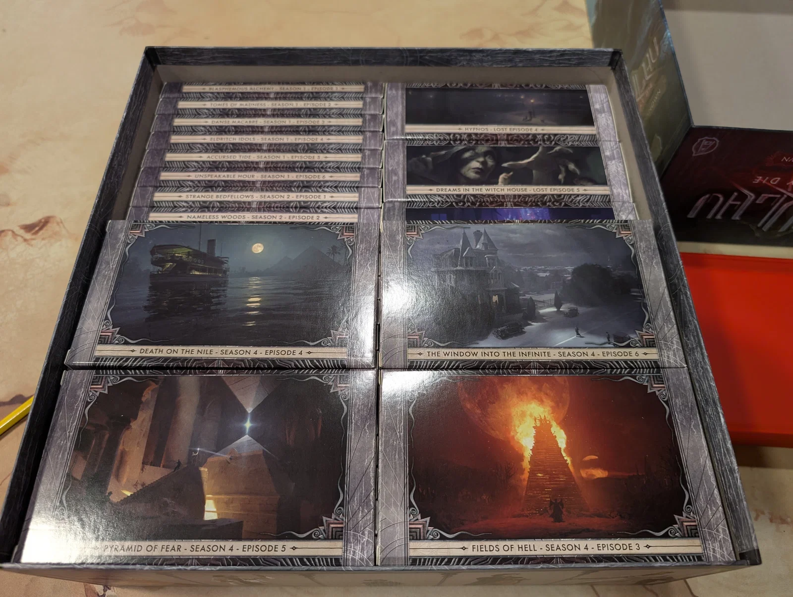 Mọi thứ được sắp xếp rất logic: một hộp cho các miếng ghép bản đồ (tiles), một hộp cho trùm/Elder One (ngoại trừ tên Nyanth chiếm quá nhiều chỗ), một hộp cho mô hình (minis), và hộp cuối cùng cho các tập phim cùng token.