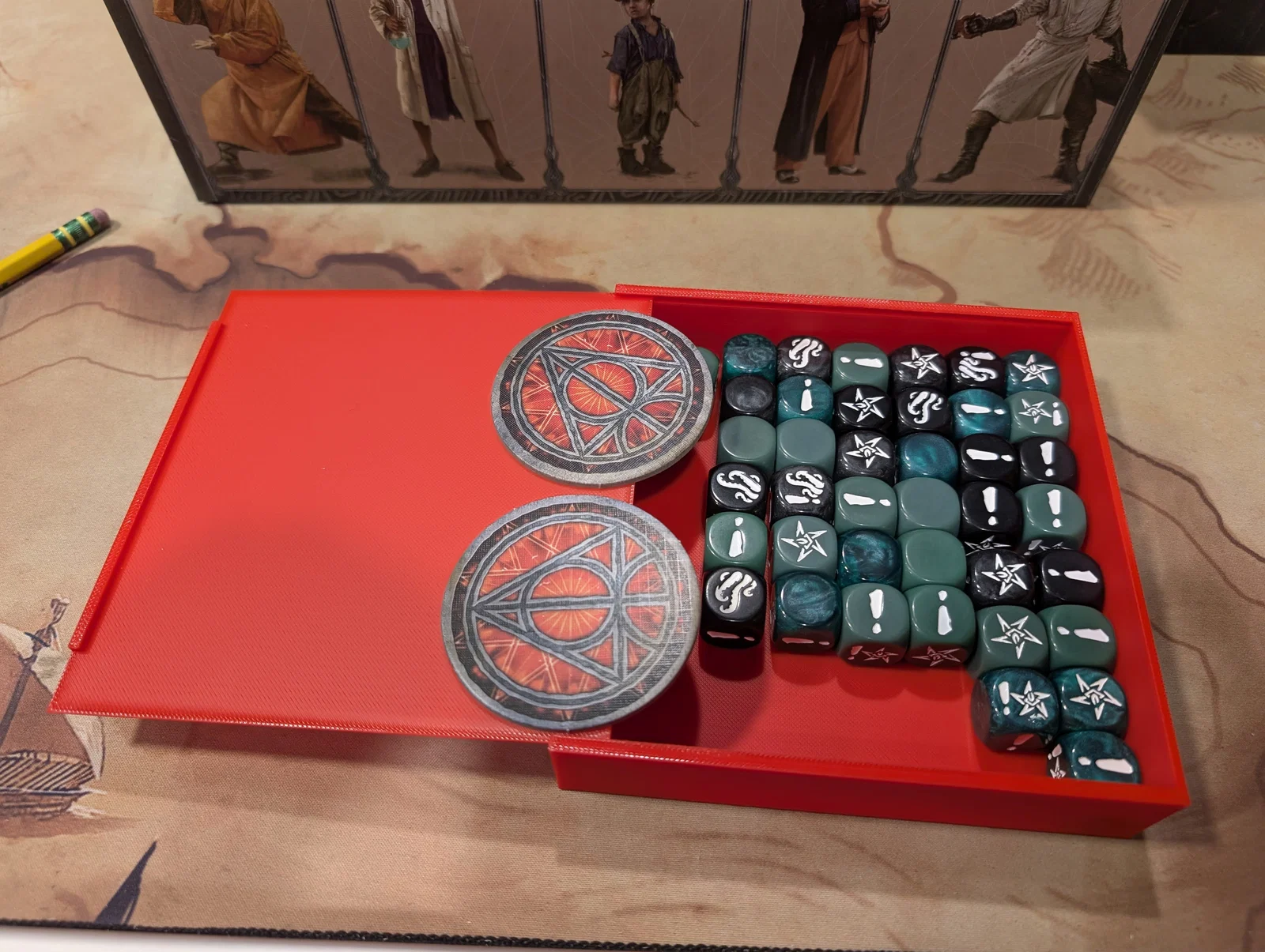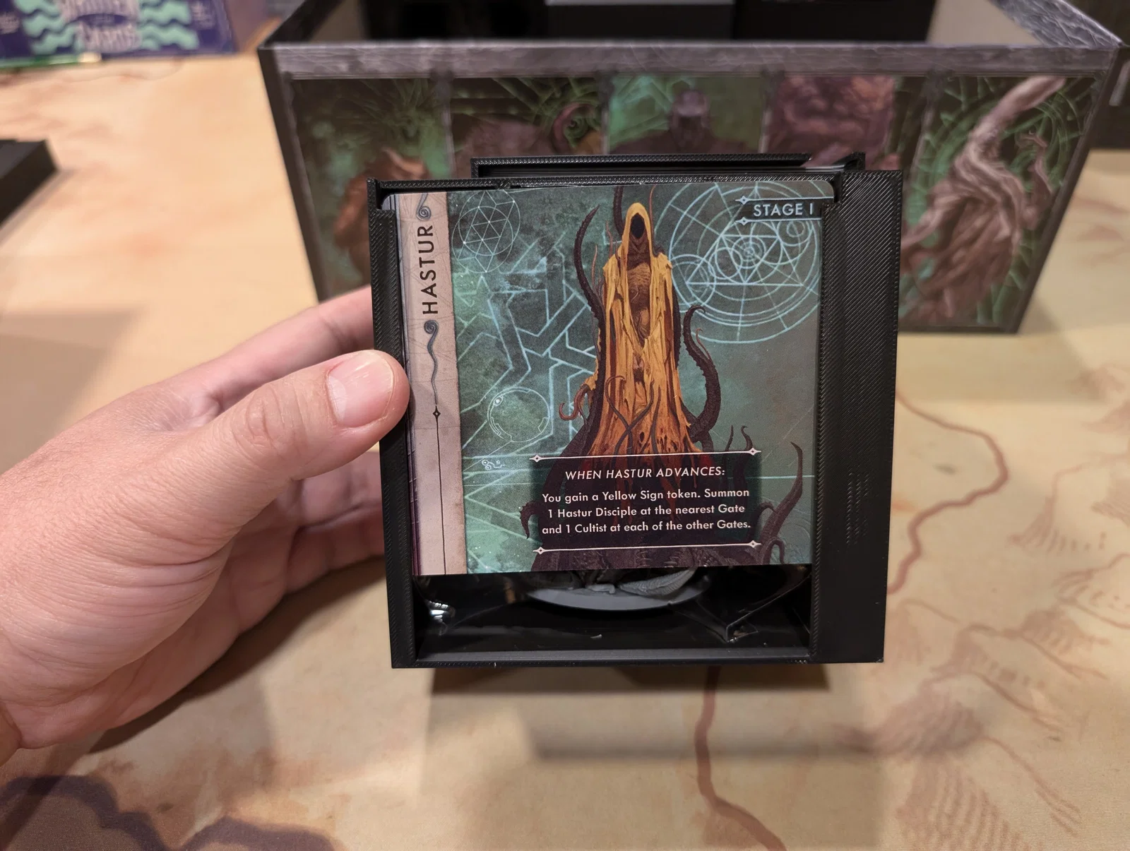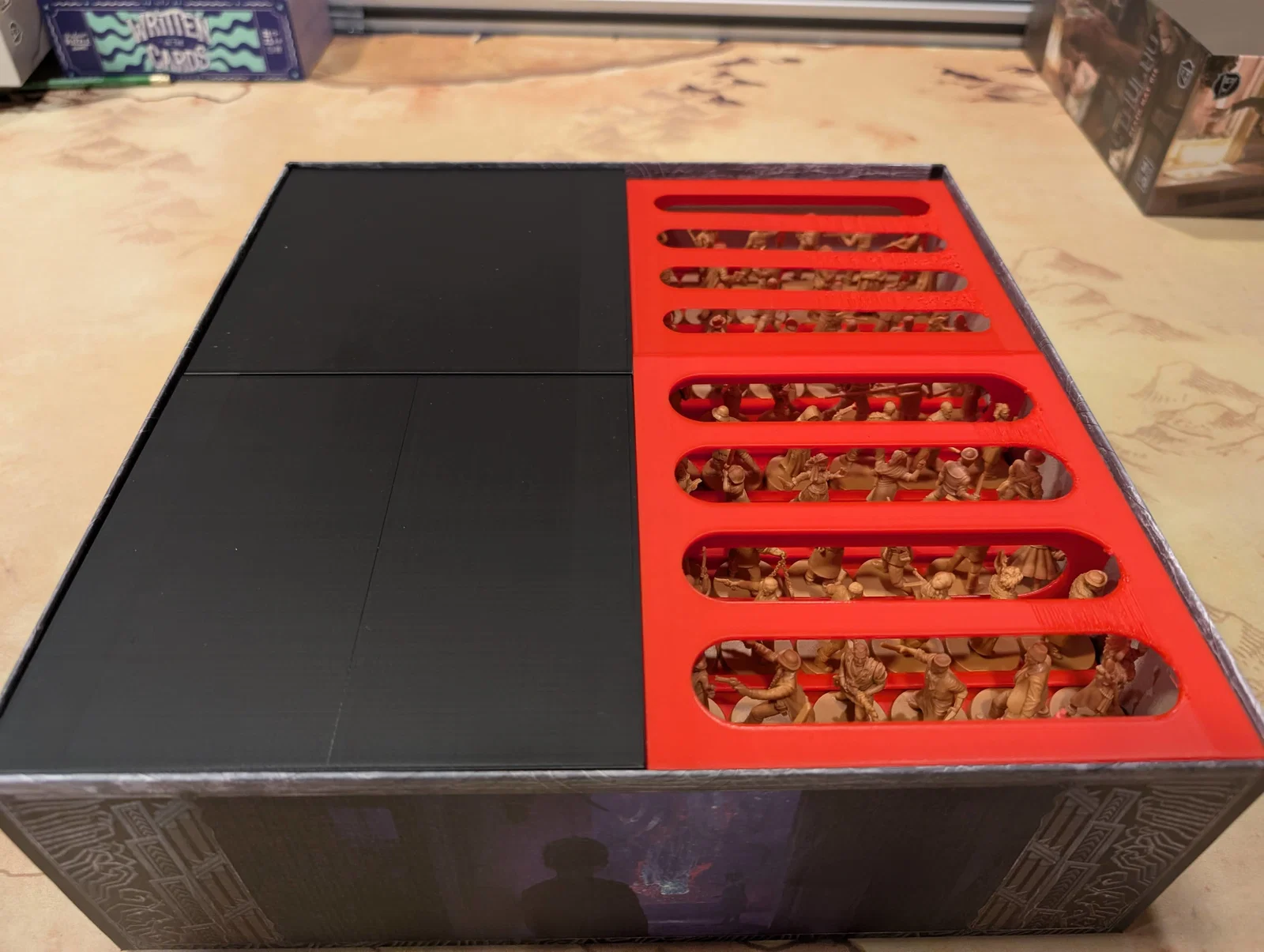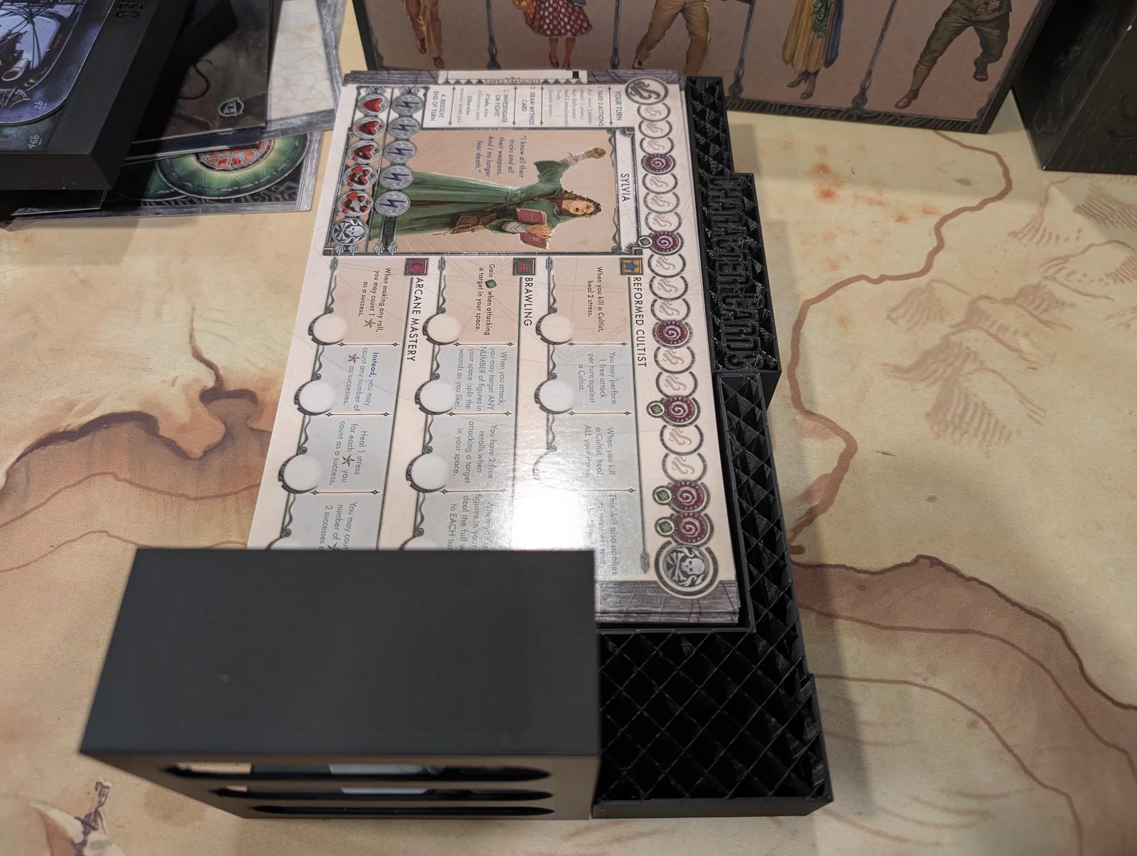 Mọi thứ được sắp xếp rất logic: một hộp cho các miếng ghép bản đồ (tiles), một hộp cho trùm/Elder One (ngoại trừ tên Nyanth chiếm quá nhiều chỗ), một hộp cho mô hình (minis), và hộp cuối cùng cho các tập phim cùng token.