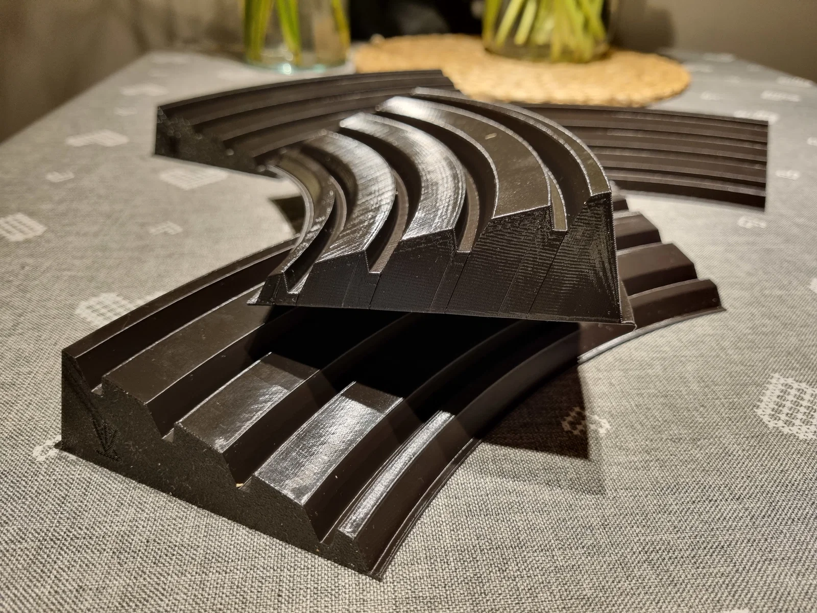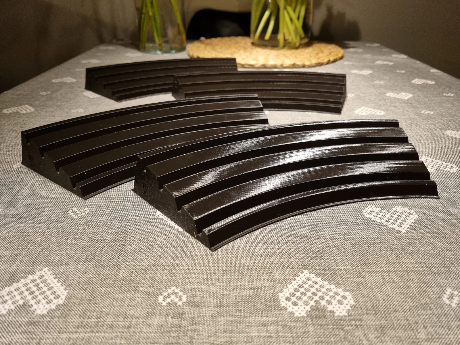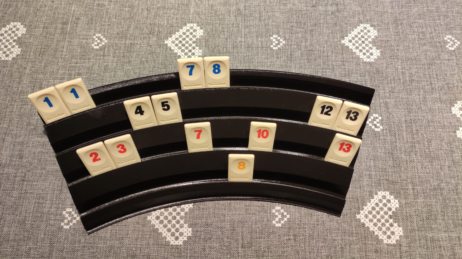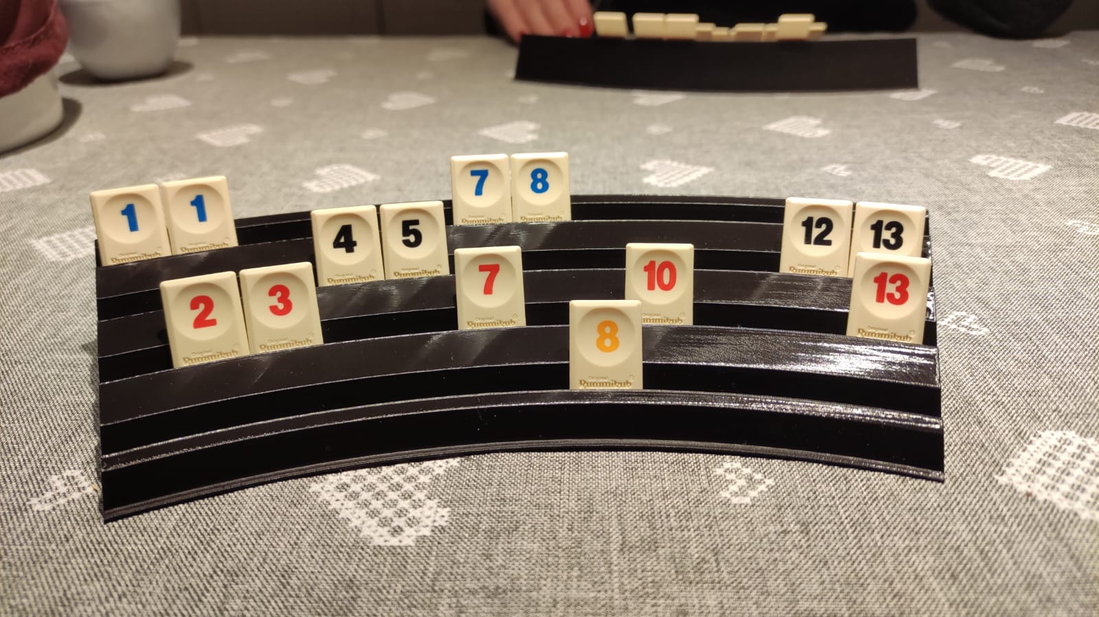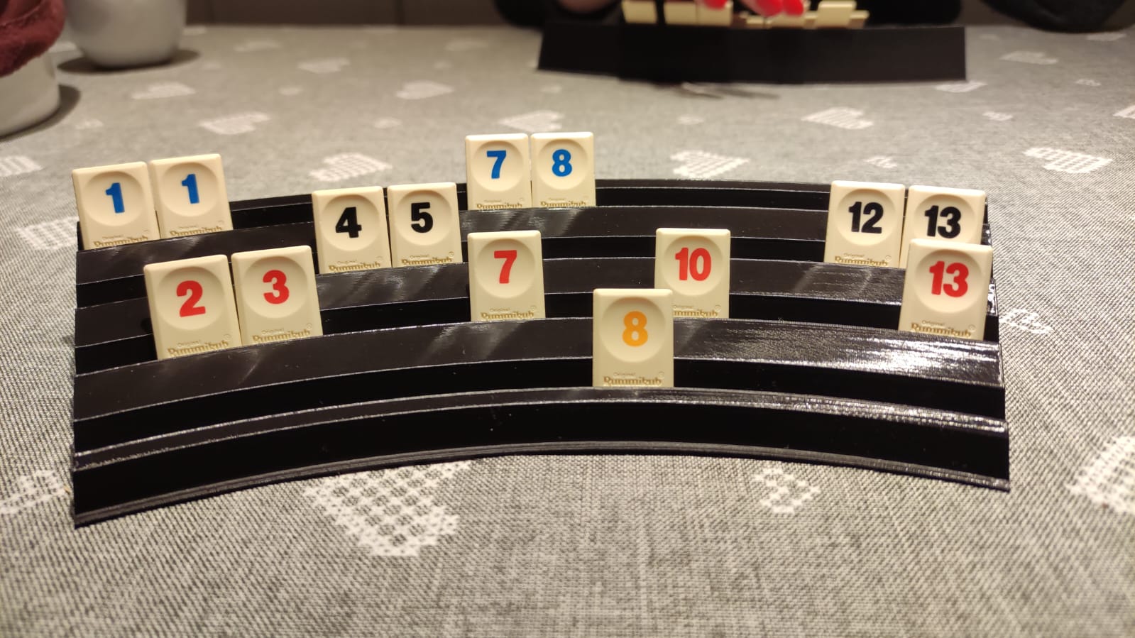 Vì tụi mình chơi Rummikub rất thường xuyên nên đã tối ưu lại cách chơi. Tụi mình dùng bộ du lịch với các quân bài nhỏ hơn, vì vậy mình đã thiết kế giá đỡ xếp chồng tùy chỉnh với bốn rãnh, giúp bạn phân loại từng màu riêng biệt. Nó tiện dụng và thoải mái hơn hẳn loại đi kèm theo bộ bài.