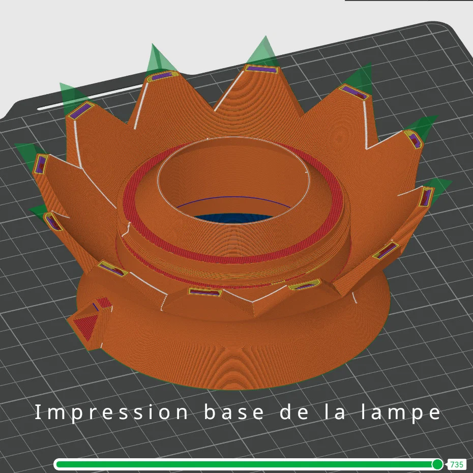 Đèn in rất dễ, không cần support. Mình dùng nozzle 0.8 mm cho cả chao đèn và đế. Mình nghĩ chao đèn cũng có thể in với nozzle 0.6 mm và độ rộng dòng 0.7 mm, nhưng khi đó bạn hãy chỉnh chiều cao lớp in xuống 0.3 mm thay vì 0.35 mm nhé.