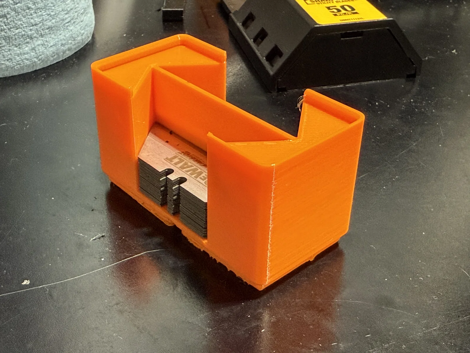 Đây là phiên bản đã được thiết kế lại của khay đựng lưỡi dao, được điều chỉnh để vừa với các loại Lưỡi dao đa năng DeWalt (DeWalt Utility Blades), vốn có kích thước lớn hơn một chút so với mẫu ban đầu. Nếu bạn không chắc liệu lưỡi dao của mình có vừa không, hãy kiểm tra kích thước lưỡi dao sau đây:
