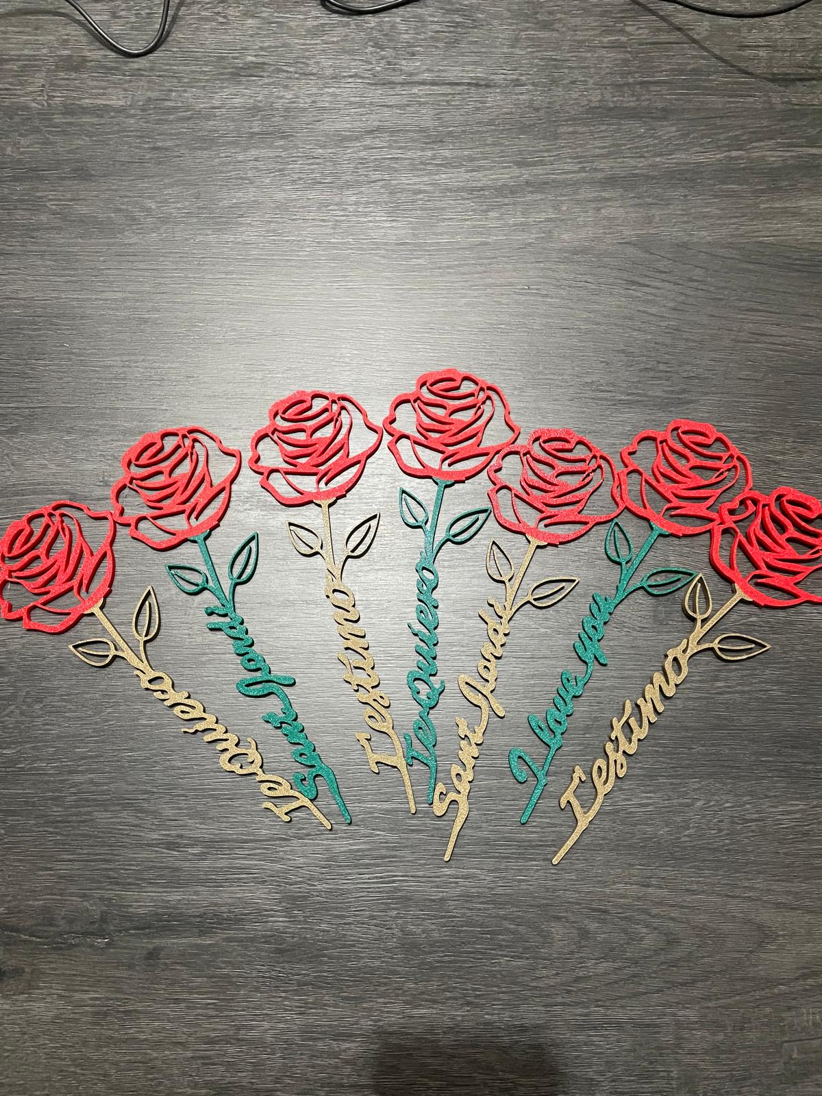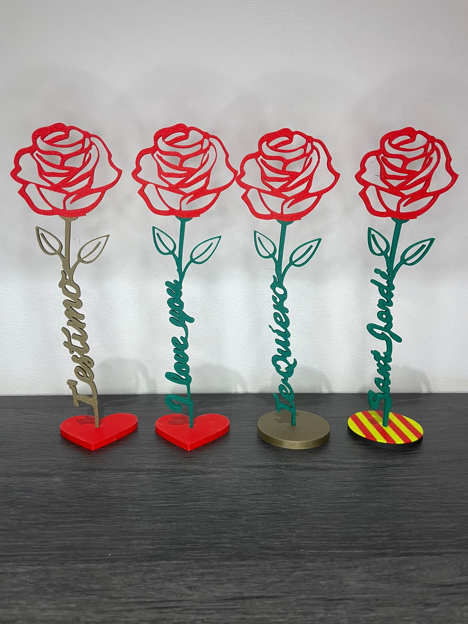 Mẫu hoa hồng lãng mạn với thông điệp khắc trên cành. Bao gồm 4 tùy chọn chữ viết: I Love You, Te Quiero, T'estimo, Sant Jordi cùng 3 mẫu đế đi kèm để trưng bày. Thiết kế tinh xảo, món quà tuyệt vời cho người ấy.