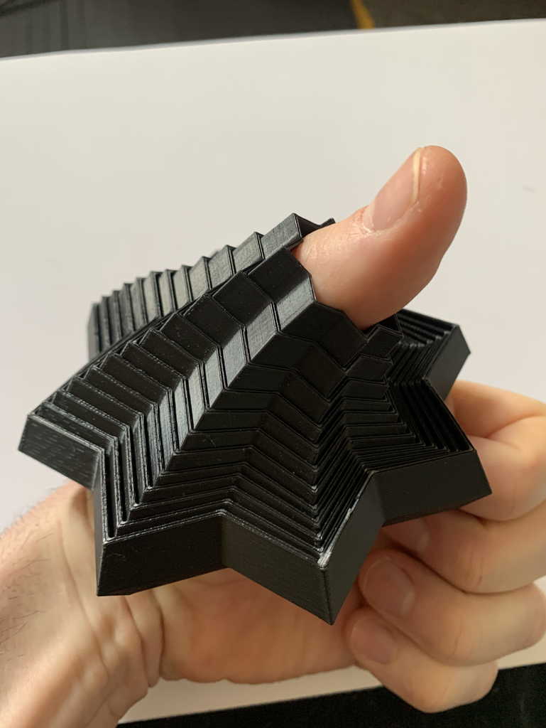 Đây là bản đăng lại của Fractal Fidget Star từ chuuckaduuck. Mô tả gốc từ tác giả: Đồ chơi fidget đỉnh nhất năm 2021. Như các bạn đã thấy trên kênh TikTok @chuuckaduuck của mình, đây là ngôi sao fidget 8 cánh lồng vào nhau. Được sáng tạo vào ngày lễ Thánh Patrick năm 2021. Nó cực kỳ bắt mắt, gây nghiện và giúp thư giãn rất tốt. Hãy in thử xem. Bạn có thể in để bán hoặc làm gì tùy ý!! Rất hoan nghênh mọi sự ủng hộ của các bạn. #### Thông số in Máy in: Ender-3 Bè (Rafts): Không Hỗ trợ (Supports): Không Độ phân giải: 200 Độ lấp đầy (Infill): 20 Thương hiệu nhựa: PolyMaker Màu nhựa: Đen Chất liệu nhựa: PLA * Lưu ý: Đầu in .4mm, độ cao lớp in .2mm