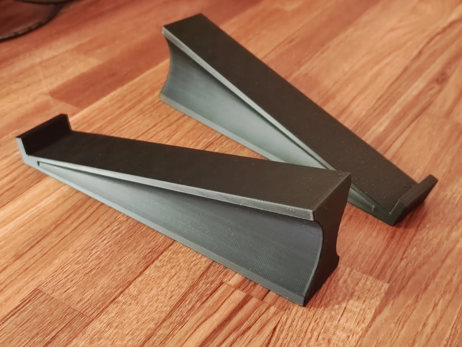 Thiết kế của chiếc chân đế này tập trung tối đa vào sự tối giản và hiệu quả. Điểm cộng lớn nhất là phần lõm thông minh ở thân chân đế, vừa tạo kiểu dáng hiện đại, lại vừa giúp tiết kiệm lượng nhựa in đáng kể mà vẫn đảm bảo độ cứng cáp cần thiết để nâng đỡ máy. Anh em chỉ cần in hai mảnh là đã có ngay một bộ giá đỡ chắc chắn, không lo bị chênh vênh khi đang hăng say sáng tác nhạc.