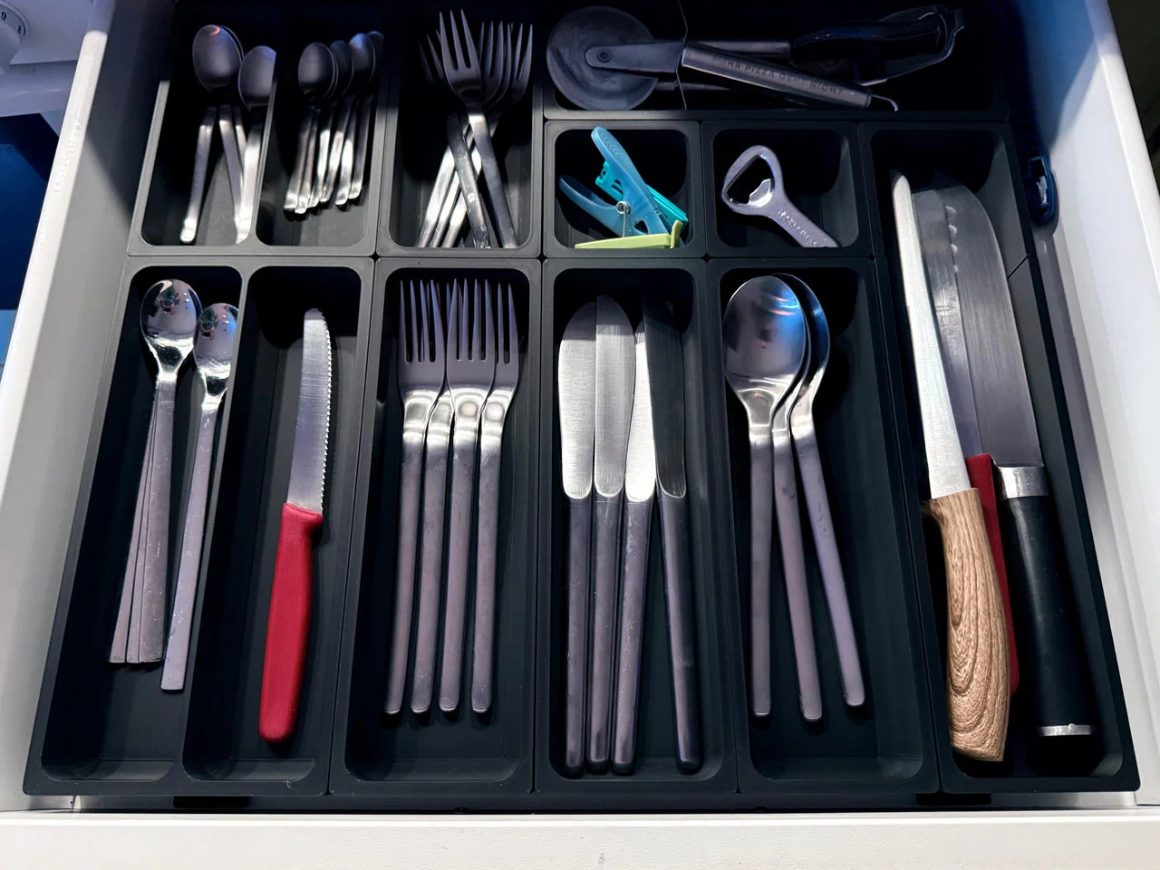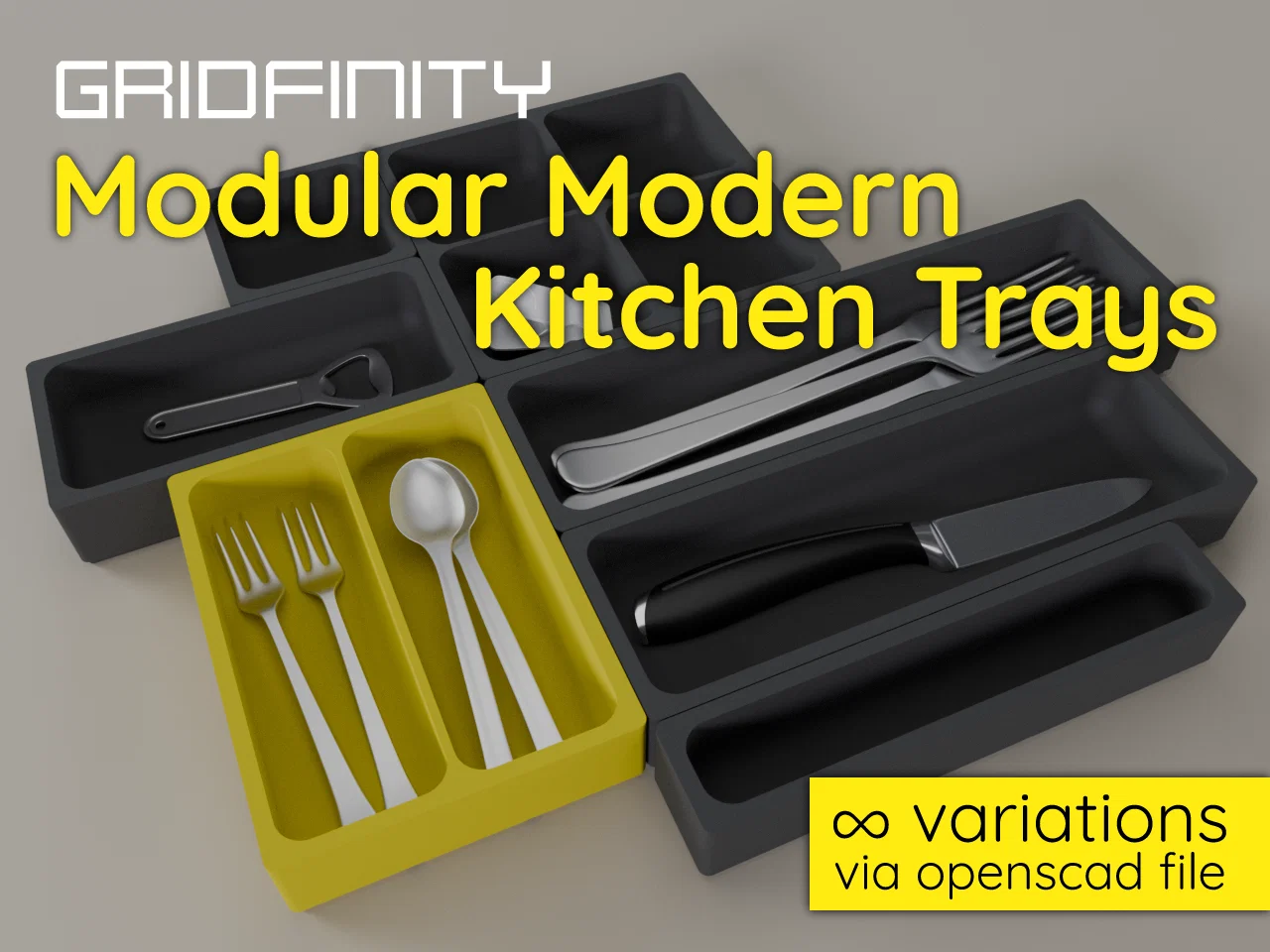 Khay đựng đồ nhà bếp tiện lợi được thiết kế dựa trên hệ thống Gridfinity. Phù hợp để sắp xếp dao muỗng nĩa hoặc đồ dùng khác. Bao gồm file OpenSCAD để bạn tùy chỉnh kích thước theo ý muốn.
