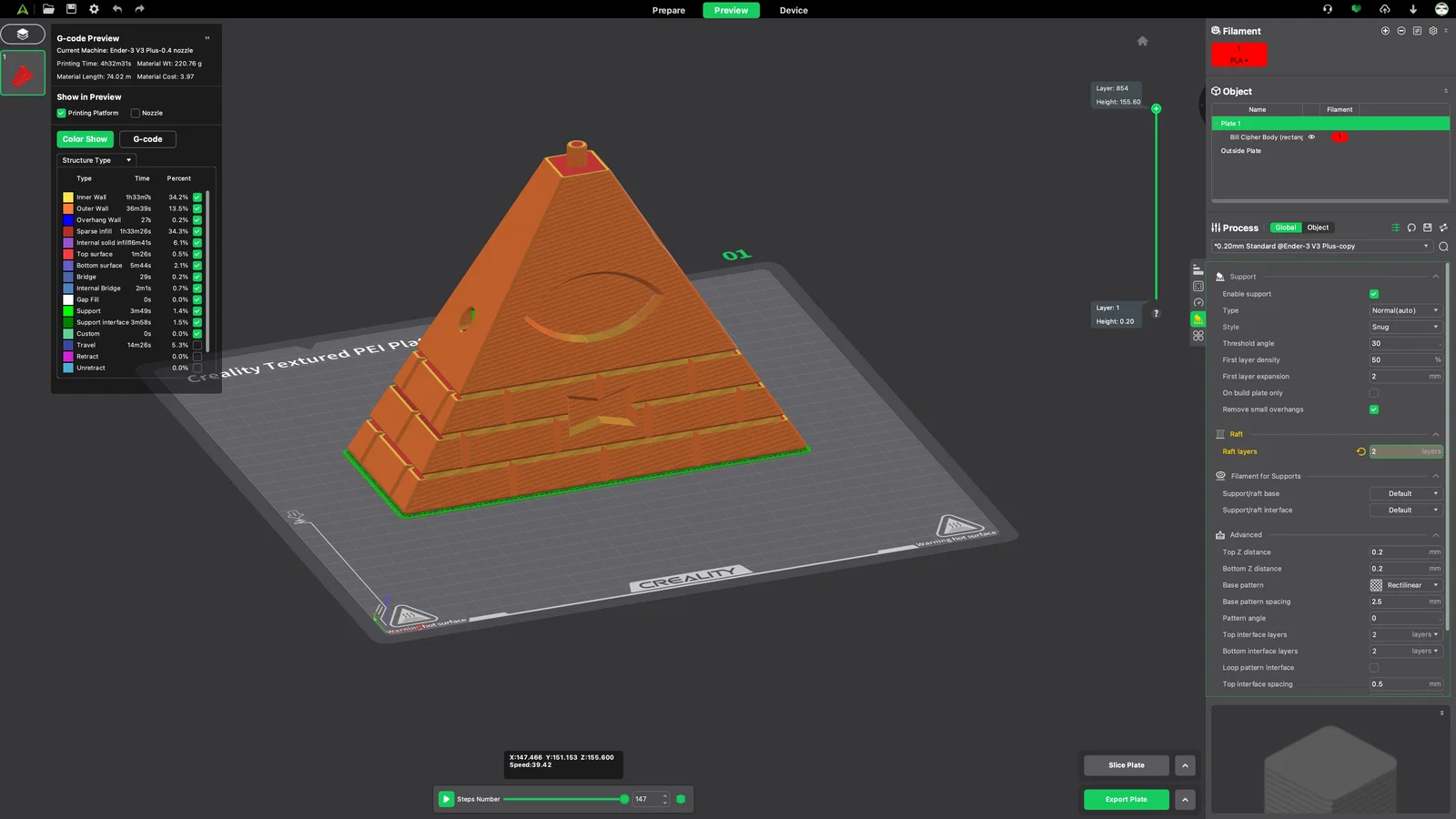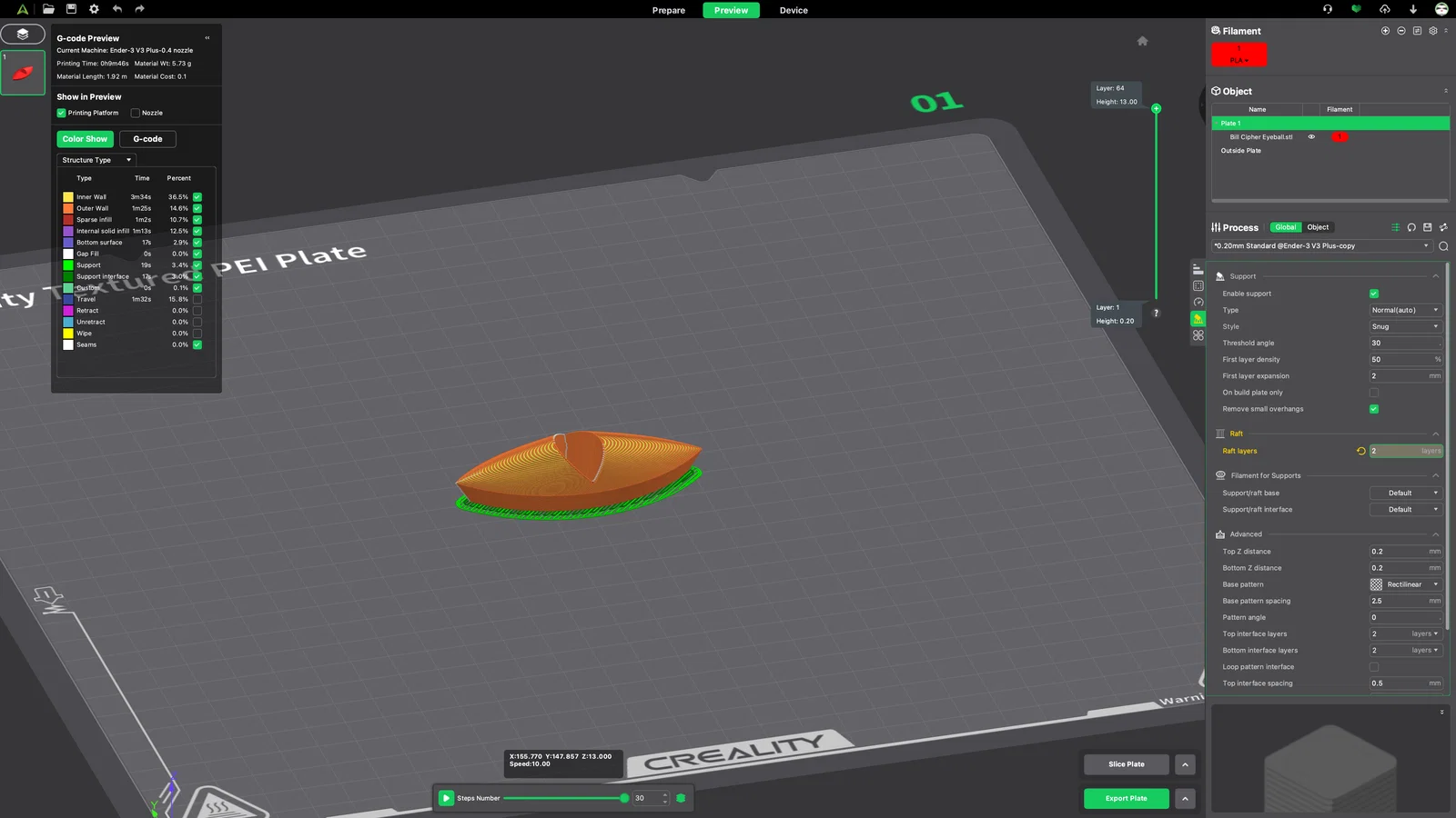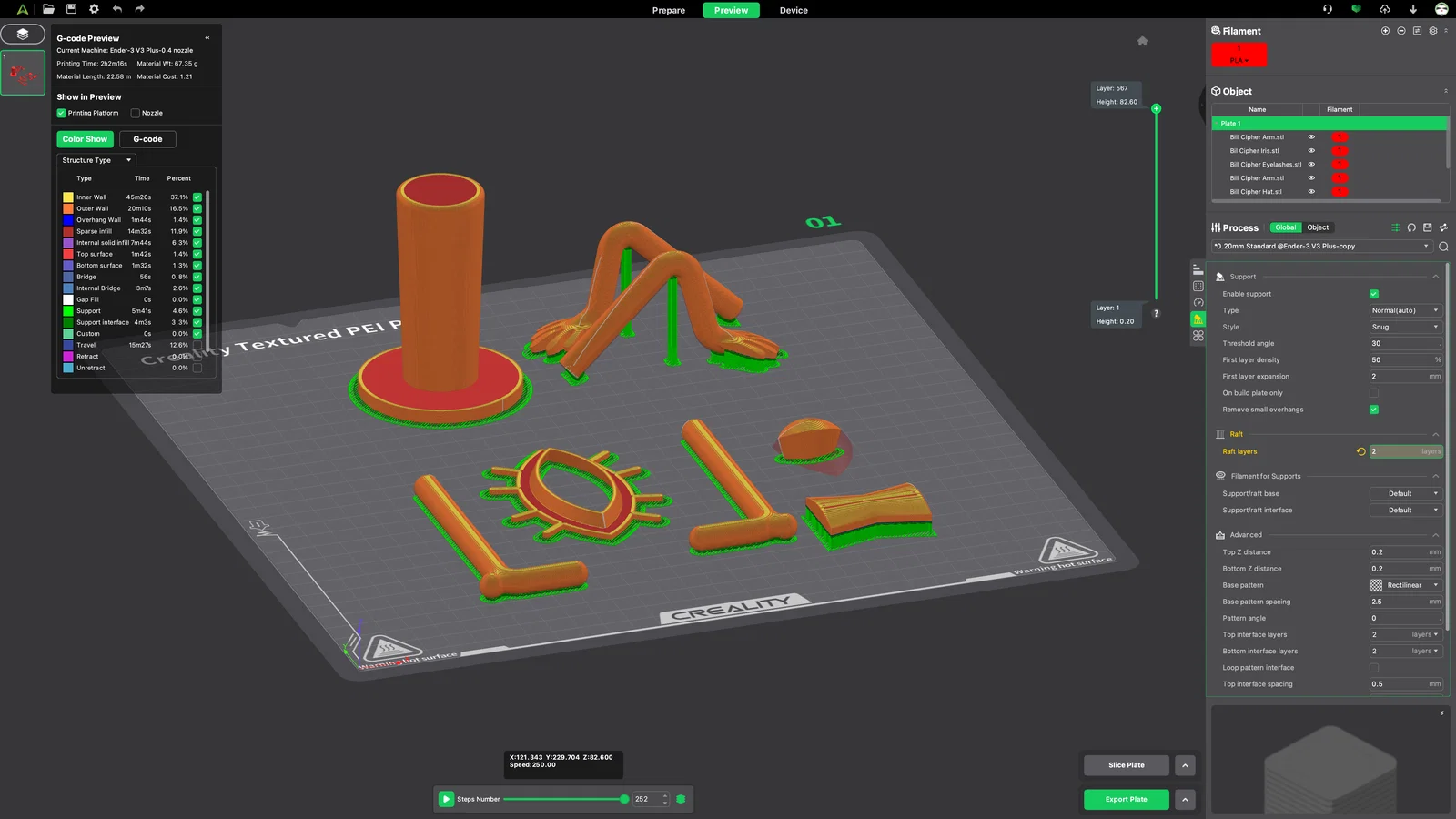 Mình có đính kèm ảnh chụp khay in (build plate) để mọi người tham khảo cách đặt hướng chi tiết và phần hỗ trợ (supports) mà mình đã dùng. Lưu ý nhỏ là có thể xuất hiện một bề mặt dư thừa trên file STL “Bill Cipher Iris” trong phần mềm slicer, nhưng nó sẽ tự biến mất khi bạn tiến hành slice và in.