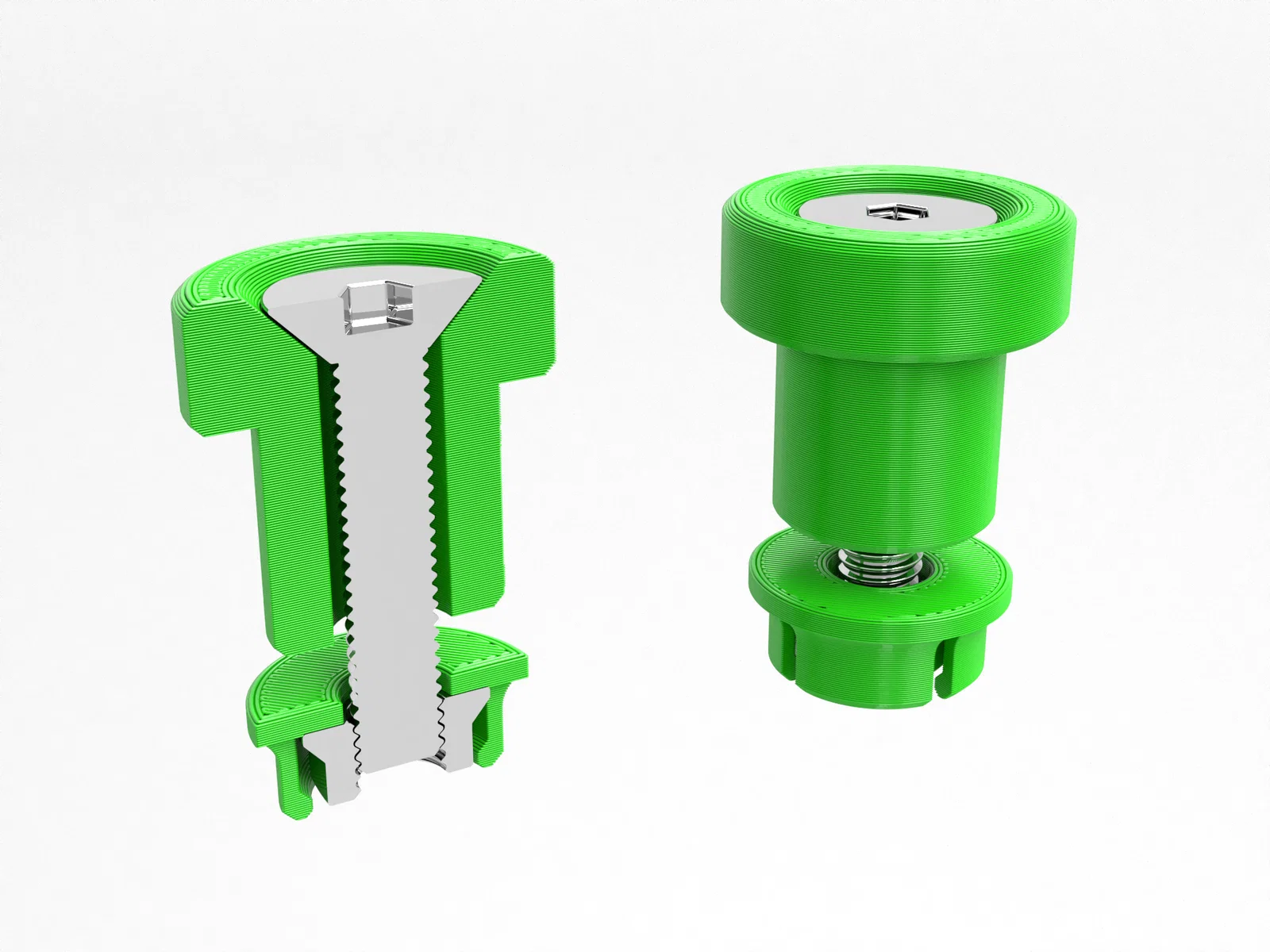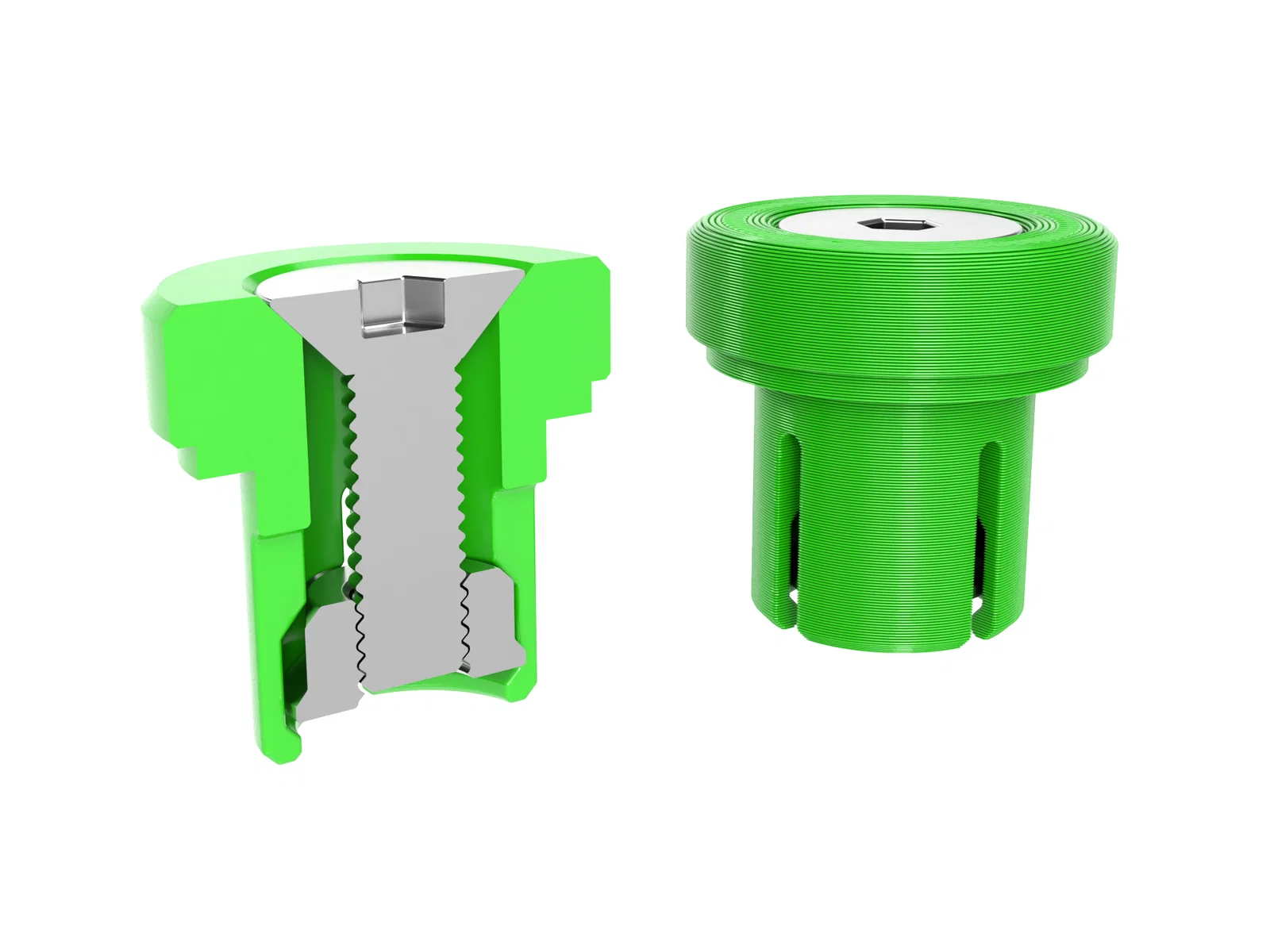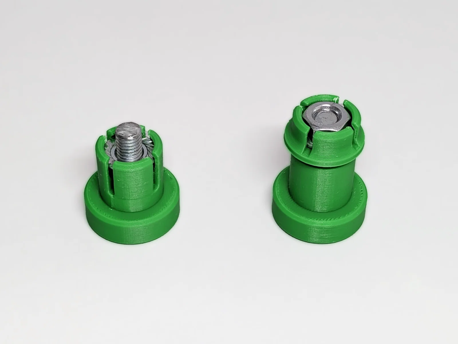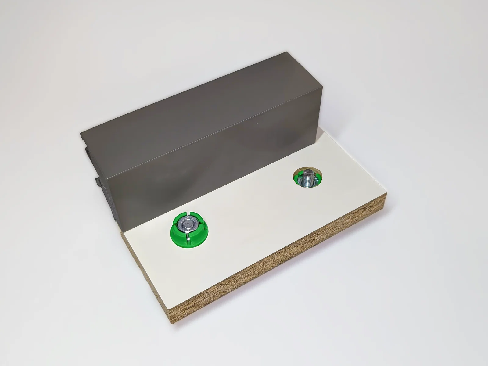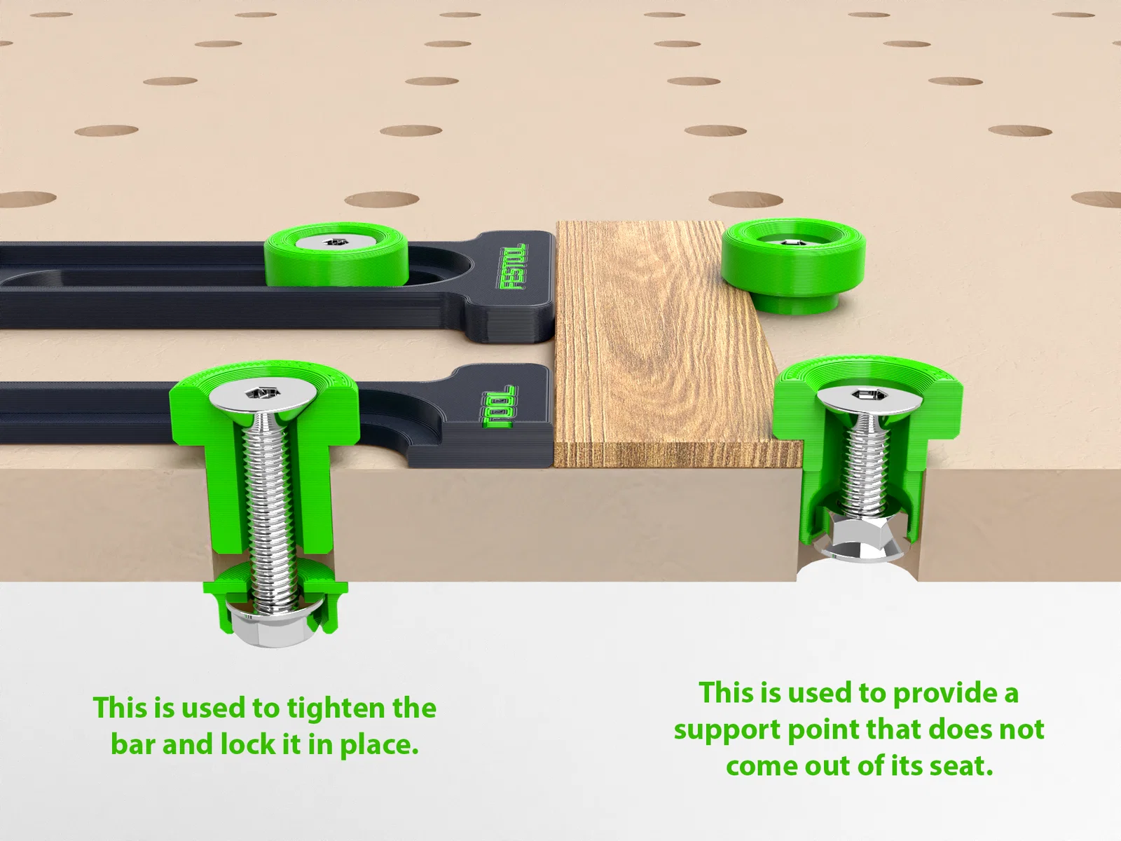 Cả hai đều có hệ thống khóa bằng vít đầu âm M8x25 mm và đai ốc M8 mặt bích. Đai ốc M8 được lắp ép vào trong chốt. Chốt này giúp cố định vật liệu vững chắc trên bàn dù có rung lắc hay va đập liên tục.