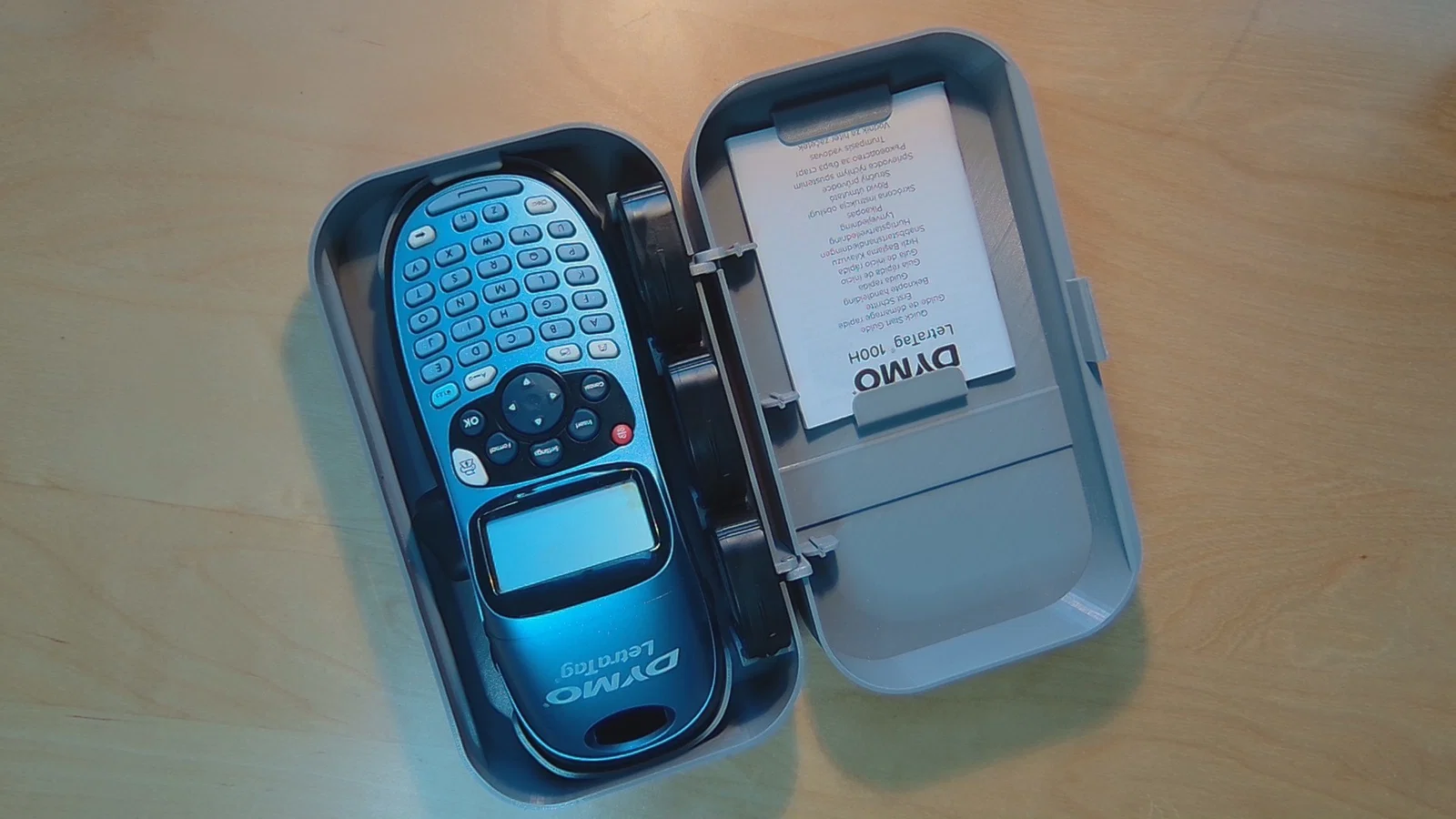 Hộp đựng cho máy in nhãn Dymo LetraTag 100H, kèm sách hướng dẫn và 3 băng nhãn dự phòng.