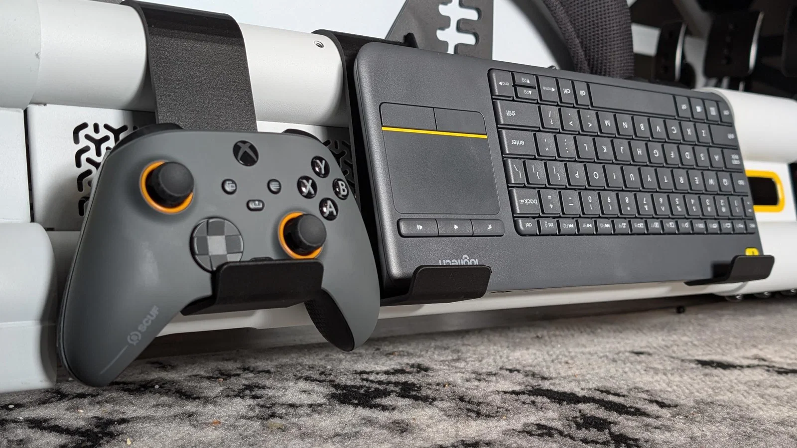 Nếu anh em nào đang sở hữu bộ khung ghế đua (sim racing cockpit) của Fanatec Clubsport GT mà thấy không gian làm việc hay chơi game của mình hơi bừa bộn, thì đây chính là món đồ phụ kiện không thể thiếu. Mẫu móc treo đa năng này được thiết kế cực kỳ thông minh, giúp anh em tận dụng triệt để phần khung ống của ghế để treo những món đồ chơi như bàn phím không dây, tay cầm chơi game hoặc các phụ kiện nhỏ gọn khác. Thay vì để bàn phím nằm lăn lóc trên ghế hay dưới sàn, giờ đây anh em đã có một vị trí cố định, ngăn nắp và cực kỳ chuyên nghiệp.