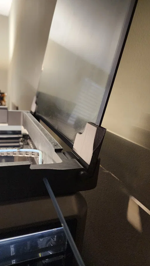 Mẫu này sử dụng chốt thép không gỉ 5 x 60mm làm chốt bản lề, nhưng bạn cũng có thể dễ dàng sửa lại để dùng ốc vít nếu muốn. Mình khuyên dùng chốt trơn để dễ lắp/tháo và giảm ma sát theo thời gian. Hãy cho mình biết nếu bạn cần phiên bản dùng ốc vít nhé. Nắp khớp chặt vào từng giá đỡ bản lề mà không cần keo hay băng dính. Điều này giúp bạn dễ dàng tháo các góc bản lề để vệ sinh kính, một việc rất cần thiết sau nhiều giờ in ABS/ASA như trong ảnh mình đã chụp (nhìn hơi ghê nhỉ).