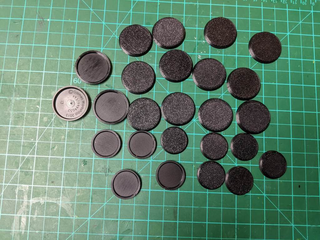 Các đế mini kích thước tiêu chuẩn, cực kỳ giống với loại đế của "công ty lớn có nhiều luật sư" nổi tiếng. Mình thường in ngược các đế này trên tấm nền có vân nhám, kết quả trông giống hệt đế zin. Rất phù hợp để anh em làm đế cho đội quân space grunt in 3D với mấy cây súng khổng lồ của mình.