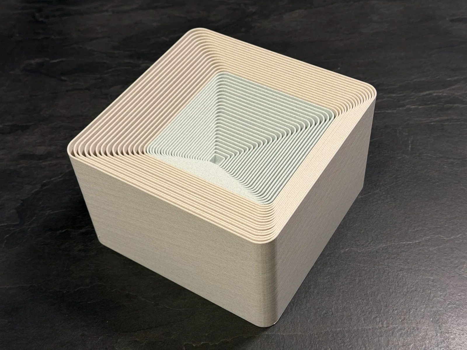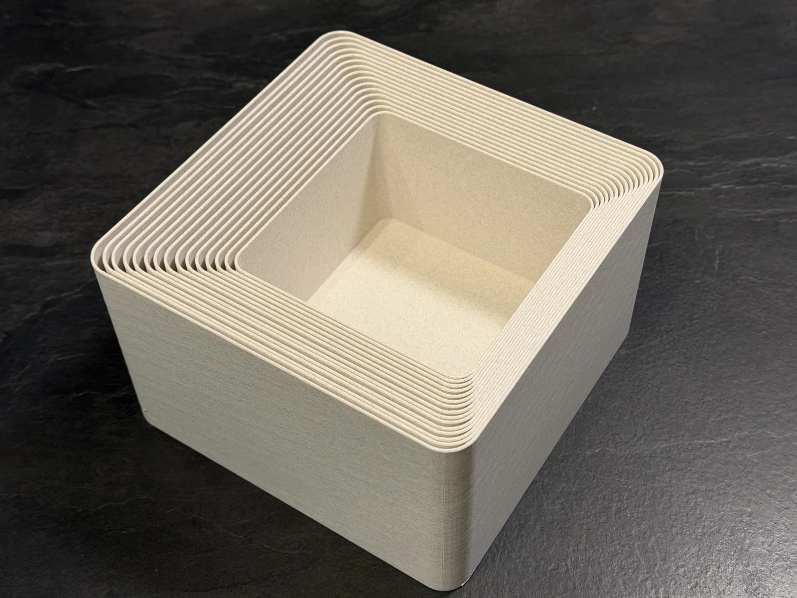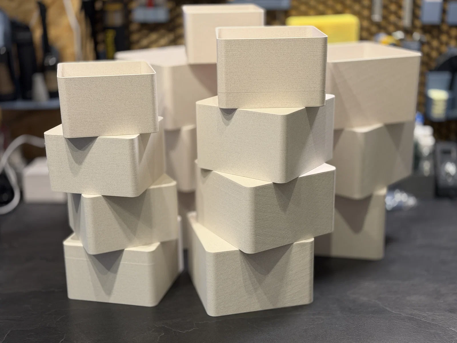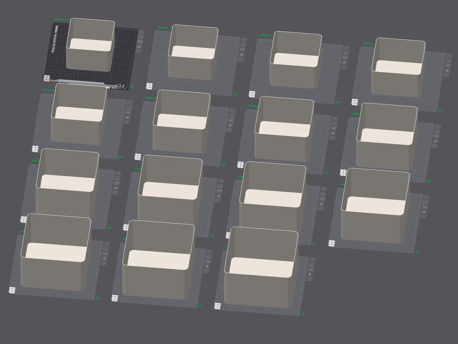 Mình thường xuyên cần các loại hộp để sắp xếp linh kiện in 3D và nhiều đồ đạc khác, nhưng mấy cái hộp bình thường lại chiếm quá nhiều diện tích khi không dùng đến. Thế nên mình đã thiết kế với khả năng lồng vào nhau hoàn hảo. Đây là bản mở rộng với các kích thước hộp lớn hơn, vẫn có thể xếp chồng gọn gàng vào trong nhau. Kích thước từ 130x130mm đến 200x200mm. Mỗi hộp sẽ lớn hơn hộp trước đó 5mm. Dưới đáy mỗi hộp có in sẵn con số nhỏ để chỉ kích thước. Lưu ý nhỏ: Bạn sẽ cần khá nhiều filament cho bộ này đó nha!