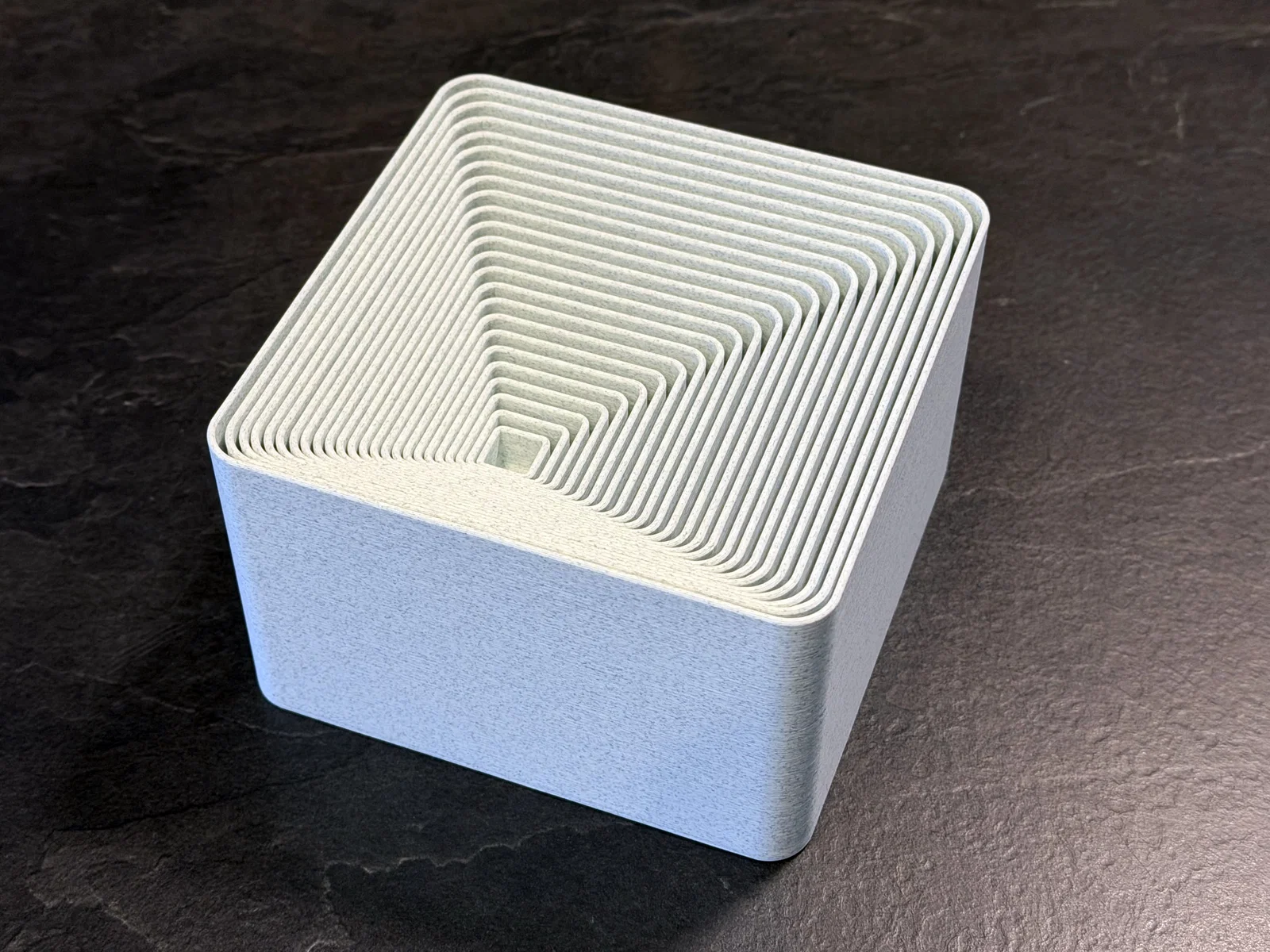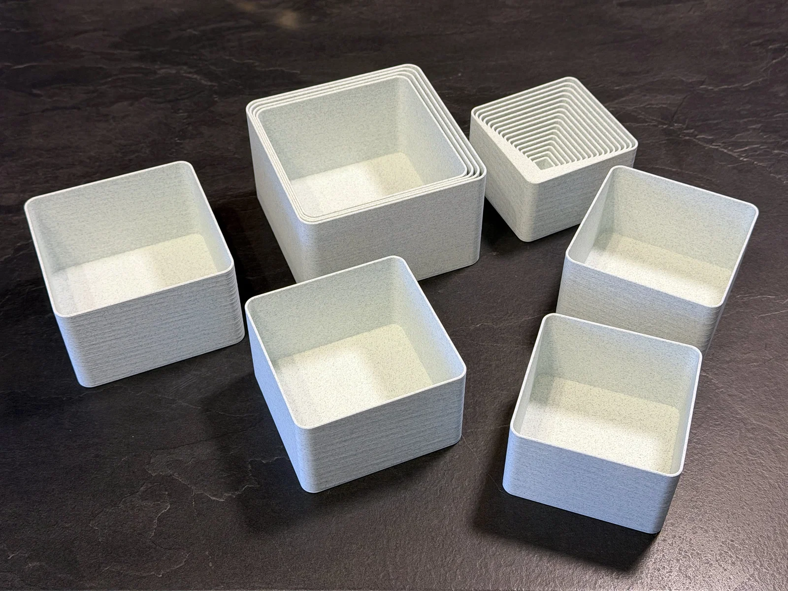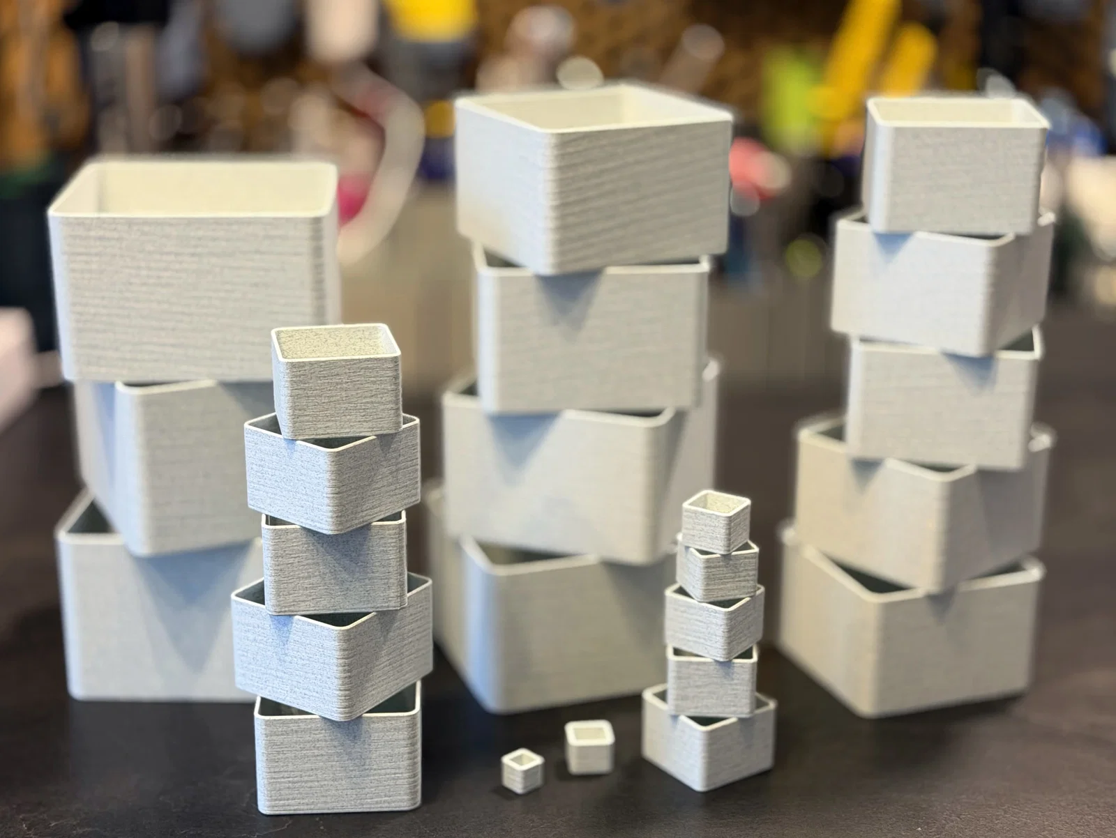 Mình thường xuyên cần hộp để sắp xếp các linh kiện đã in và mấy món đồ nhỏ linh tinh, nhưng mấy cái hộp bình thường chiếm quá nhiều diện tích khi không dùng tới. Thế nên mình đã tạo ra bộ 24 chiếc hộp này, chúng hoàn toàn có thể lồng vào nhau, cực kỳ tiết kiệm không gian. Kích thước từ 10x10mm đến 125x125mm. Mỗi chiếc hộp lớn hơn chiếc trước đó 5mm. Trên đáy mỗi hộp đều có đánh số nhỏ để bạn biết kích thước. Tổng cộng bộ này tốn khoảng 960g nhựa filament. Mình cũng có làm thêm một bộ mở rộng với kích thước lớn hơn từ 130mm đến 200mm nữa đó…