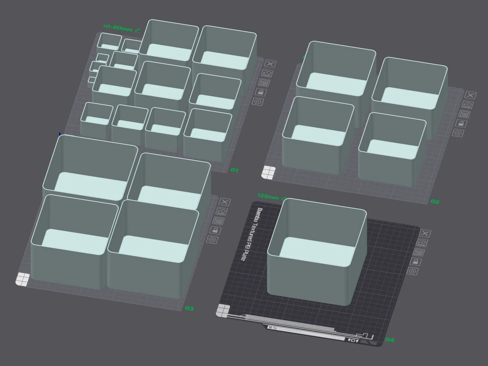 Bộ sưu tập gồm 24 chiếc hộp được thiết kế thông minh để có thể lồng gọn vào nhau, giúp bạn tối ưu không gian lưu trữ các món đồ nhỏ. Kích thước linh hoạt từ 10mm đến 125mm, hỗ trợ sắp xếp vật dụng in 3D gọn gàng, ngăn nắp và tiết kiệm diện tích.
