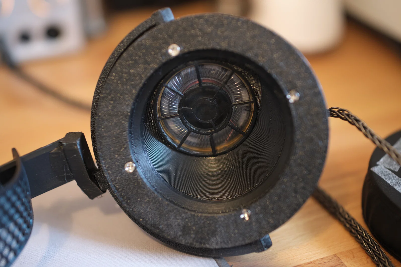 Thiết kế tai nghe dựa trên driver Peerless Tymphony 50mm. Đây là một dự án thử nghiệm đang trong quá trình phát triển nhằm khám phá thiết kế driver đặt nghiêng. Tôi đã để lắp vừa với các củ tai này và headband capra. Dự án này nằm trong chuỗi thử nghiệm liên tục của tôi. Mọi kiến thức rút ra được tôi đã ghi chép tại đây: https://www.head-fi.org/threads/diy-3d-printed-headphone-journey.979090/ BOM (Danh sách vật liệu): Drivers - Peerless 50mm Pads - Brainwavz XL Hybrid Cable Connectors - PJ392 3.5mm Screws - M3 FHCS 6, 8 và 10mm Threaded Inserts - M3 Heat Set Adhesive - Băng dính hai mặt Hướng dẫn: Earpads - Vòng gắn pad (pad ring) được đặt vào bên trong đệm tai để giữ căng phần ngàm gắn. Sau đó đệm tai được gắn vào củ tai bằng băng dính hai mặt hoặc keo dán. Driver Grill - Phần này được gắn vào bên trong thân chính từ phía lỗ mở đằng trước, không phải từ phía gắn driver. Hãy sử dụng keo siêu dính hoặc loại keo phù hợp khác.