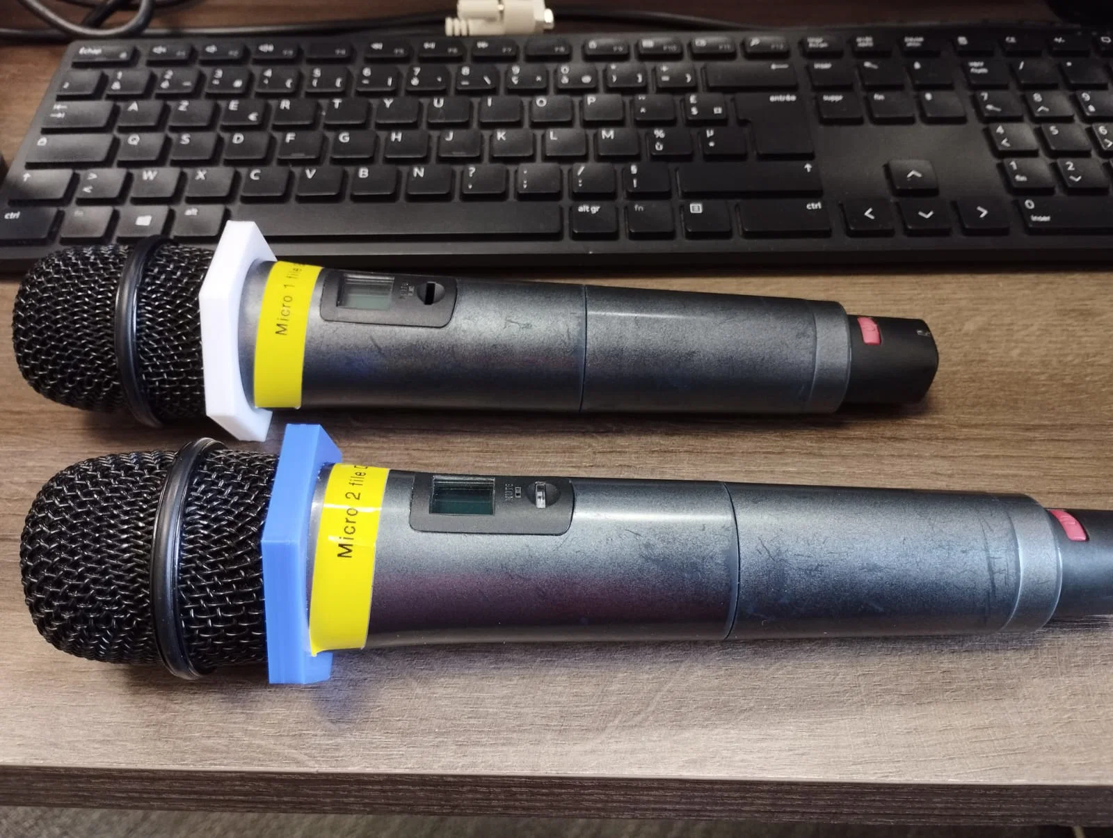 Phụ kiện này giúp giữ cho micro không bị lăn đi khi đặt trên bàn, ví dụ như lúc mình thay pin chẳng hạn. Mọi người có thể in ra bằng nhiều màu sắc khác nhau để dễ nhận diện micro hơn nhé.