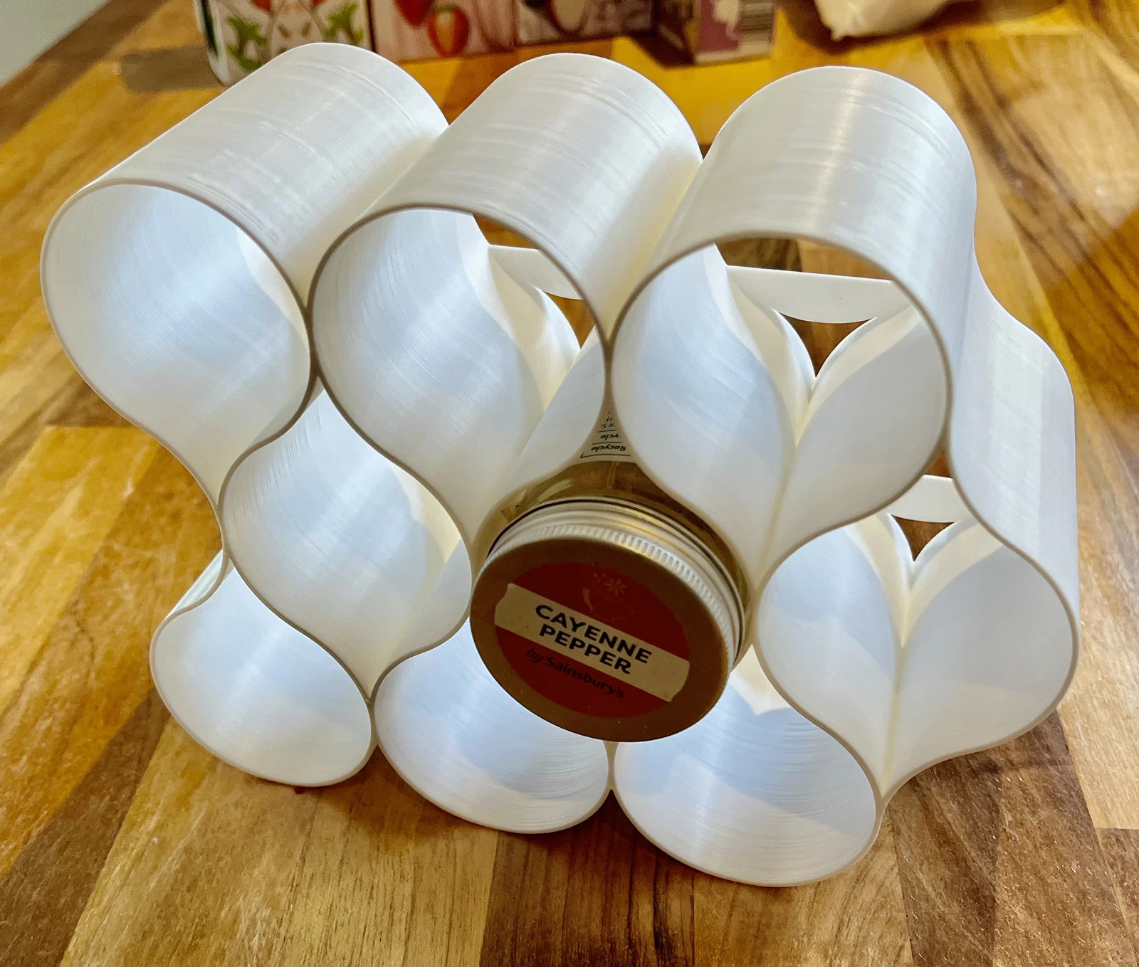 Kệ đựng gia vị đơn giản, dạng module và cực kỳ dễ in. Kệ phù hợp với các loại hũ có đường kính lên tới 50mm (vừa với hầu hết các hũ gia vị mua ngoài tiệm), kể cả hũ vuông. Kệ gia vị được thiết kế dạng 3x3 và có tính module - mình đang dùng 4 cái, đặt 2 cái cạnh nhau và 2 cái chồng lên trên. Thiết kế này không cần in support, giúp tiết kiệm tối đa nguyên liệu và thời gian in.