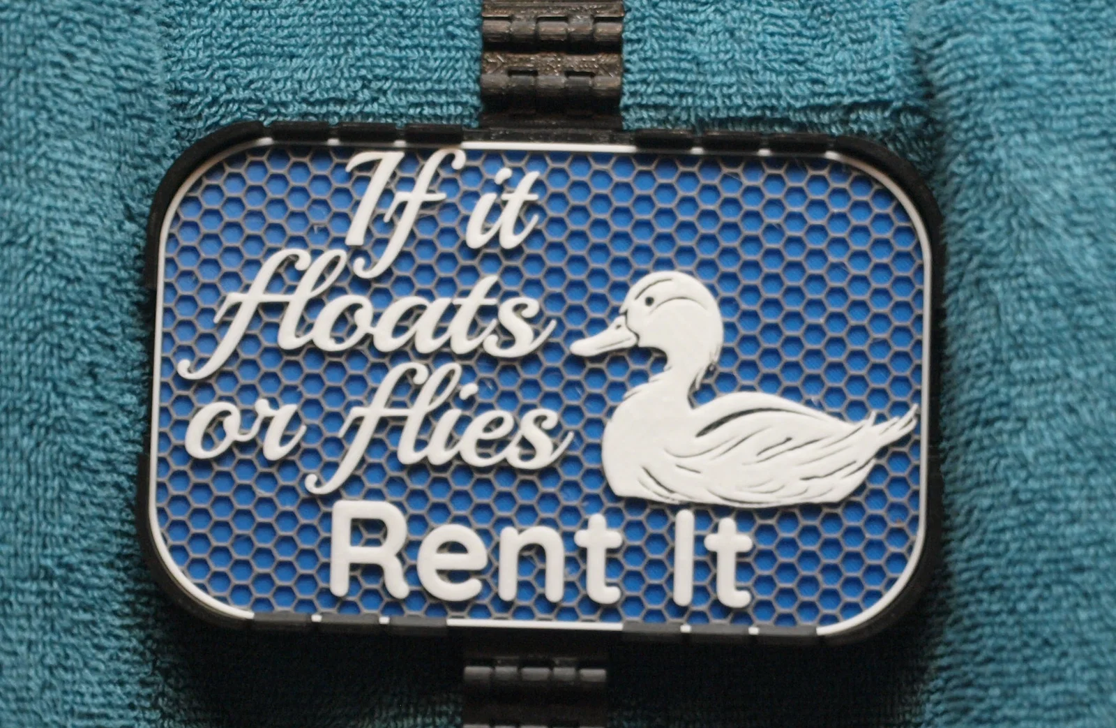 Bảng hiệu kích thước 100x160mm, có hình con vịt với dòng chữ "If it floats or flies, Rent It" (Nếu cái gì nổi hoặc bay được, hãy cho thuê nó).