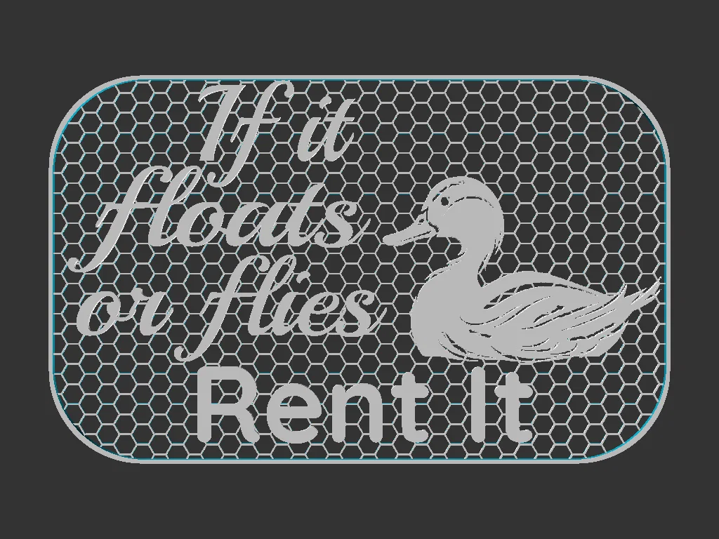 Bảng hiệu kích thước 100x160mm in 3D với hình con vịt và thông điệp hài hước về việc cho thuê. Tệp bao gồm định dạng Mesh và Solid, tối ưu để đổi màu in trên 1mm. Phù hợp hoàn hảo với các mẫu khung Shadowbox của tác giả.
