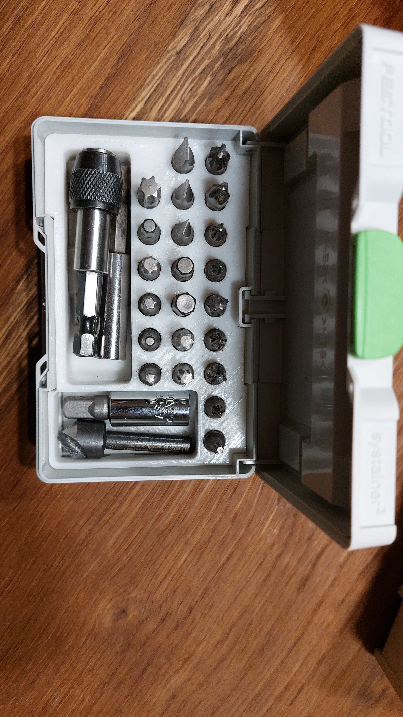 Giải pháp sắp xếp các mũi khoan và đầu giữ mũi khoan thường dùng vào hộp Tanos Systainer³ XXS 33 một cách gọn gàng, ngăn nắp. Thiết kế tối ưu, có thể xếp chồng, in bằng nhựa PLA với sự hỗ trợ của support.