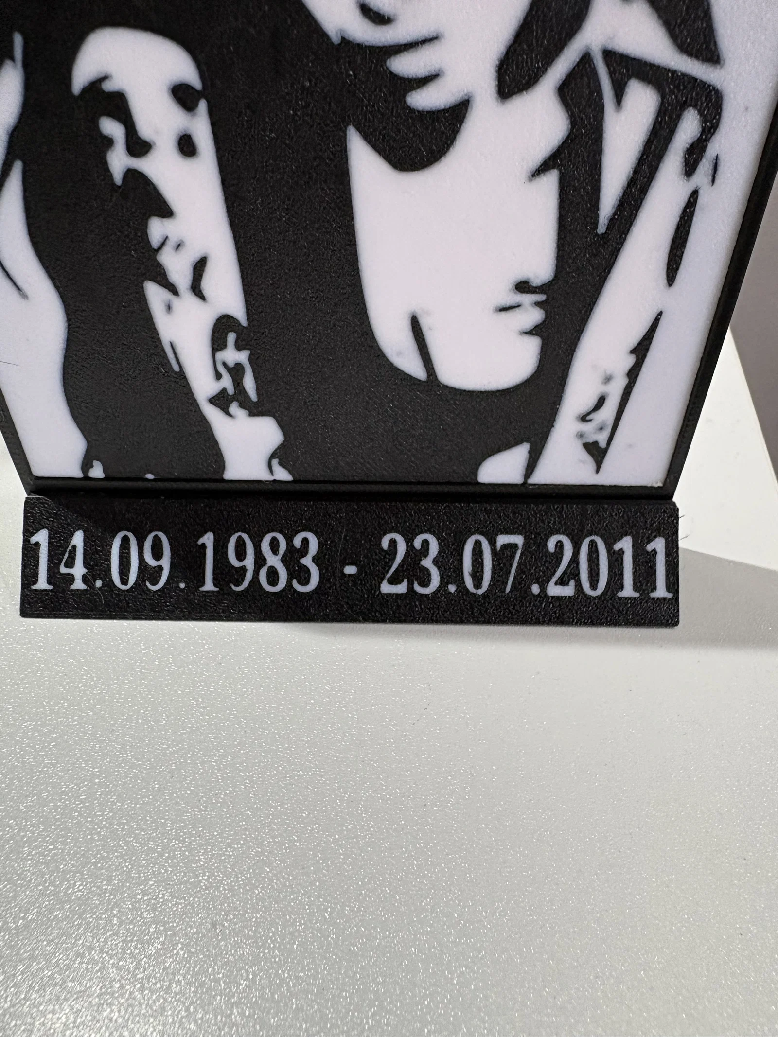 Amy Jade Winehouse (14 tháng 9, 1983 – 23 tháng 7, 2011) là một ca sĩ, nhạc sĩ và nữ doanh nhân người Anh. Cô nổi tiếng với chất giọng contralto đặc trưng, những sáng tác giàu cảm xúc mang tính tự truyện, cùng sự pha trộn độc đáo giữa các dòng nhạc như soul, rhythm and blues và jazz. Âm nhạc, phong cách thời trang và đời tư đầy ồn ào đã biến cô trở thành một nhân vật có tầm ảnh hưởng lớn trong văn hóa đại chúng. Bức tranh này nên được in úp mặt xuống bàn in để đạt kết quả tốt nhất. Không cần dùng keo, các chi tiết chỉ cần khớp lại với nhau. Có 3 định dạng ngày tháng khác nhau để bạn lựa chọn. Thông số in: Layer 0.20, 2 tường, Infill 15%. File bao gồm: 3mf File, STL File. Chất liệu khuyên dùng: Black PLA, White PLA.
